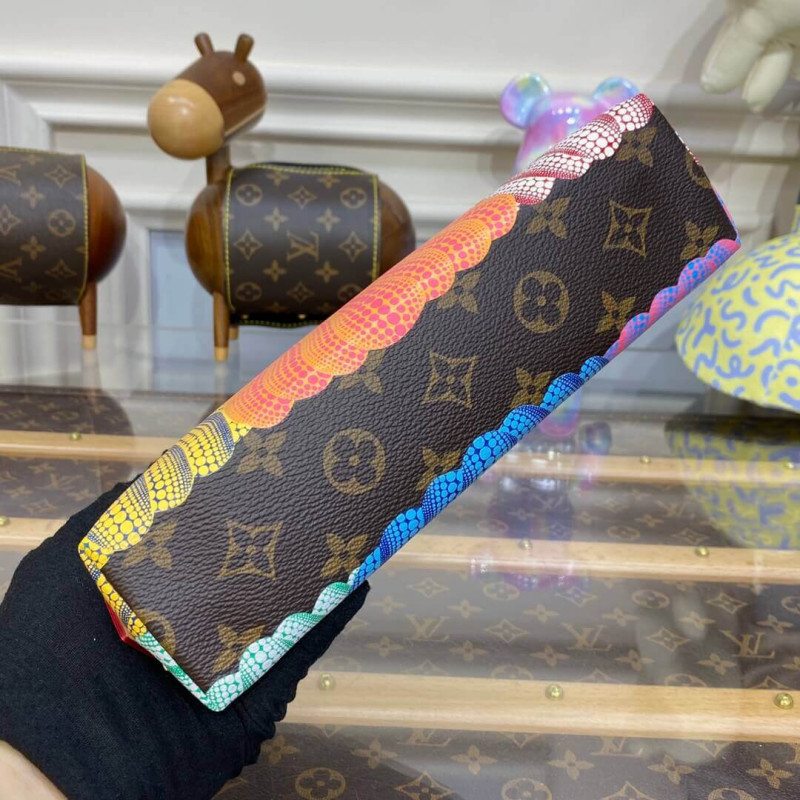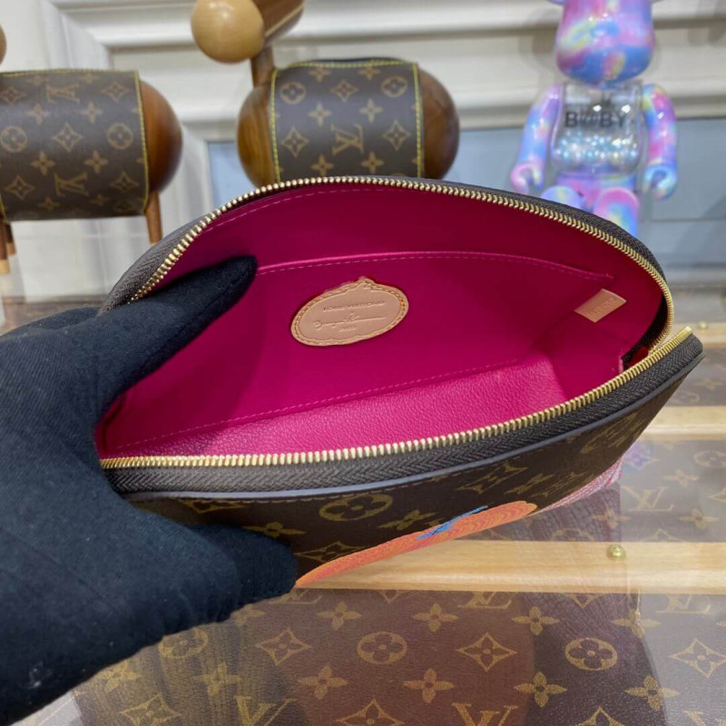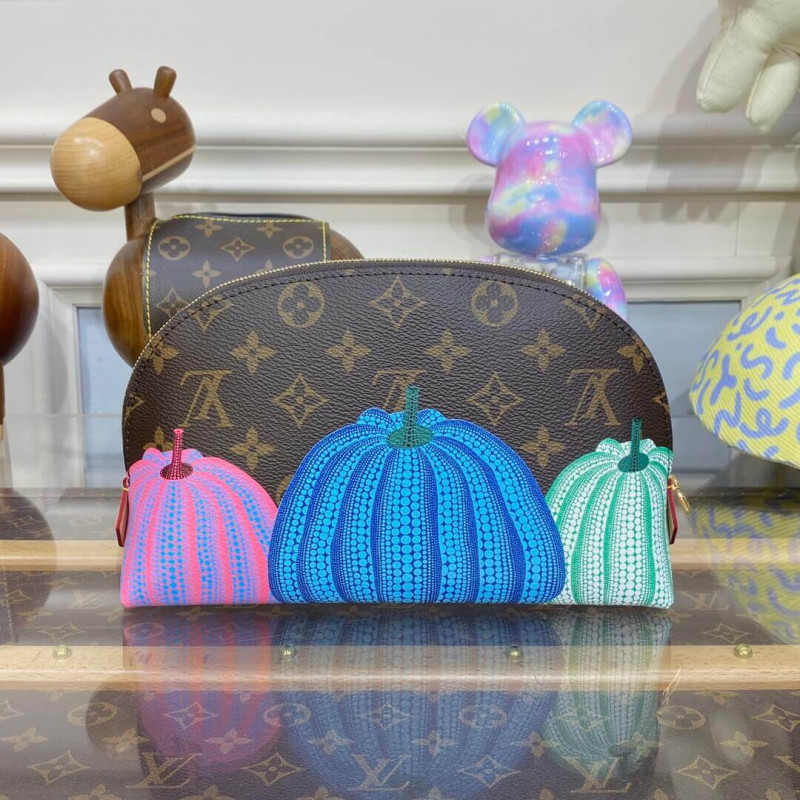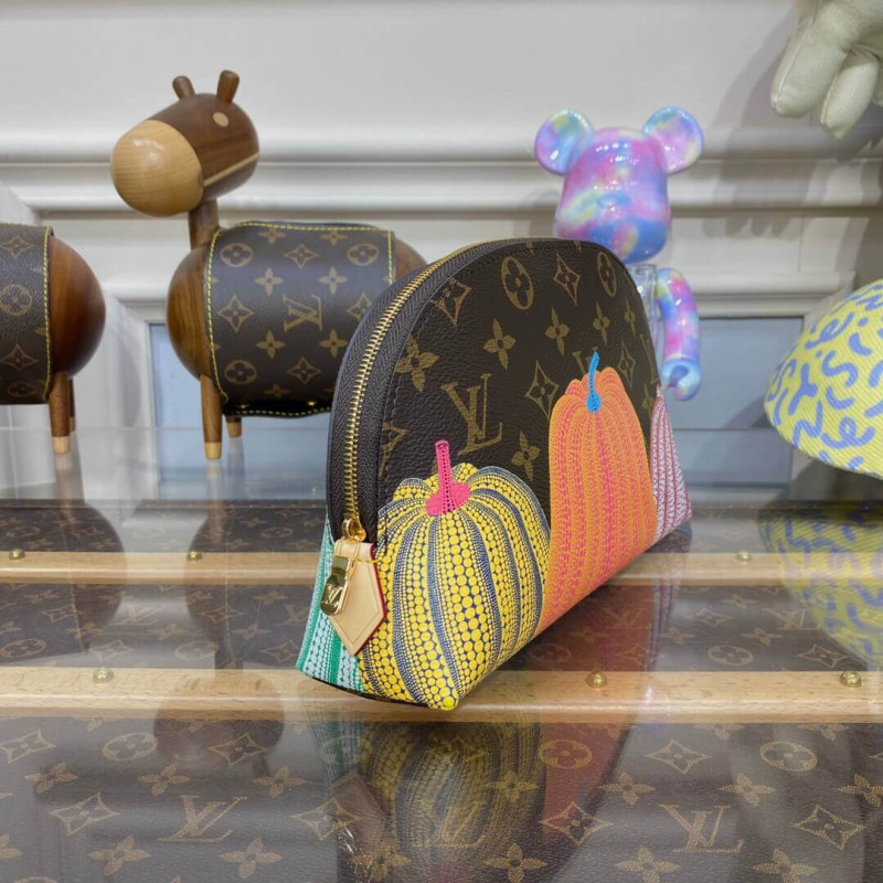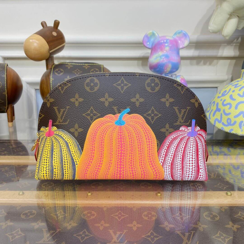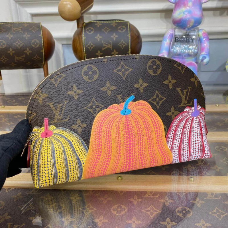 For the Louis Vuitton x Yayoi Kusama collection, the LVxYK Pochette Cosmétique GM pays homage to the work of the world-class Japanese artist with a print inspired by her emblematic pumpkins. Kusama uses pumpkins in her paintings, sculptures and installations as an expression of warmth and joyful optimism. For this cosmetics pouch, they appear in bright colors on Monogram canvas, adding a creative touch to an ultra-functional accessory.