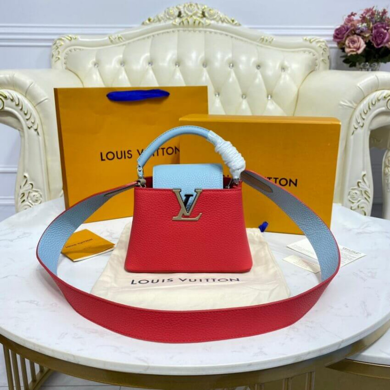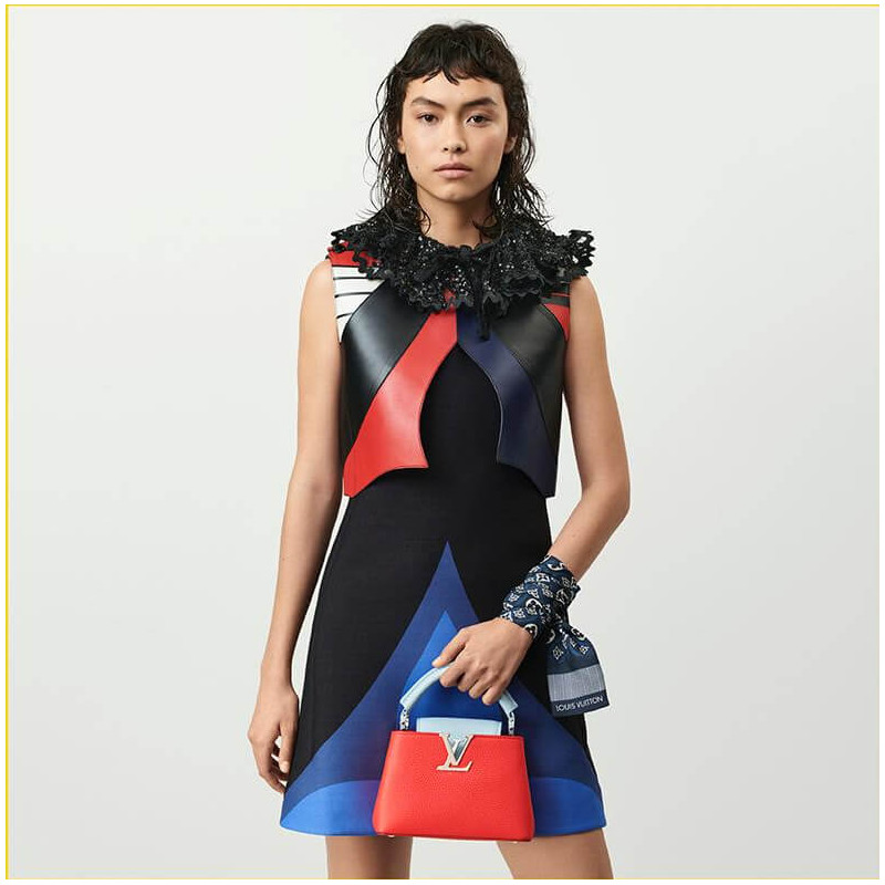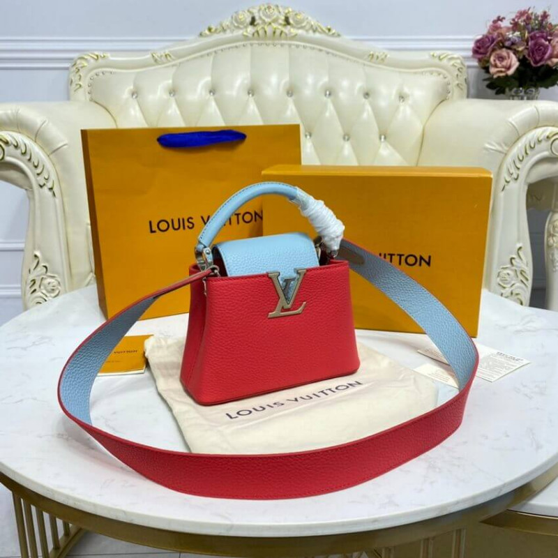 Fashioned from grained Taurillon leather, the Capucines Mini handbag comes in a colorblock treatment where the top handle and flap perfectly complement the color of the rest of the bag. The LV initials add nuance to the picture. The removable wide strap ensures comfortable shoulder carry.