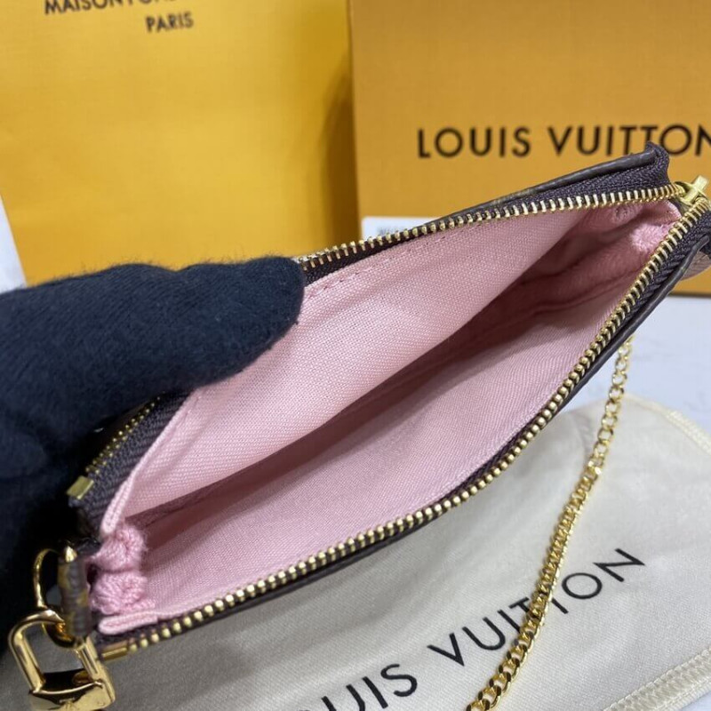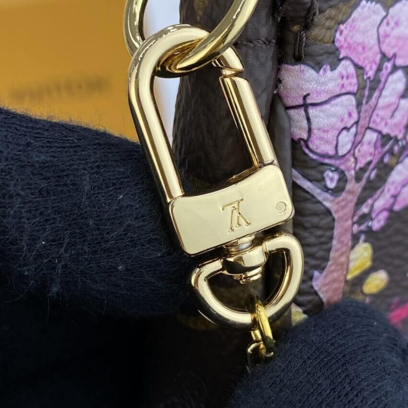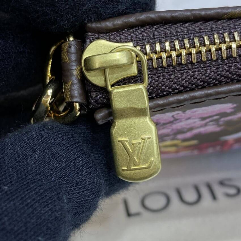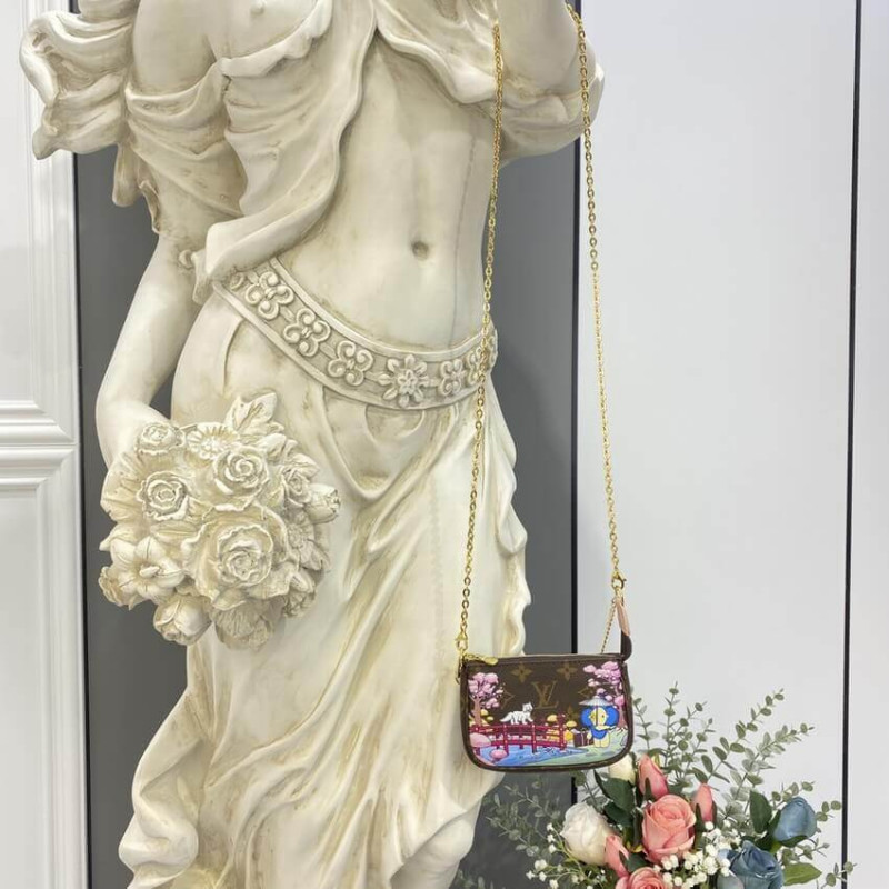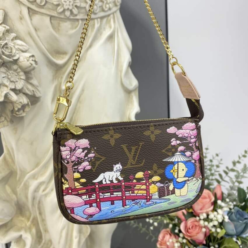 The Mini Pochette Accessoires is made from Monogram canvas and decorated with a print of Vivienne, the House mascot, in a Japanese garden. She stands under a Wasaga umbrella whilst a curious white cat looks on. The pouch’s zip closure protects what’s inside; the chain enables it to be attached to a larger bag.