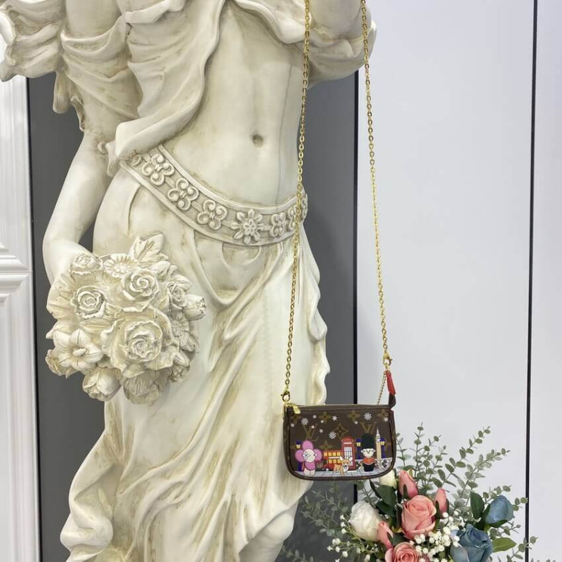 The multifunctional Mini Pochette Accessoires takes on a playful feel in Monogram canvas decorated with a print of the Louis Vuitton mascot: Vivienne. Posing in London with a corgis, a Welsh Guard and the ever-so-famous Big Ben, she evokes the House’s travel heritage as a trunk and luggage maker.