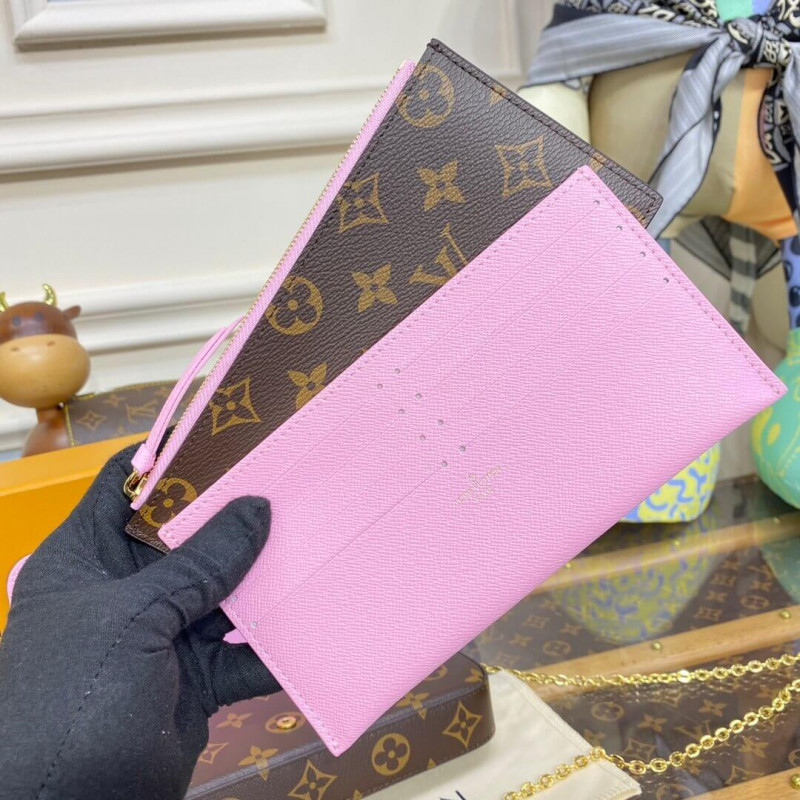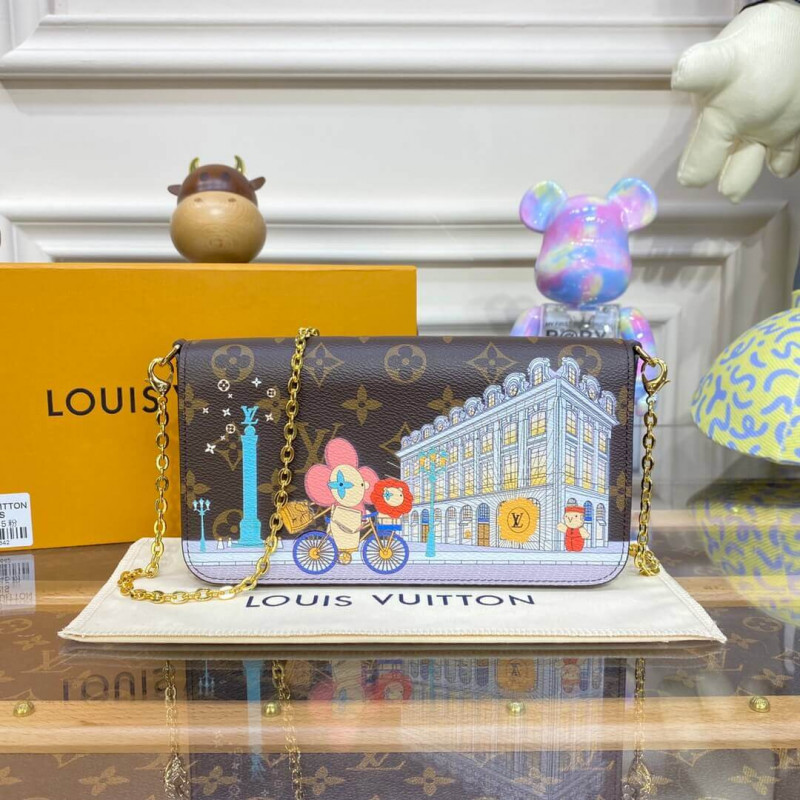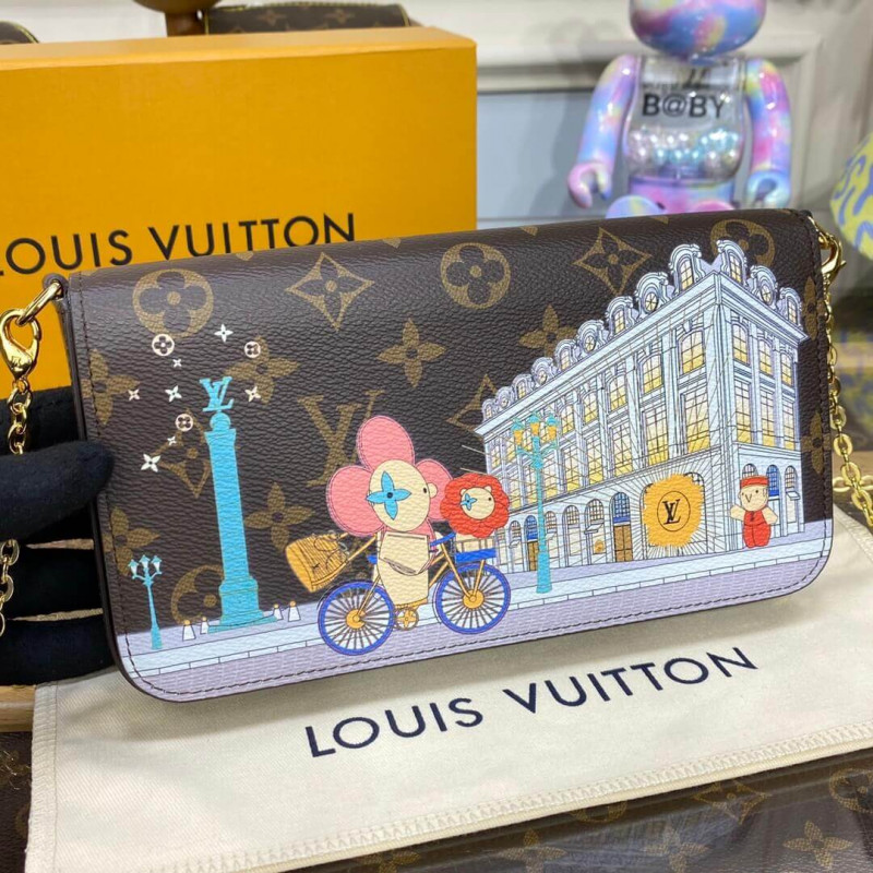 The Felicie Pochette in Monogram canvas is revisited for the Vivienne Holidays 2022 collection, which celebrates the spirit of travel. An exclusive print shows Louis Vuitton s Vivienne mascot in front of the Paris boutique, with the famous Place Vend?me column in the background. An ideal gift, this versatile, collectible pouch is complemented by a pink textile lining.