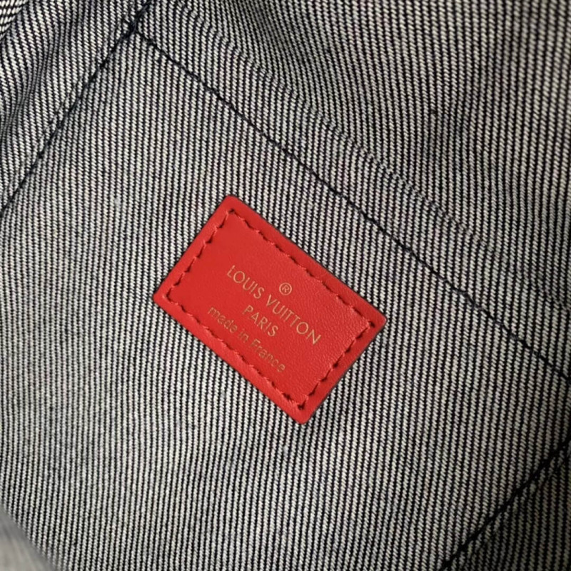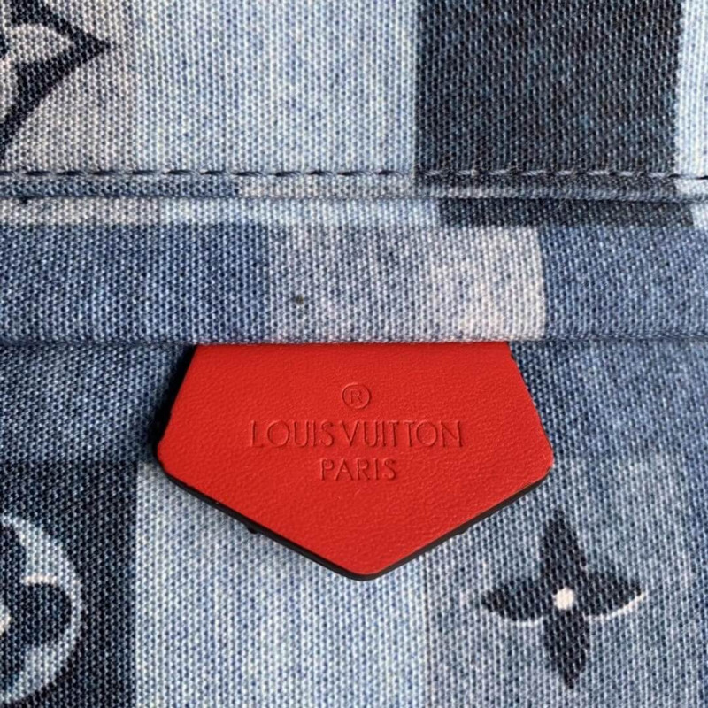 This Palm Springs Mini backpack sports a unique Patchwork pattern composed of Damier and Monogram motifs. Printed directly on the bag’s canvas body, both raw and washed denim blue create a surprising illusion of texture. Red leather straps and trim bring a dash of vivid contrast to the mix.