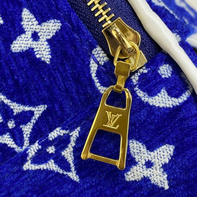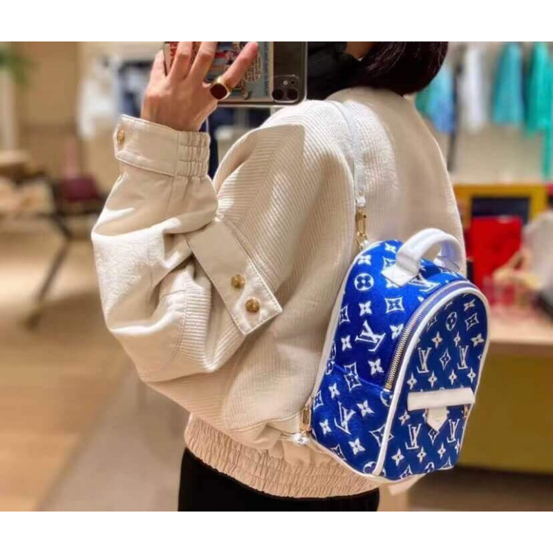 Fashionable and sporty, the Palm Springs Mini backpack hails from the LV Match collection, inspired by the world of Grand Slam tennis tournaments. Made from a velvety Monogram jacquard woven with eco-friendly chenille yarns, the bag features contrasting white leather trim and gold-finish hardware.