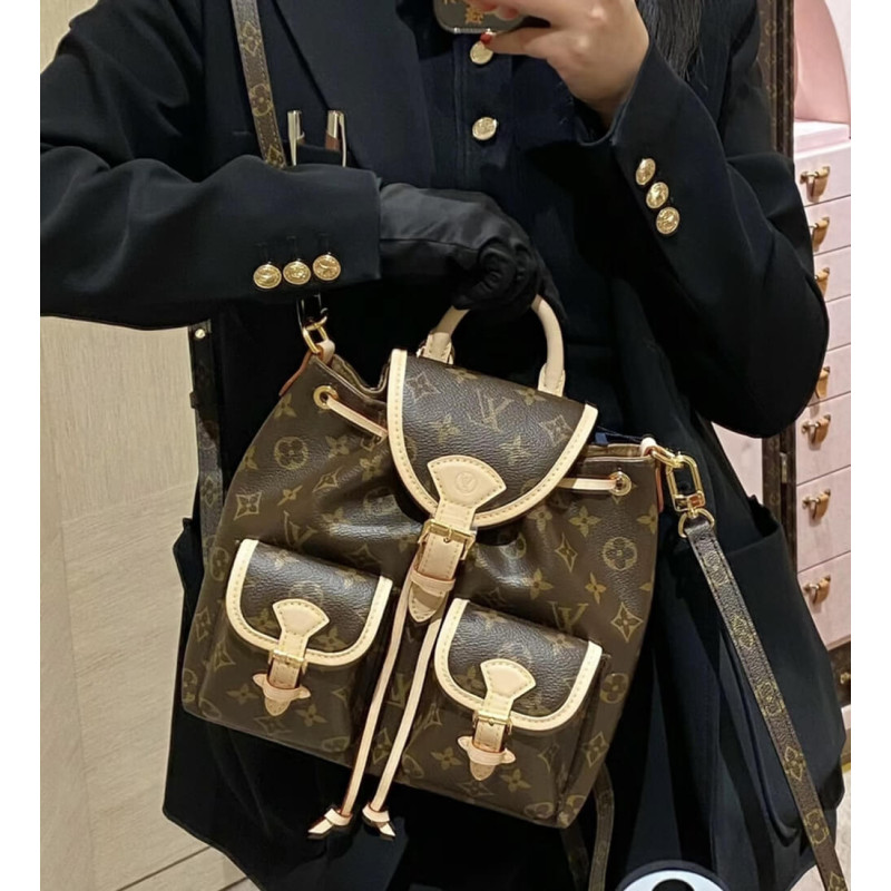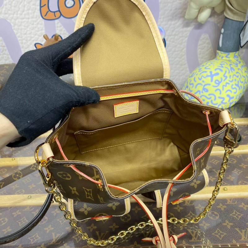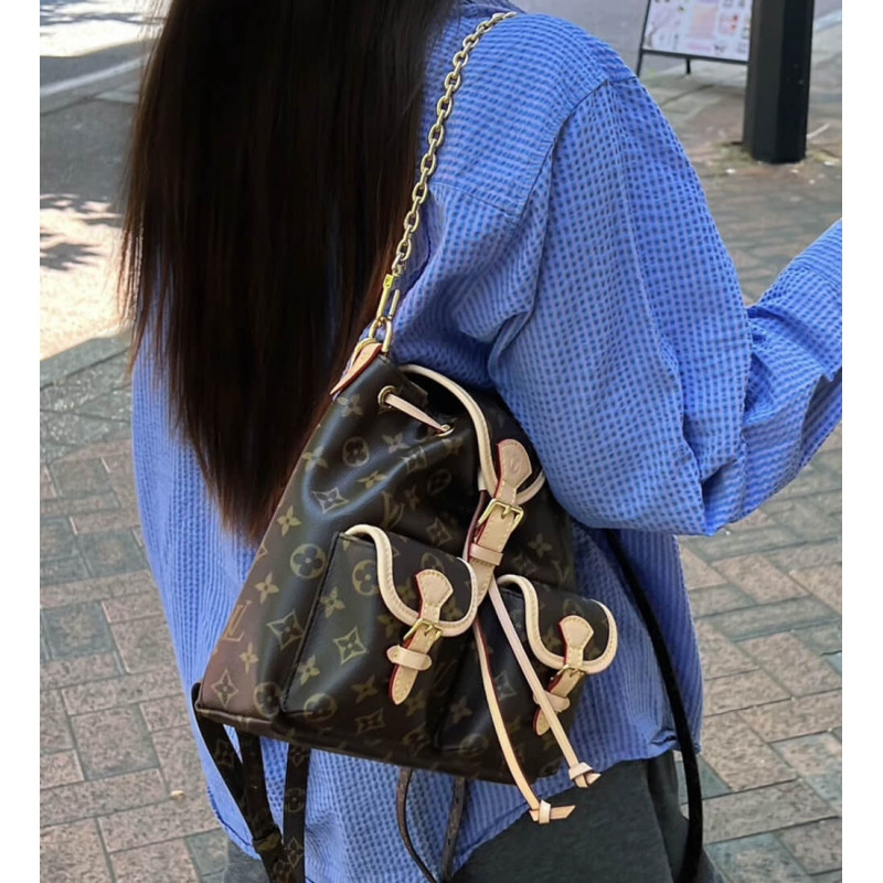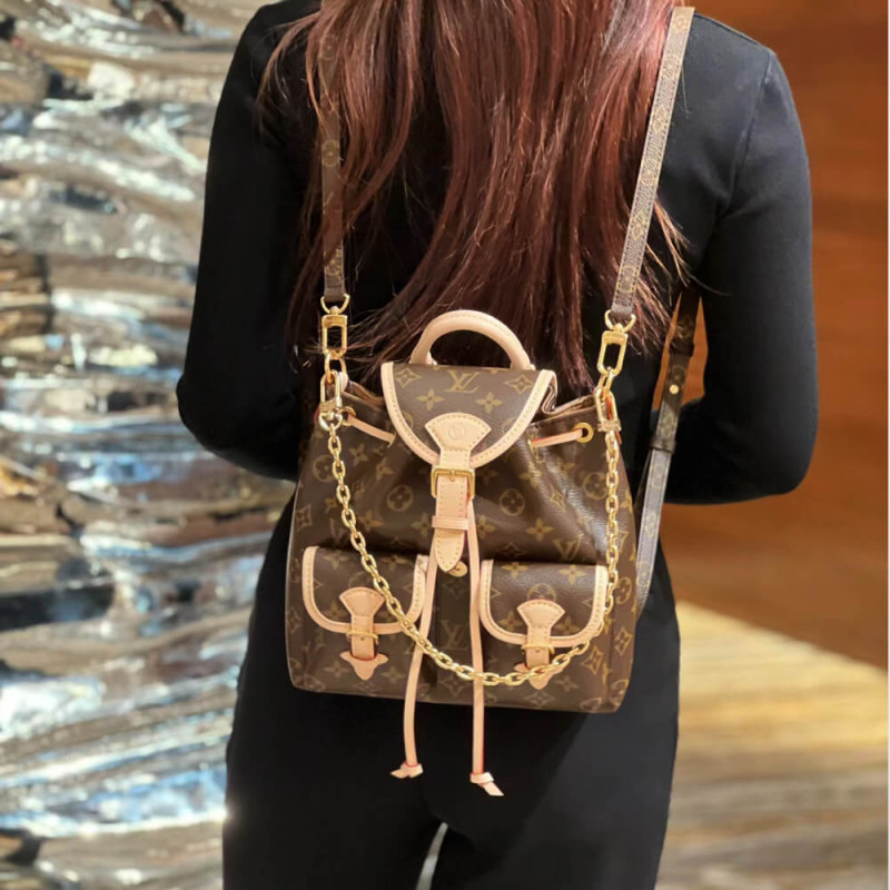 Made from Monogram canvas with leather trim, the super-cute, super-functional Excursion PM backpack has a design clearly influenced by the world of hiking. The main compartment closes with an adjustable sliding buckle and there are two pockets with buckles on the front. A gold-color chain, in addition to the top handle, enable different carries.