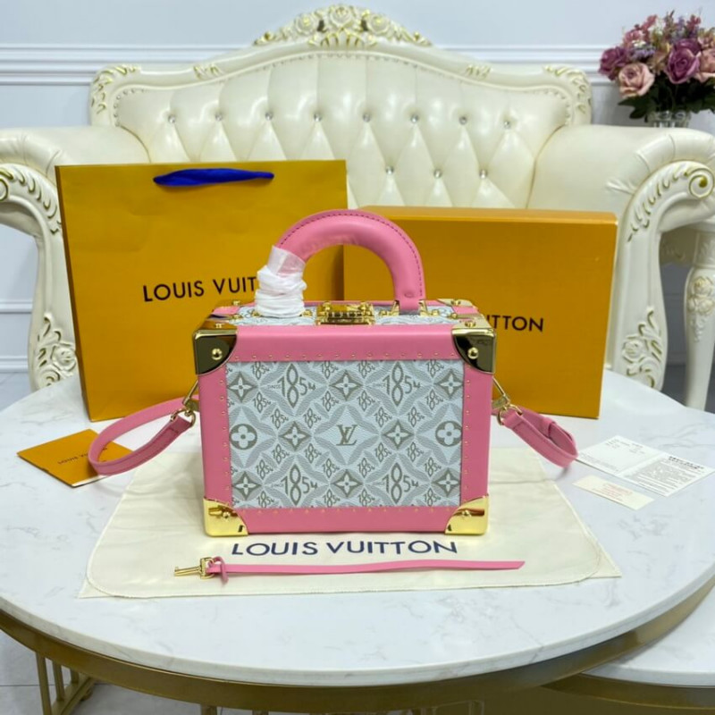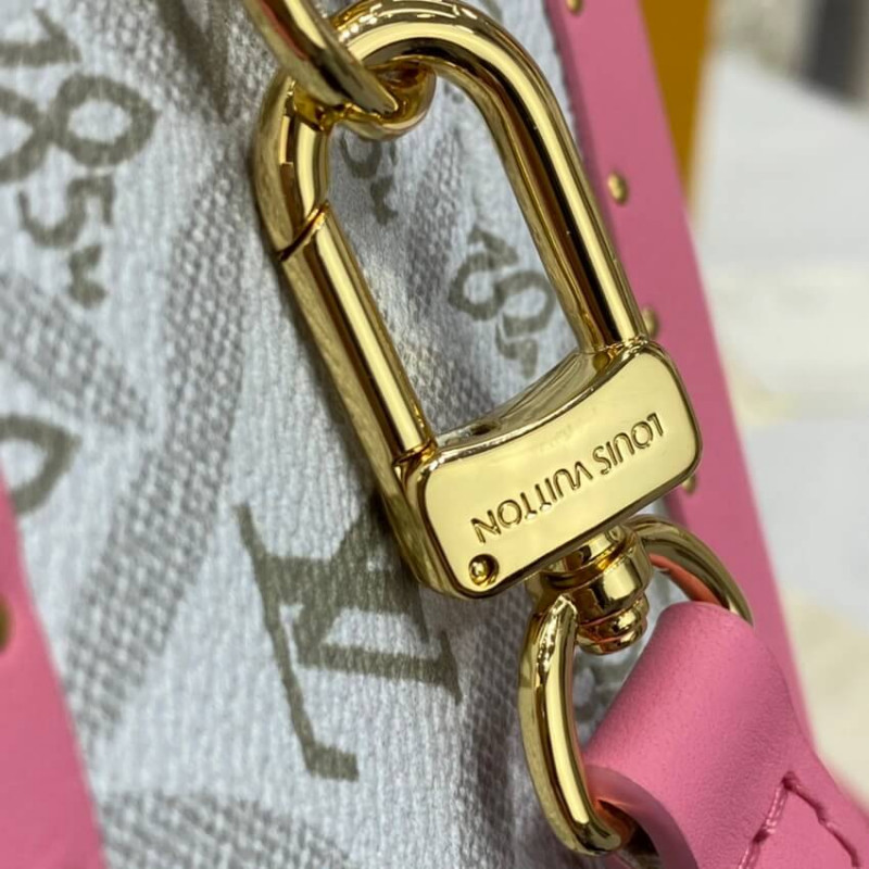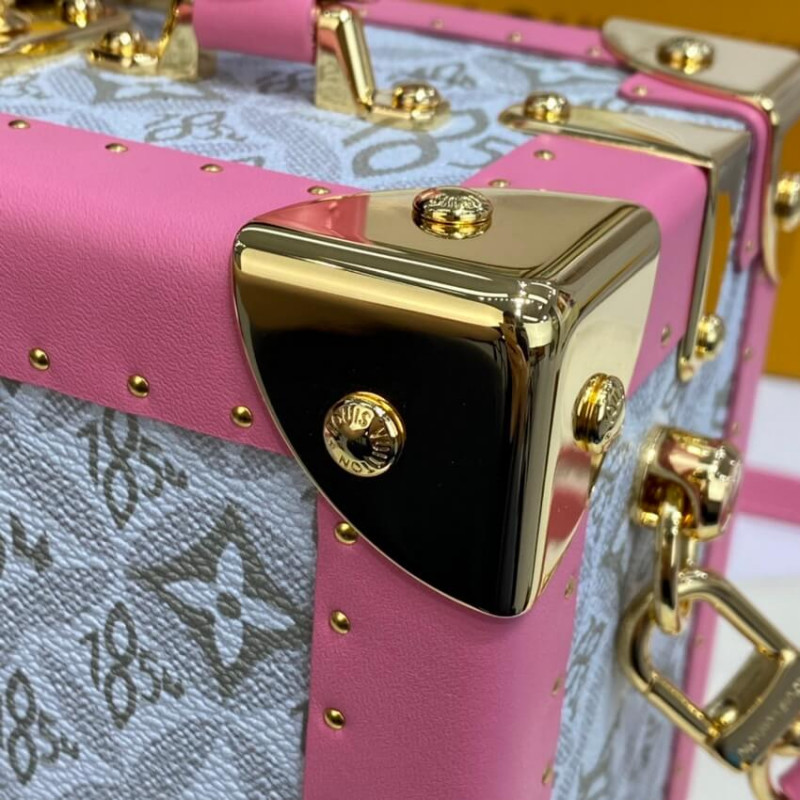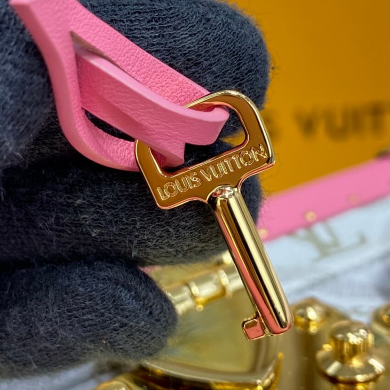 For Spring Summer 2021 collection, Nicolas Ghesquière & Johnny Coca offer a new wearable Hardsided : the Valisette Trésor. The shape and size of the Valisette Trésor are inspired from the iconic and historical Coffret Trésor 20, a small box designed to store jewels or any precious treasure, which has been twisted in order to create a wearable, feminine shape. The Valisette Trésor is a wearable, feminine bag with every functionality of a traditional leather good while being a true Hardsided (studded lozines, S-Lock with key).