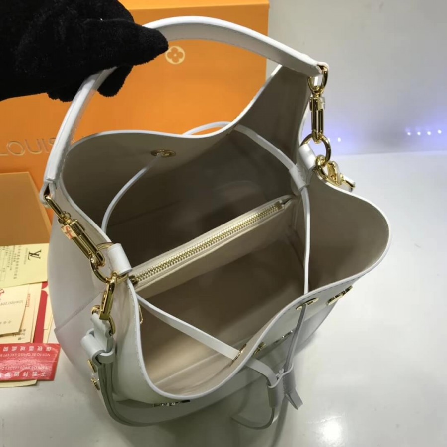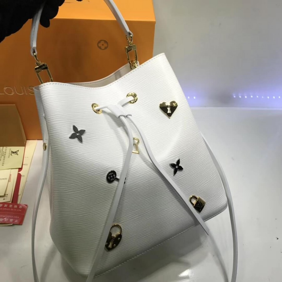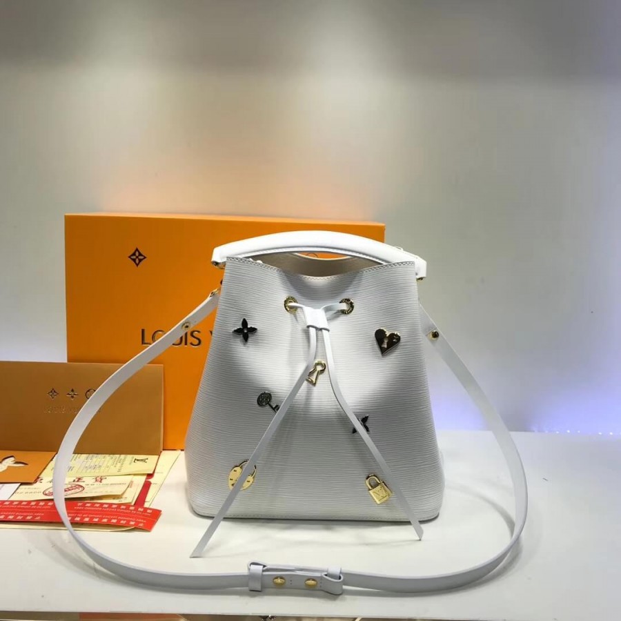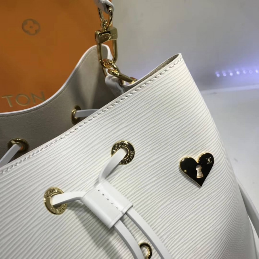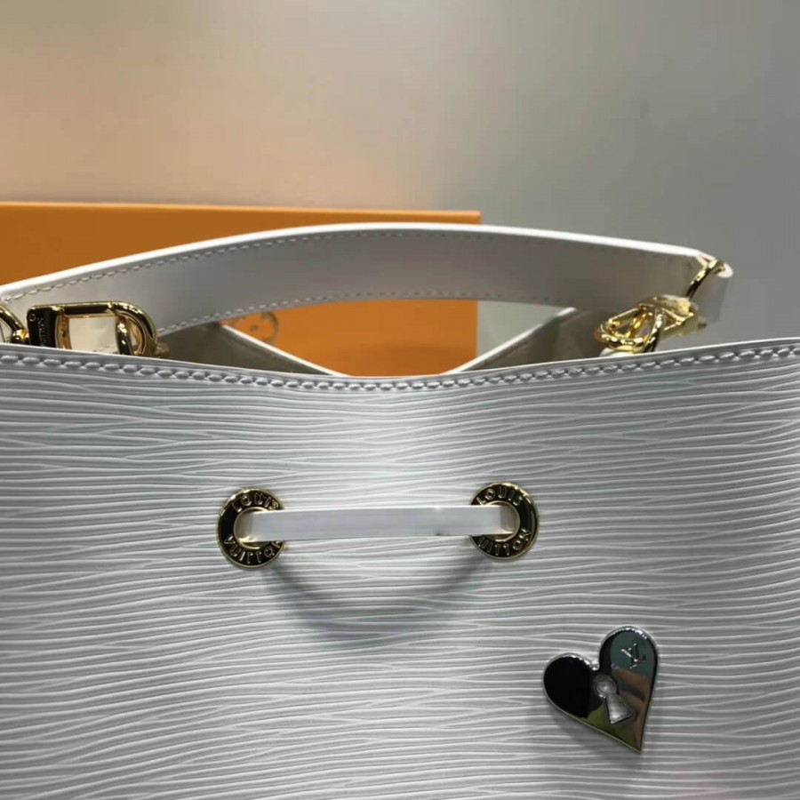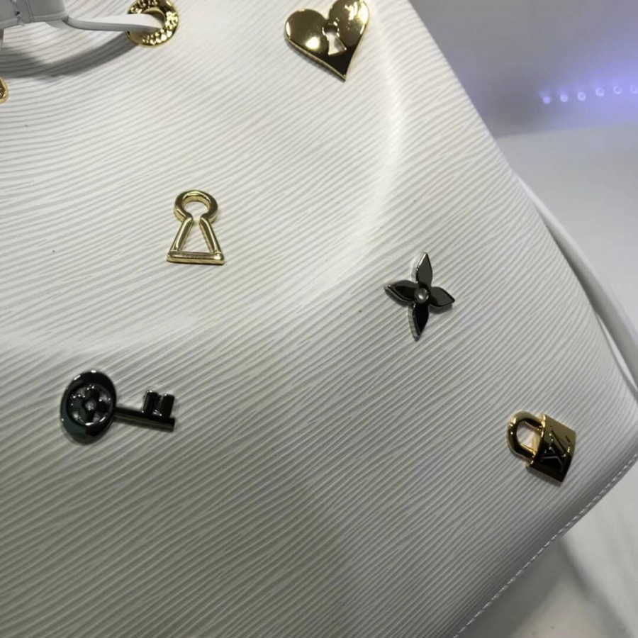 This Love Lock NéoNoé bucket bag is part of a charming capsule designed for Spring 2019. Fashioned from signature Epi grained leather, it is embellished with romantic talismans that are also symbols of the House: locks, keys and Monogram Flowers. The Love Lock theme plays out on selected handbags and leather goods this season. Definitely collectible!