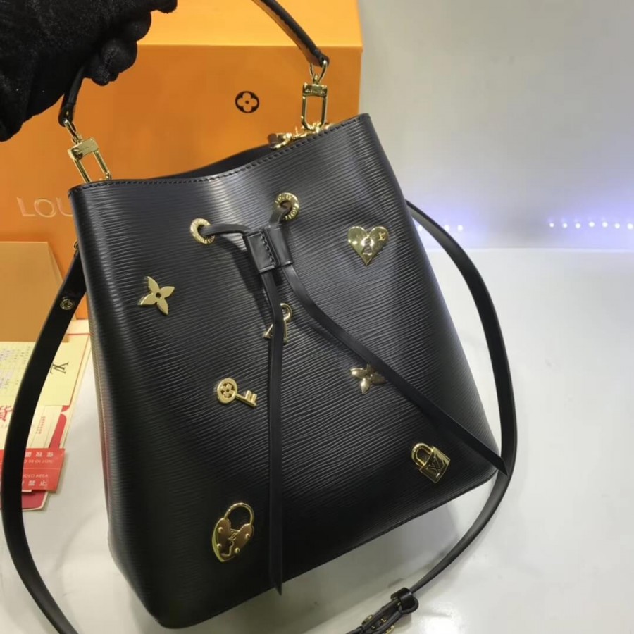 This Love Lock NéoNoé bucket bag is part of a charming capsule designed for Spring 2019. Fashioned from signature Epi grained leather, it is embellished with romantic talismans that are also symbols of the House: locks, keys and Monogram Flowers. The Love Lock theme plays out on selected handbags and leather goods this season. Definitely collectible!