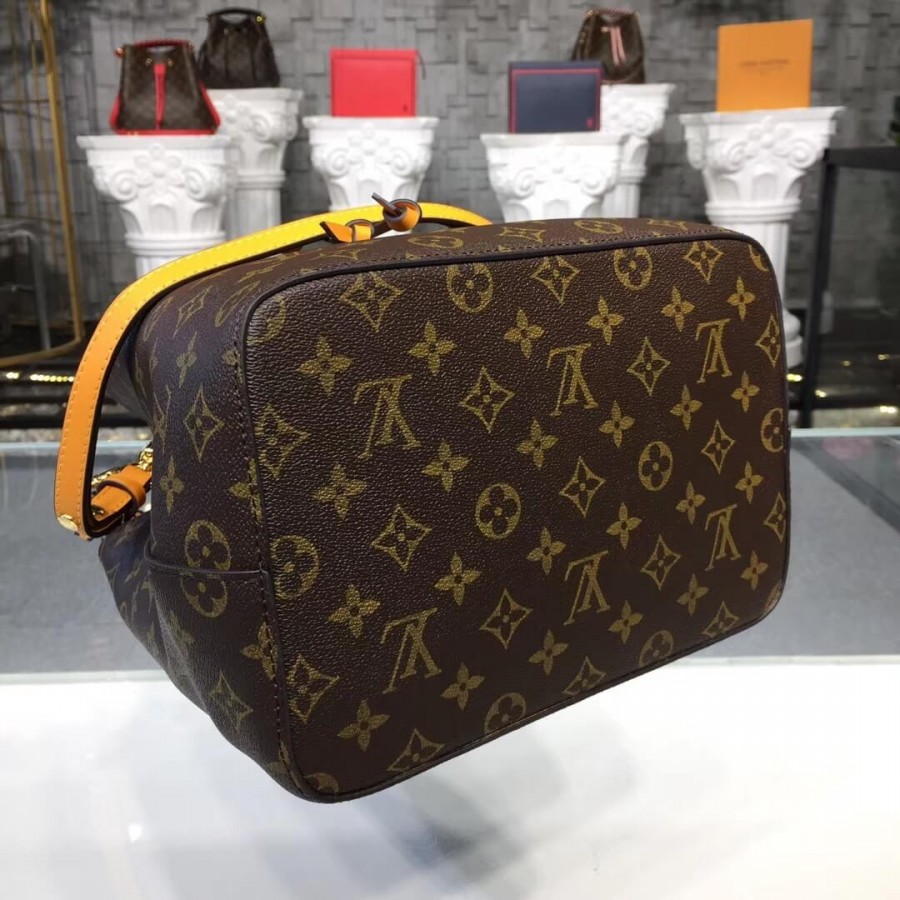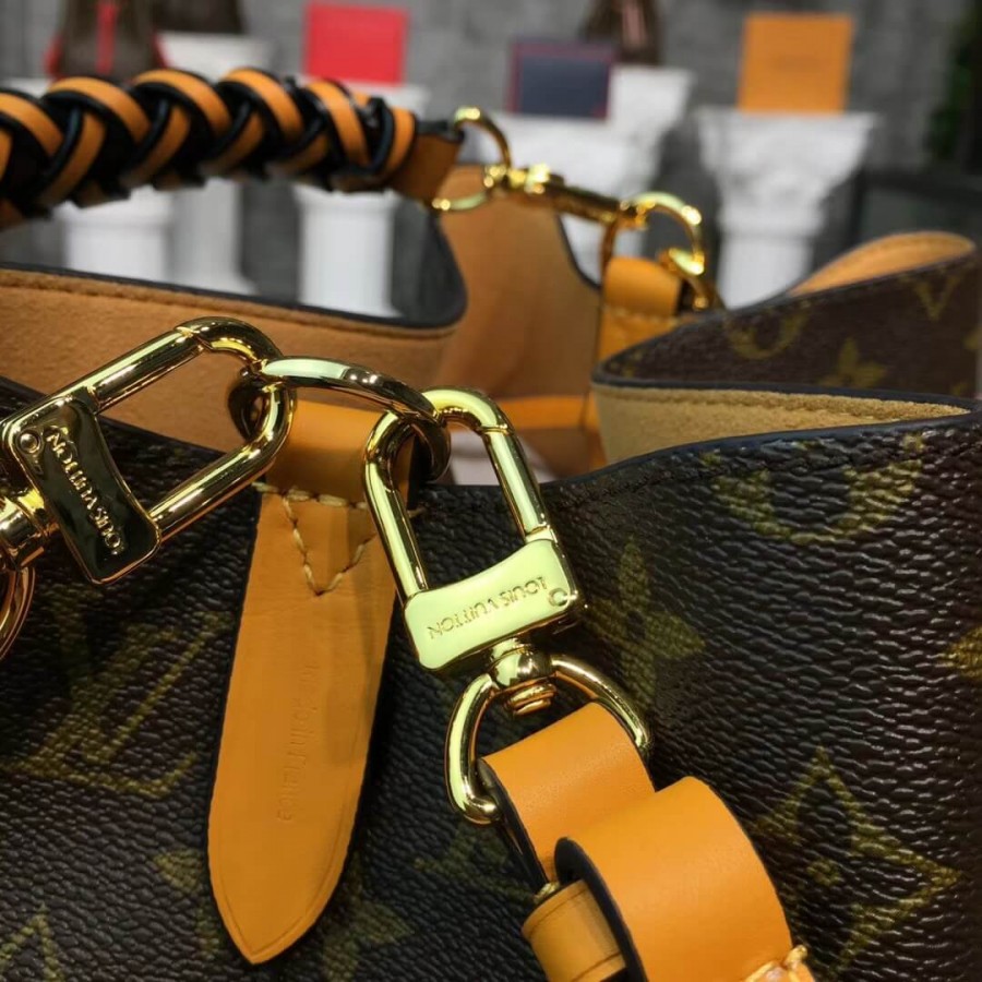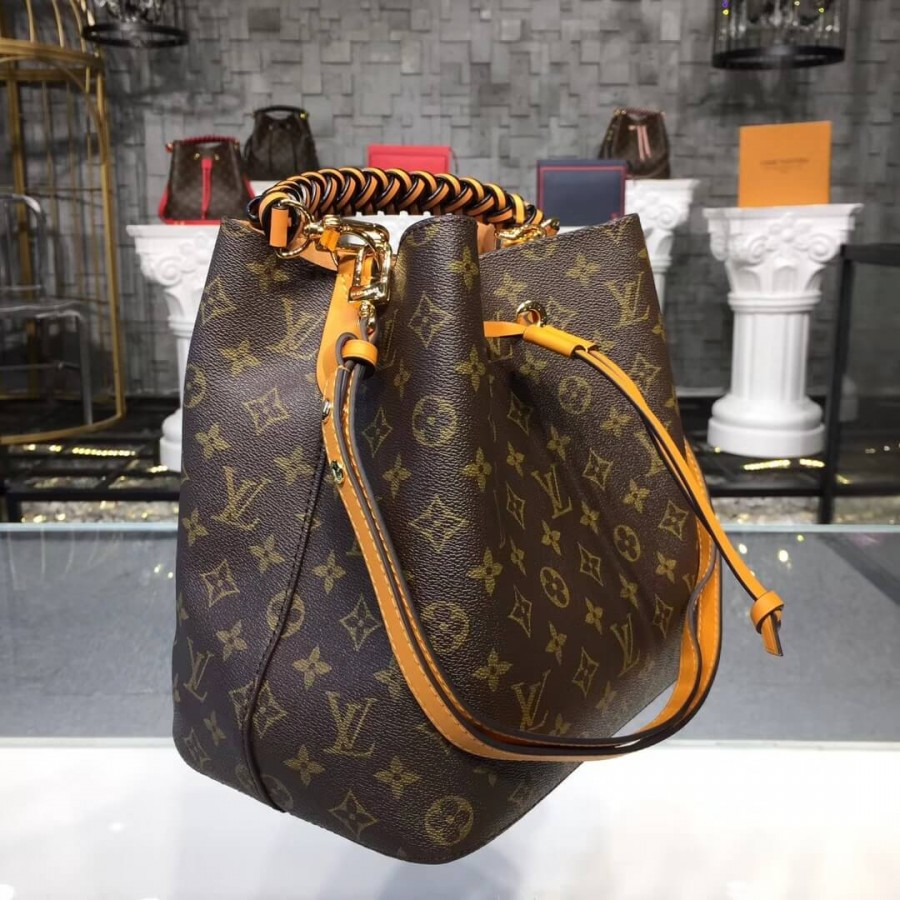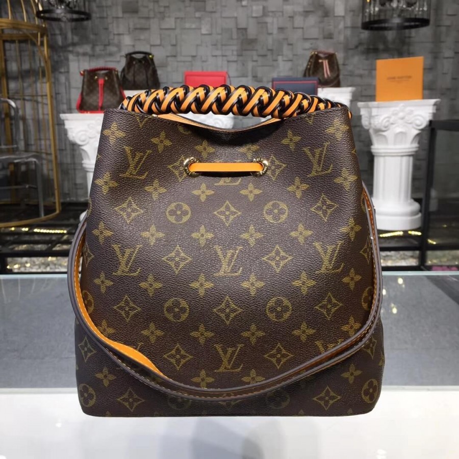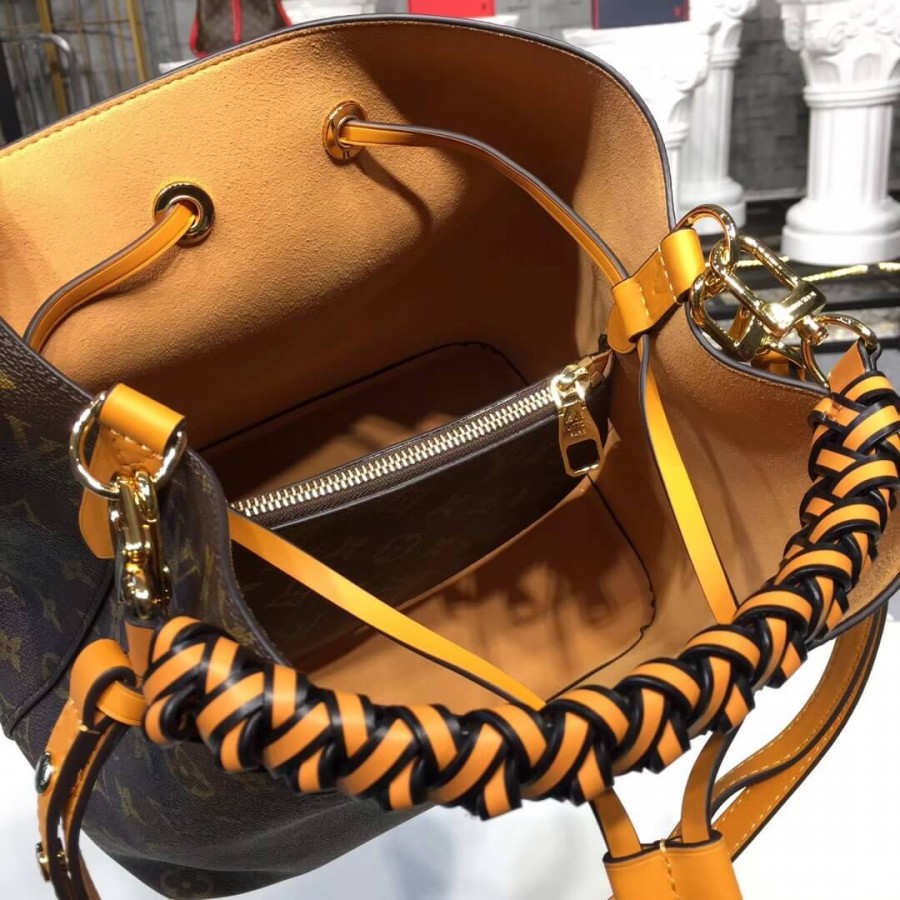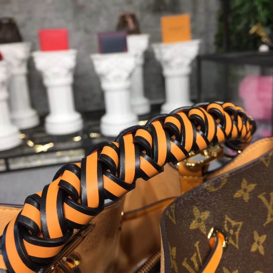 The NéoNoé bucket bag traces its pedigree to a 1932 design by Gaston-Louis Vuitton. This season it is updated with a finely crafted braided handle, woven from colored leather strips and edge-dyed by hand. Made of supple Monogram canvas, this model features coordinating leather laces and an adjustable cowhide strap.
