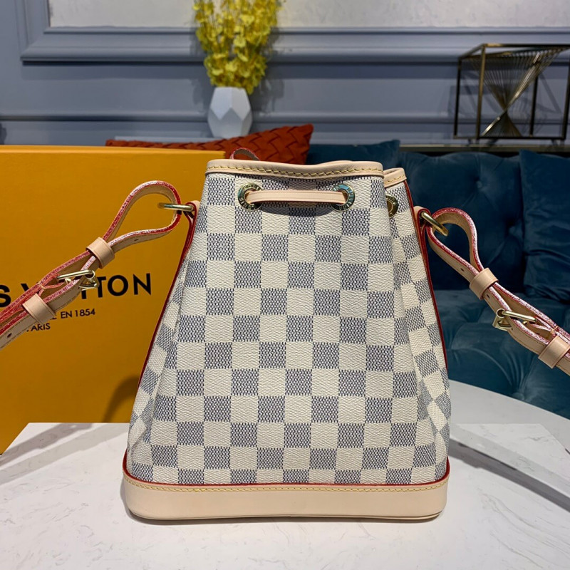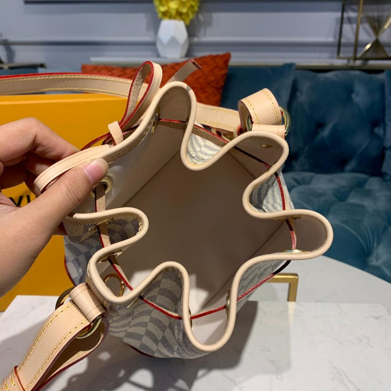 The Noé BB bucket bag harks back to a design from 1932. A Champagne producer asked Gaston-Louis Vuitton to develop a sturdy, stylish bag in which he could transport five bottles of bubbly. This charming version in body-friendly Damier Azur canvas retains key features of the original – the iconic shape and drawstring closure – but is made for modern life. The leather strap adjusts for comfortable shoulder or cross-body wear.