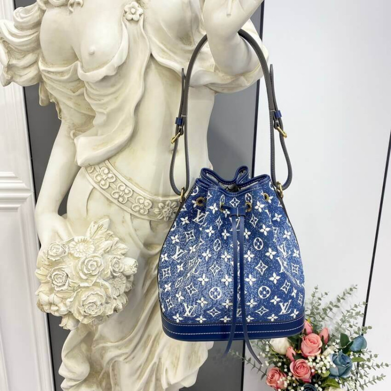 The Petit Noe Bucket bag is made from sand-washed Monogram jacquard denim with leather trim and open-line details. Exquisite configuration contains ample space, drawstring to ensure safe storage, adjustable shoulder strap to achieve shoulder and cross selection.