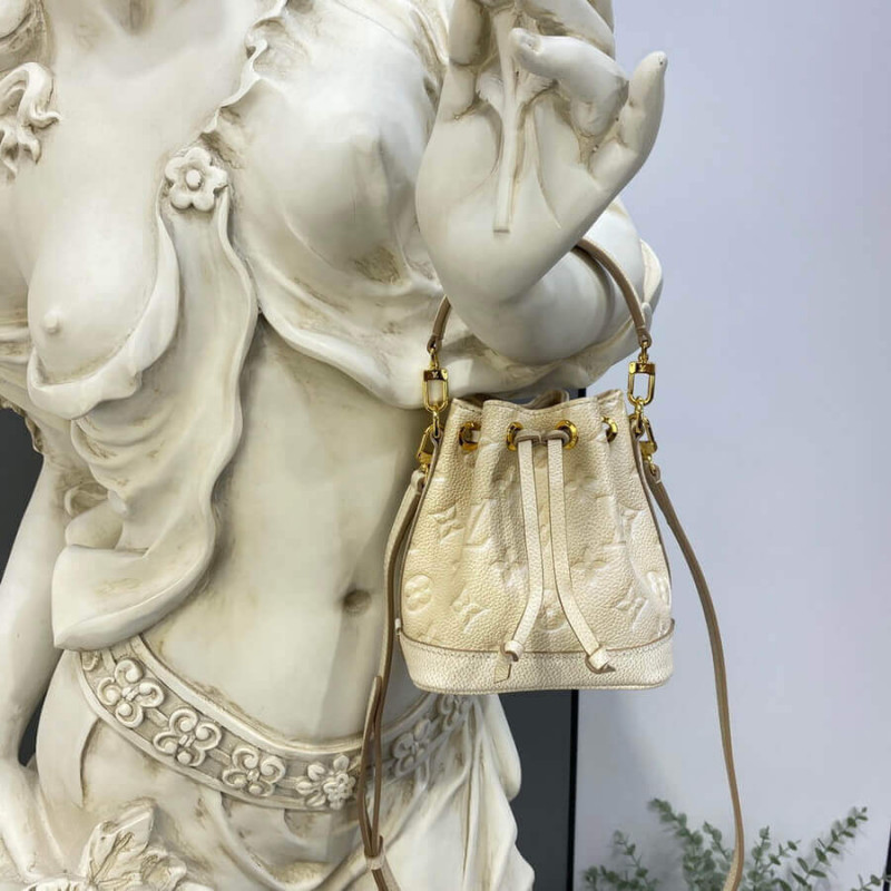 For the Summer Stardust collection, the Nano Noé is reinterpreted in supple Monogram Empreinte leather, embossed with the Monogram pattern. The leather is specially treated to create a shimmering effect inspired by starry skies. With room for everyday essentials, this miniature replica of the iconic Noé bag features a removable handle and a removable, adjustable strap for multiple carry options.