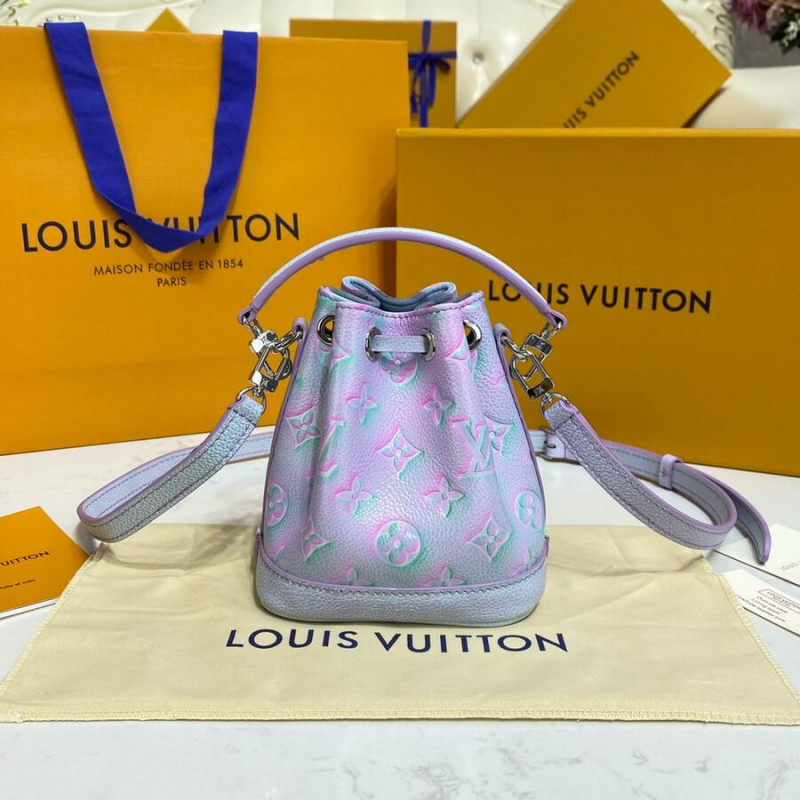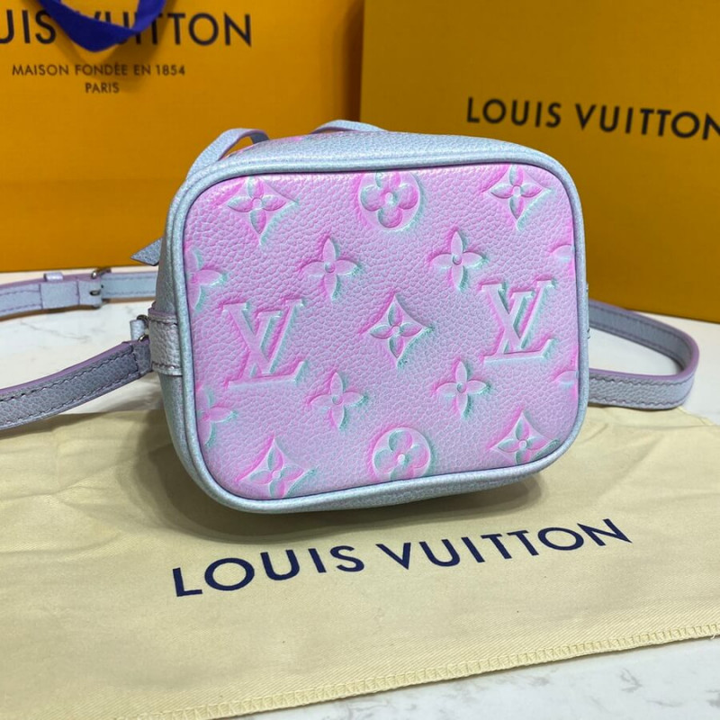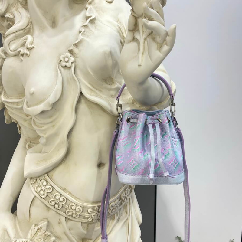 For the Summer Stardust collection, the Nano Noé is reinterpreted in supple Monogram Empreinte leather, embossed with the Monogram pattern. The leather is specially treated to create a shimmering effect inspired by starry skies. With room for everyday essentials, this miniature replica of the iconic Noé bag features a removable handle and a removable, adjustable strap for multiple carry options.