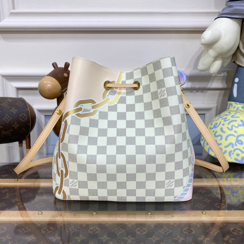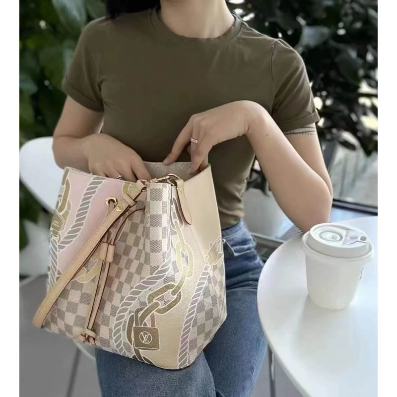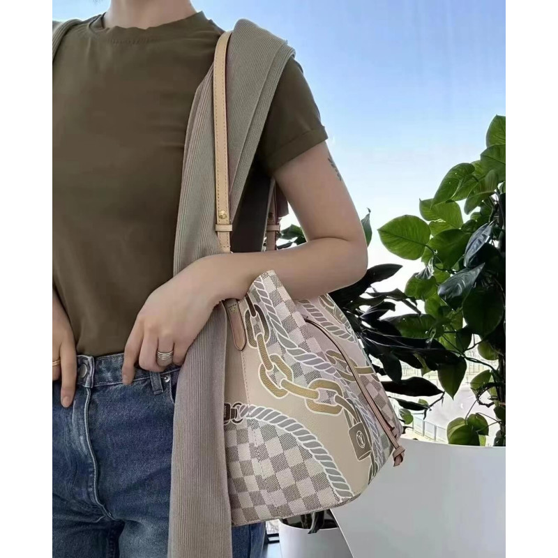 The body-friendly NéoNoé MM bucket bag takes on a summery feel in Damier Azur canvas, livened up with a bold yet feminine nautical print of ropes and chains. The bag’s strap can be adjusted for long- and short-shoulder carry as well as cross-body wear. The inside zipped pocket keeps belongings secure.