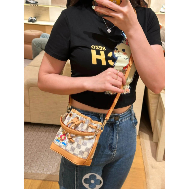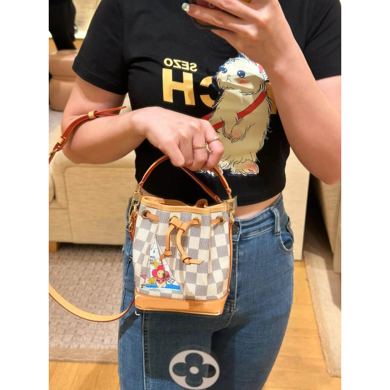 The adorable Nano Noé is crafted from Damier Azur coated canvas, customized with a print of House mascot Vivienne cruising on her sailboat. A miniature version of the emblematic Noé bag, it has convenient drawstring closure, a removable handle, and a detachable, adjustable shoulder strap.