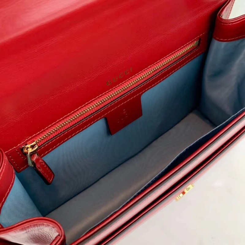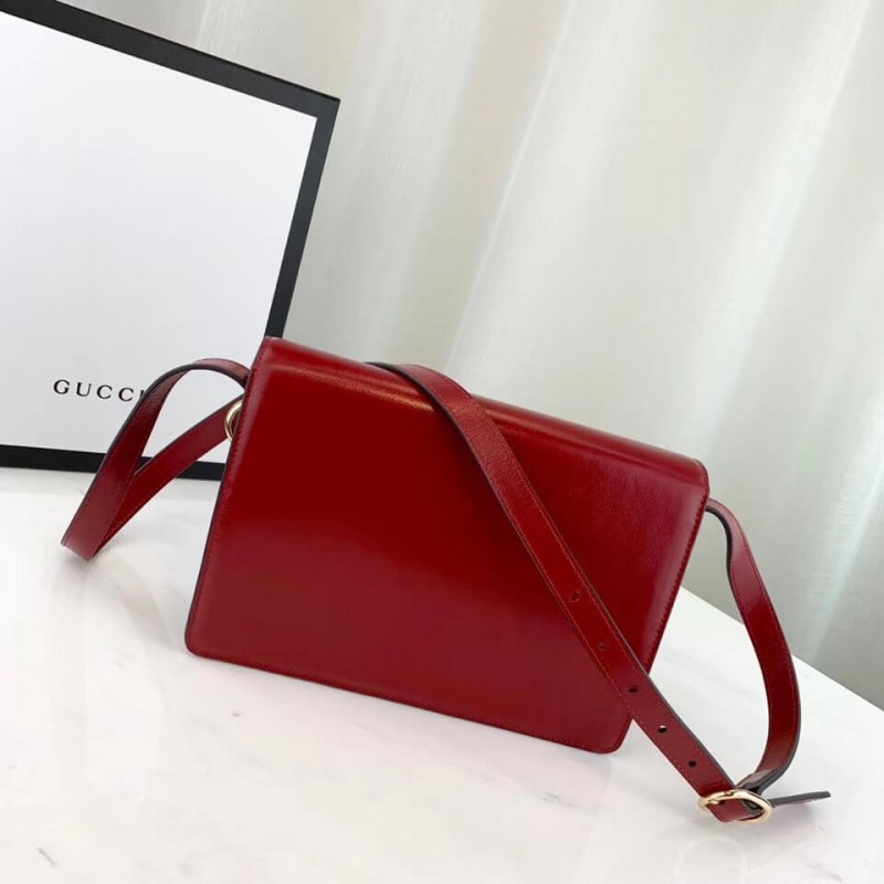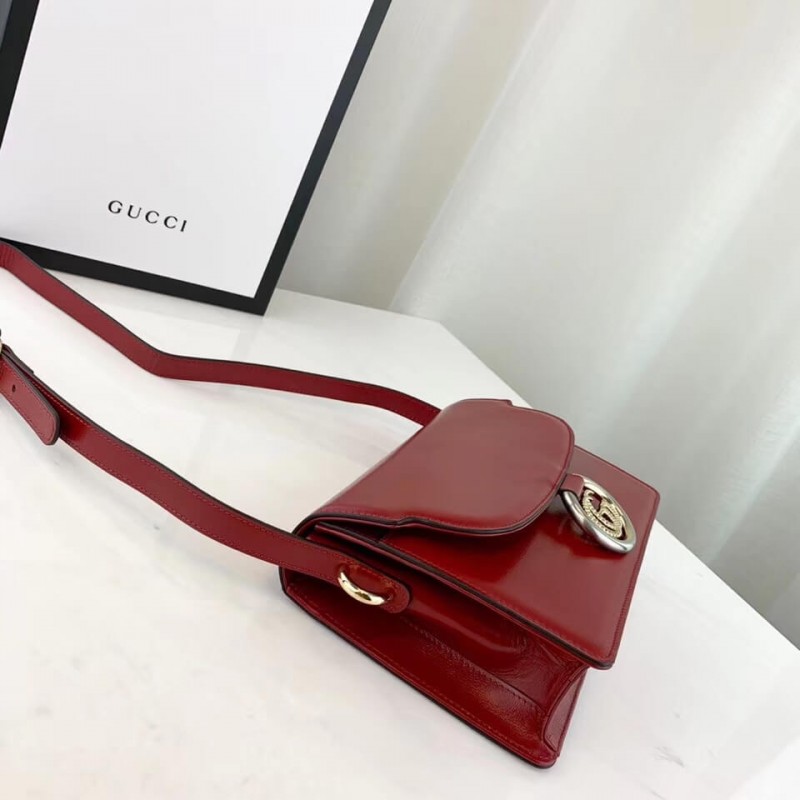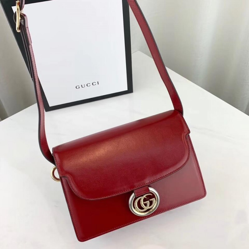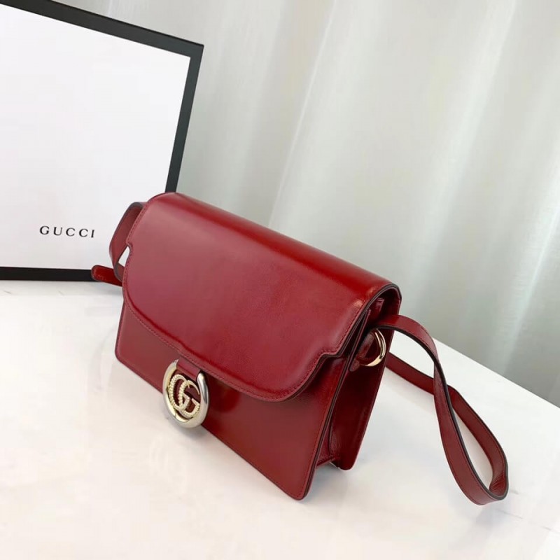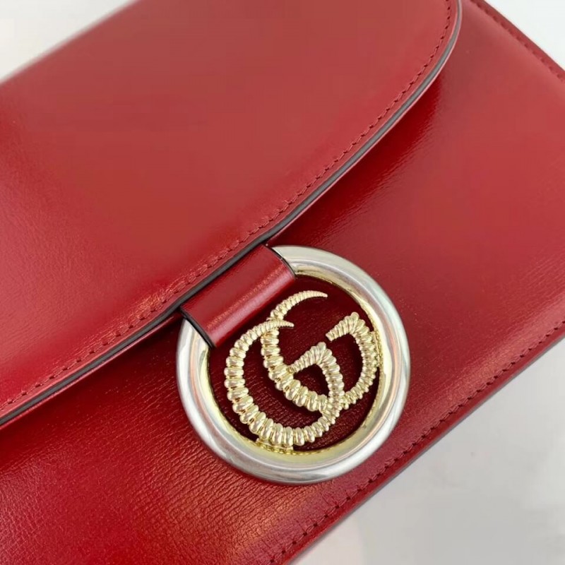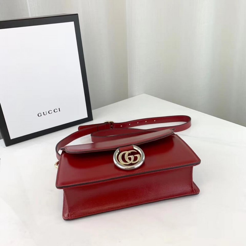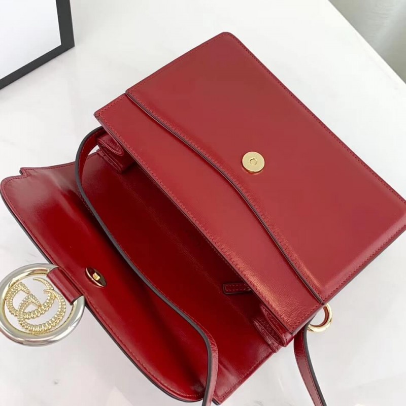 Presented in textured red leather, this small structured shoulder bag introduced for Fall Winter 2019 reintroduces the Double G with a twisted torchon finish surrounded by a ring. The defining detail plays with a mix of shiny and antique gold-toned metals that adds an unexpected element to the signature hardware. The silhouette is completed with an adjustable leather shoulder strap and a flap closure with a hidden pocket detail.