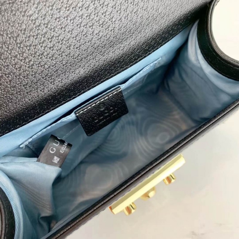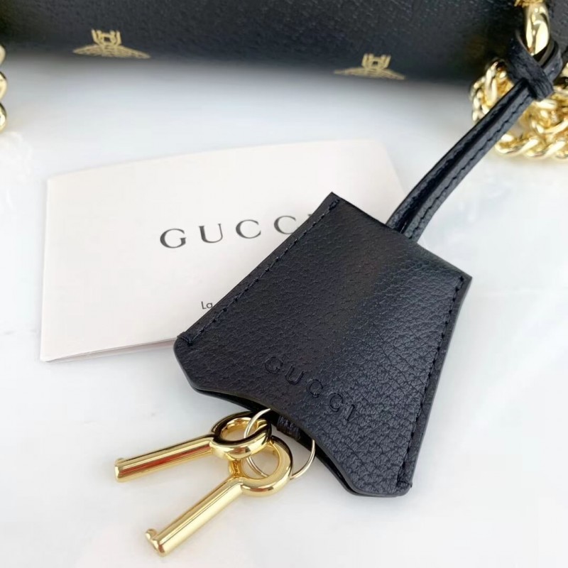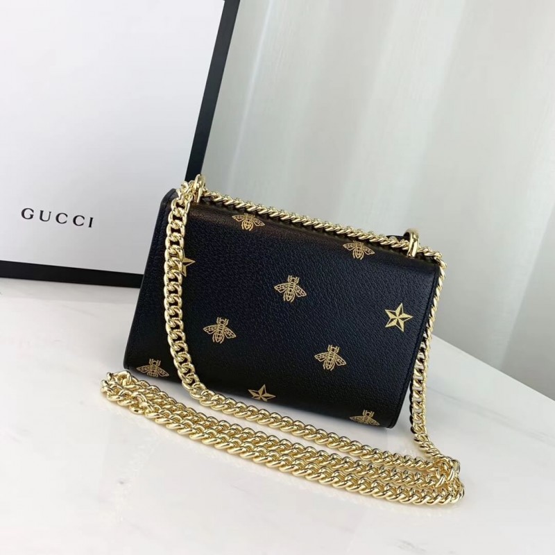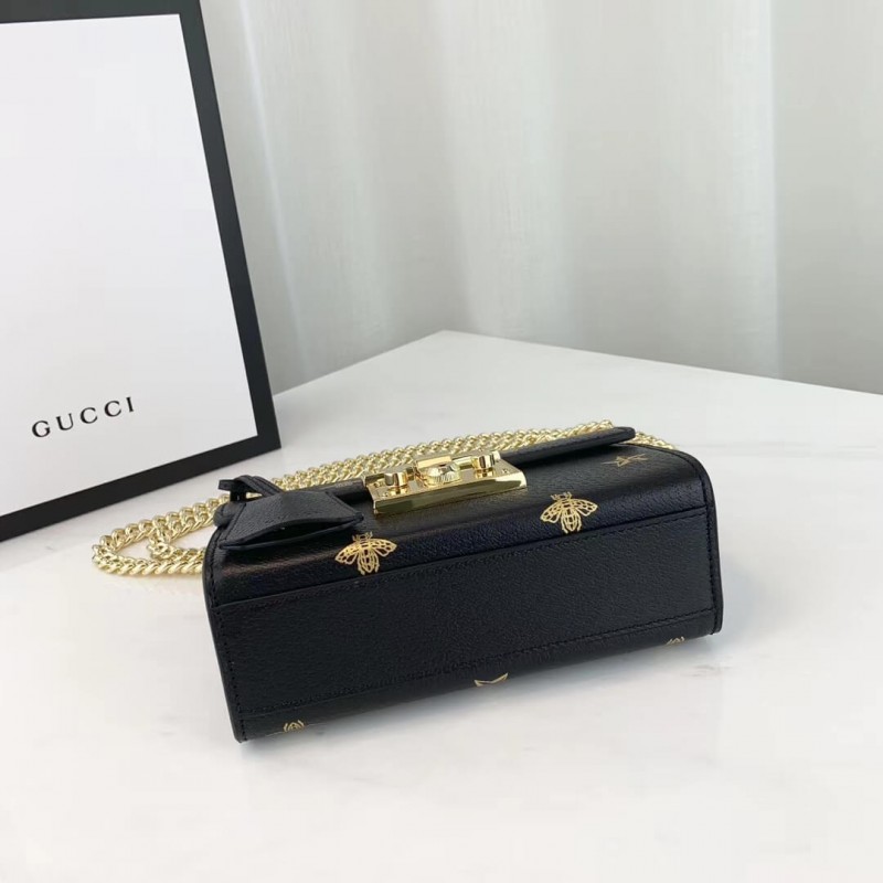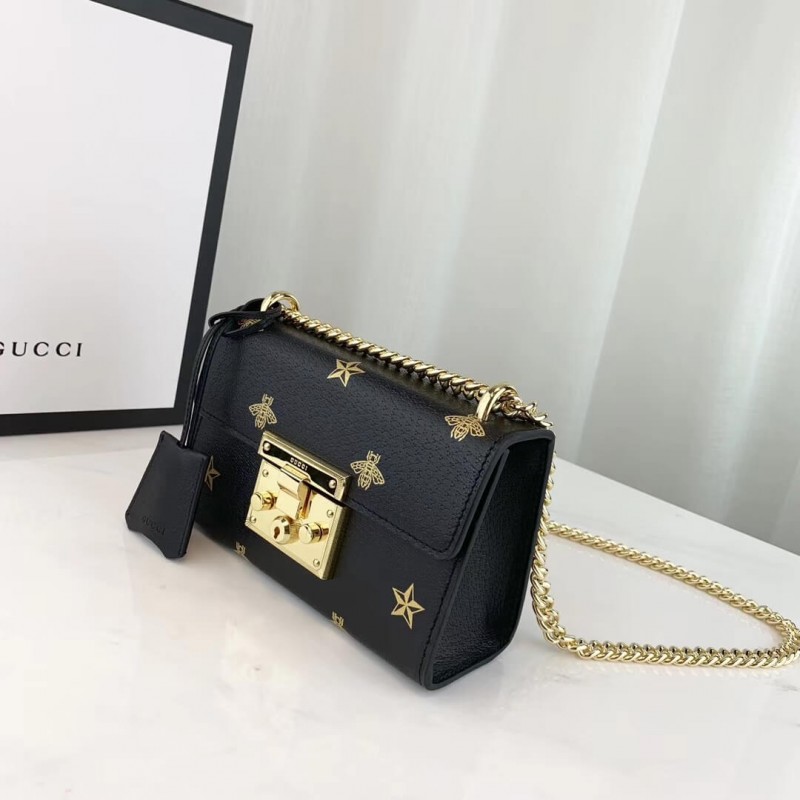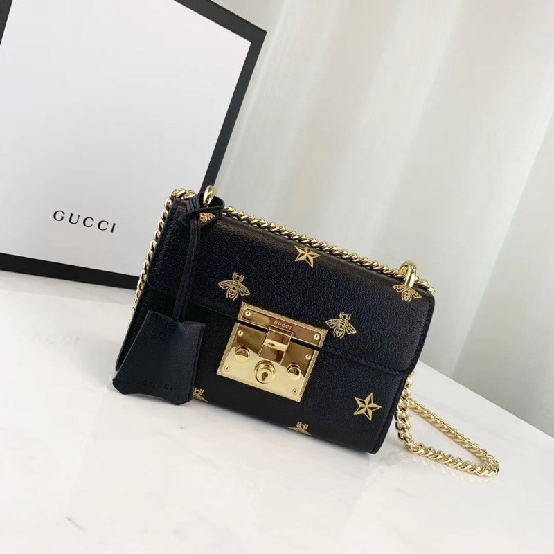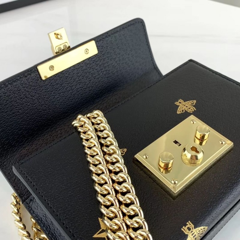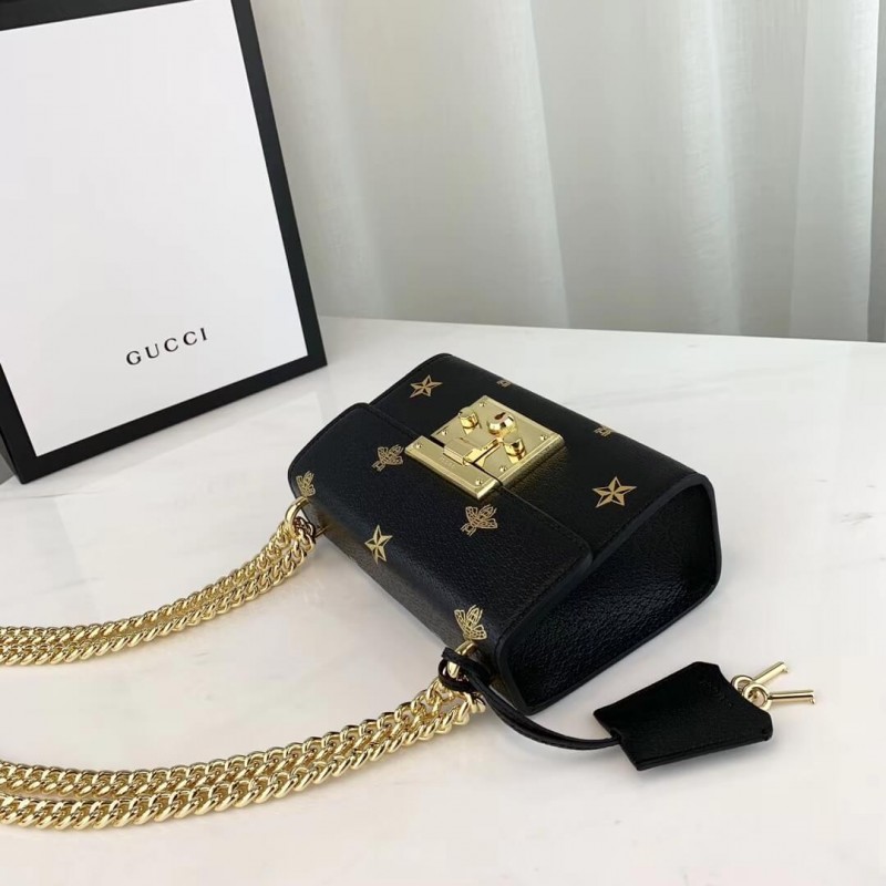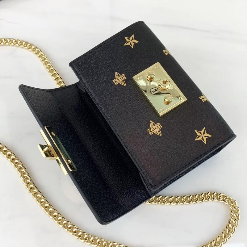 Characterized by structured silhouettes and a key lock closure pulled straight from the House s archives, the distinctive Padlock shapes are revamped season after season. For Cruise 2019, the small shoulder bag is presented in textured leather printed with metallic gold bees and stars. The key is placed in a detachable leather key case.