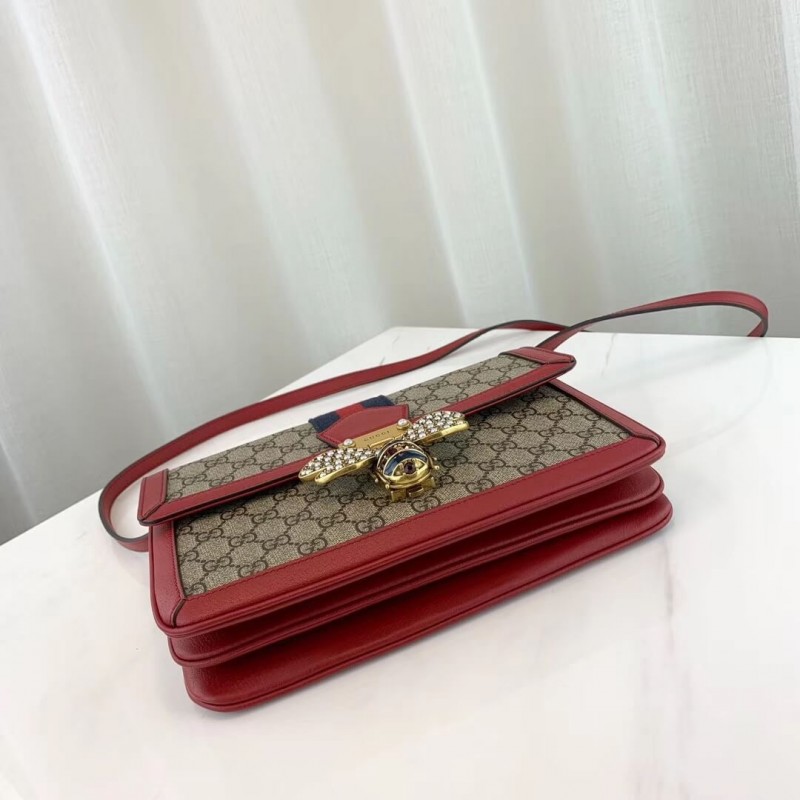 An eclectic mixture of historical Gucci details and newly established codes, for the Pre-Fall 2018 the Queen Margaret line is presented in GG canvas, a versatile fabric that continues to pay homage to the House s roots. Inspired by the 70s archives, a bee enriched by glass pearls and multicolor crystals defines the closure of this medium shoulder bag, trimmed in red leather.