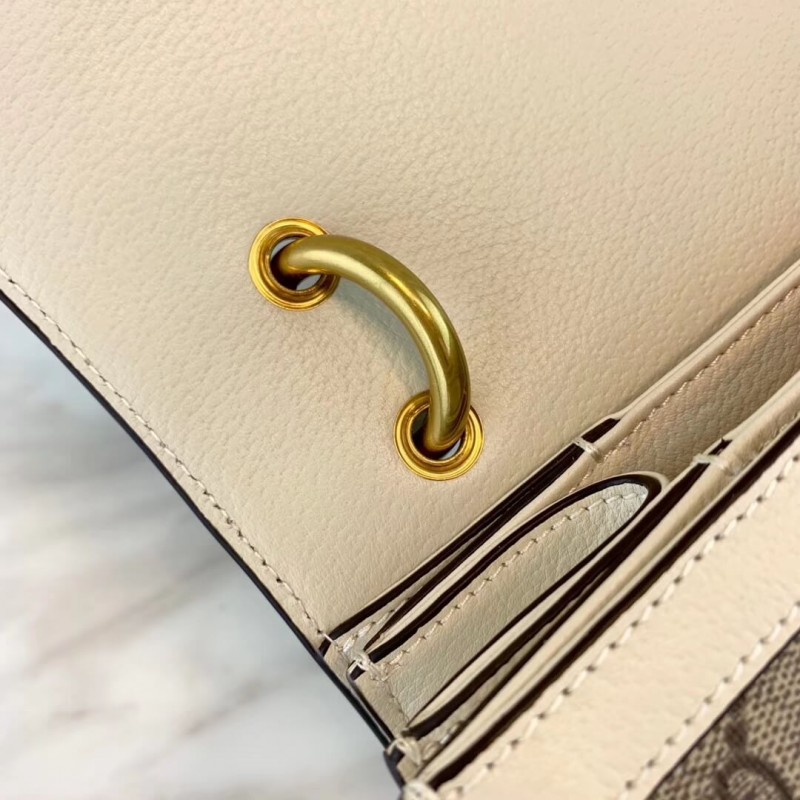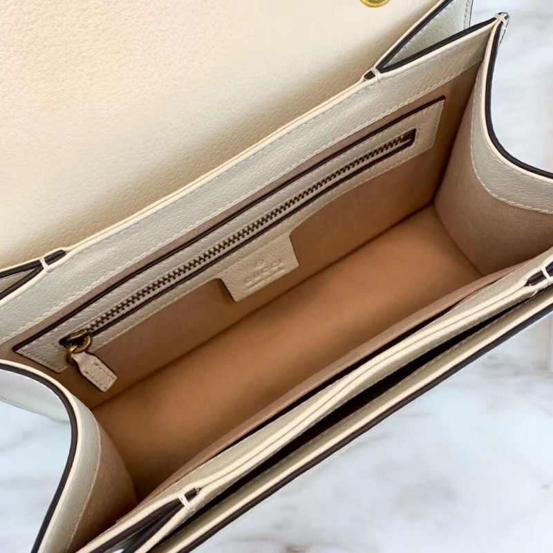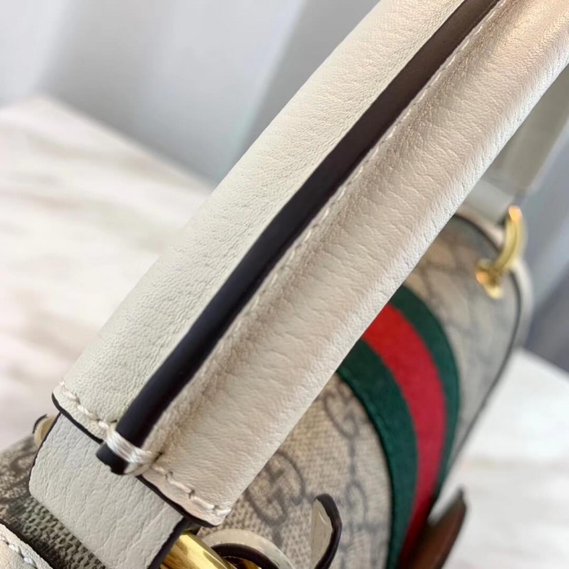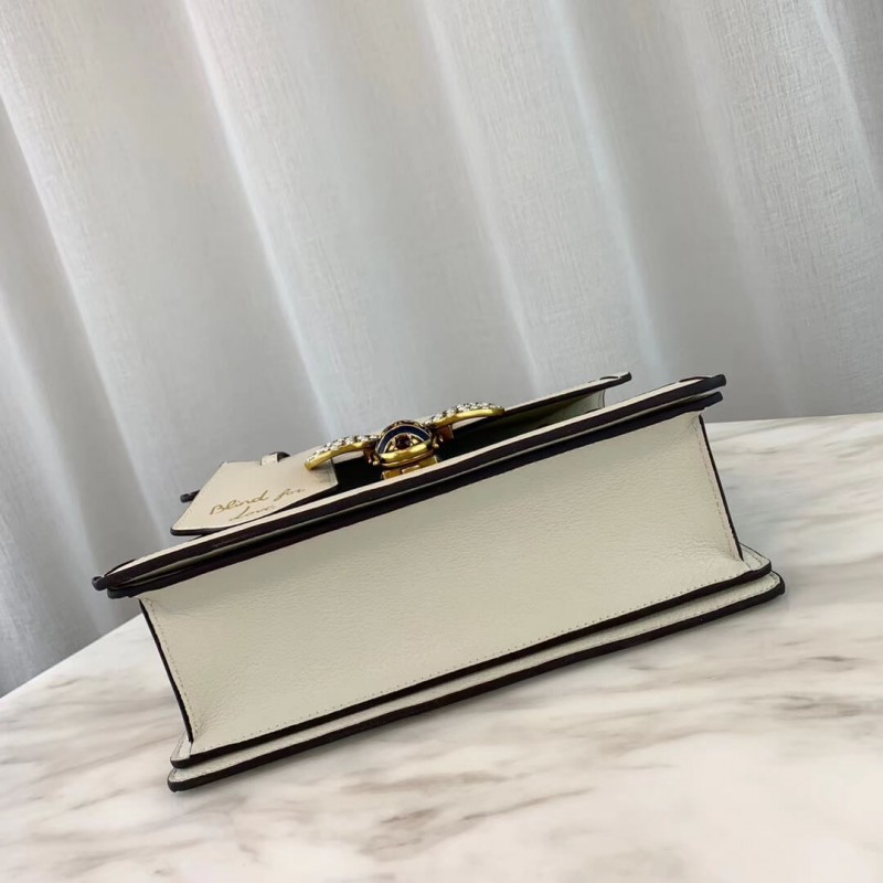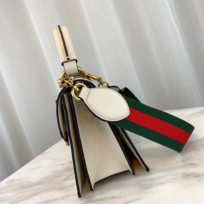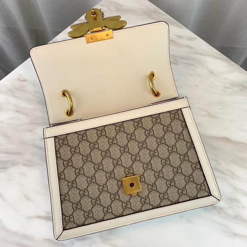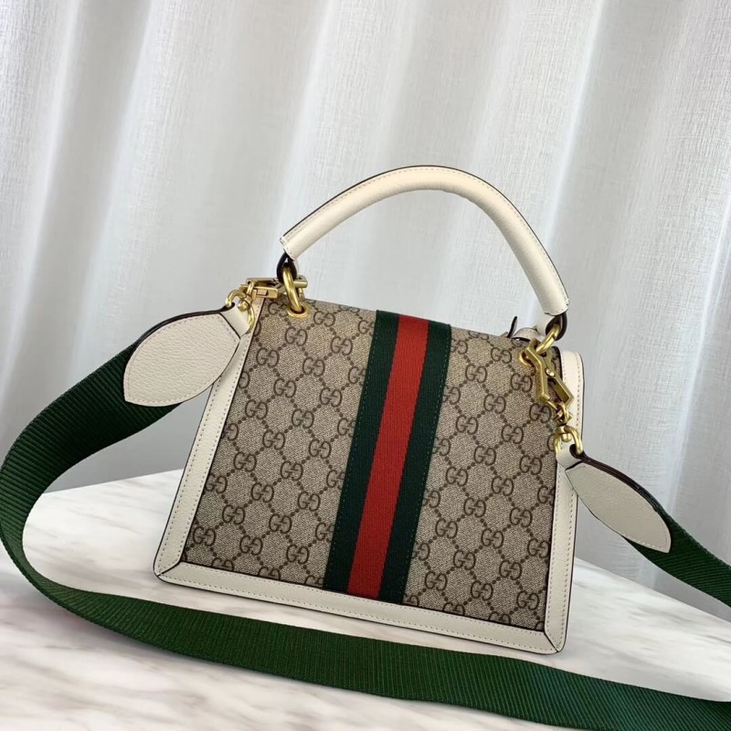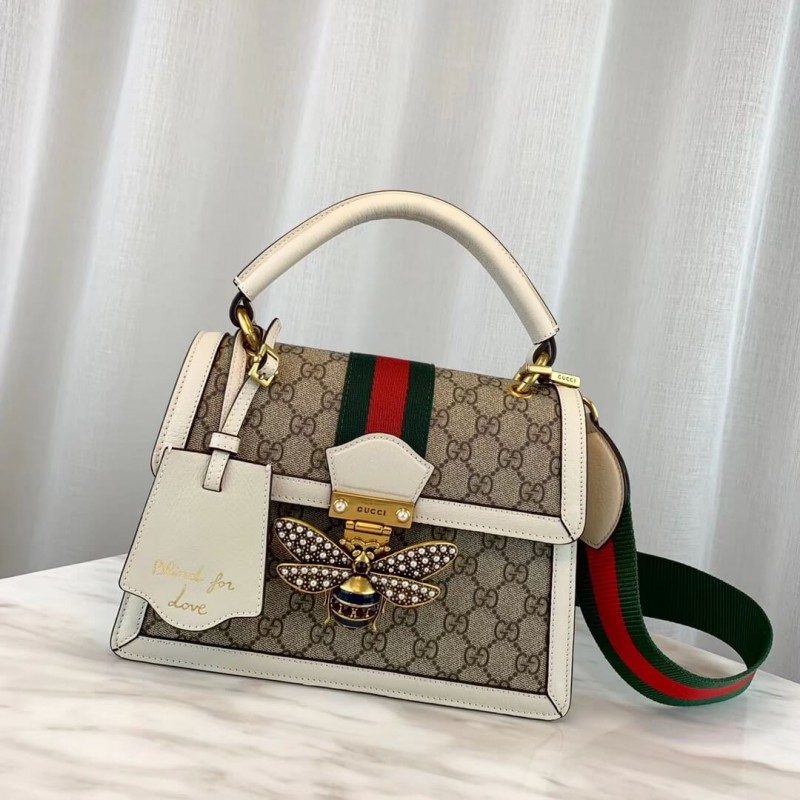 An eclectic mixture of historical Gucci details and newly established codes, for the Pre-Fall 2018 the Queen Margaret line is presented in GG canvas, a versatile fabric that continues to pay homage to the House s roots. Inspired by the 70s archives, a bee enriched by glass pearls and multicolor crystals defines the closure of this small top handle bag, trimmed in red leather.