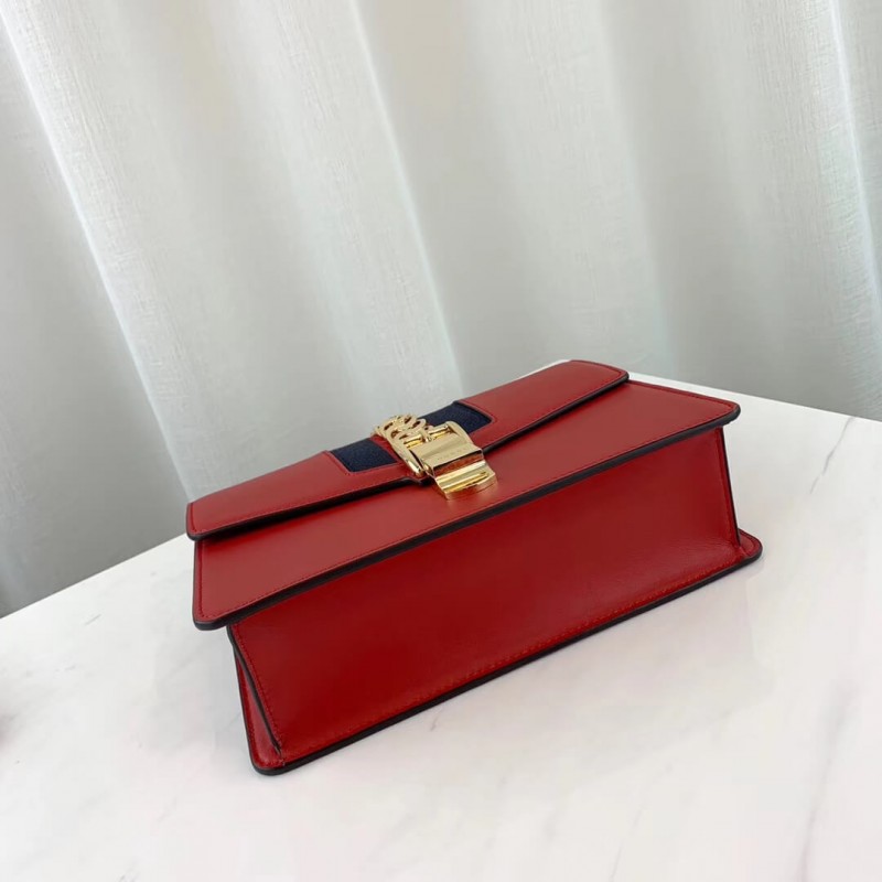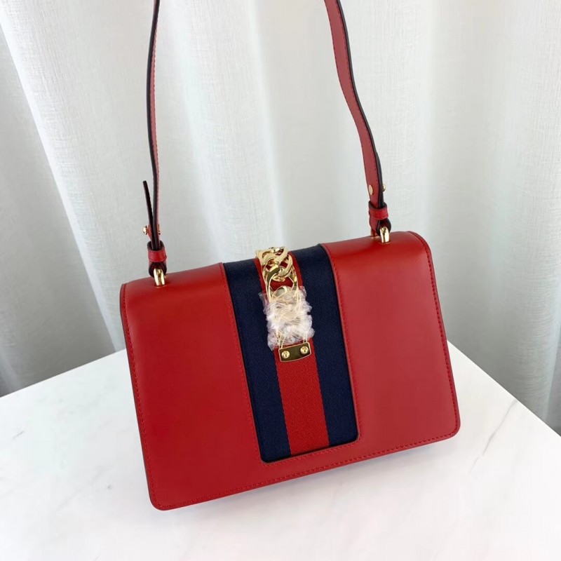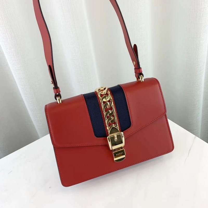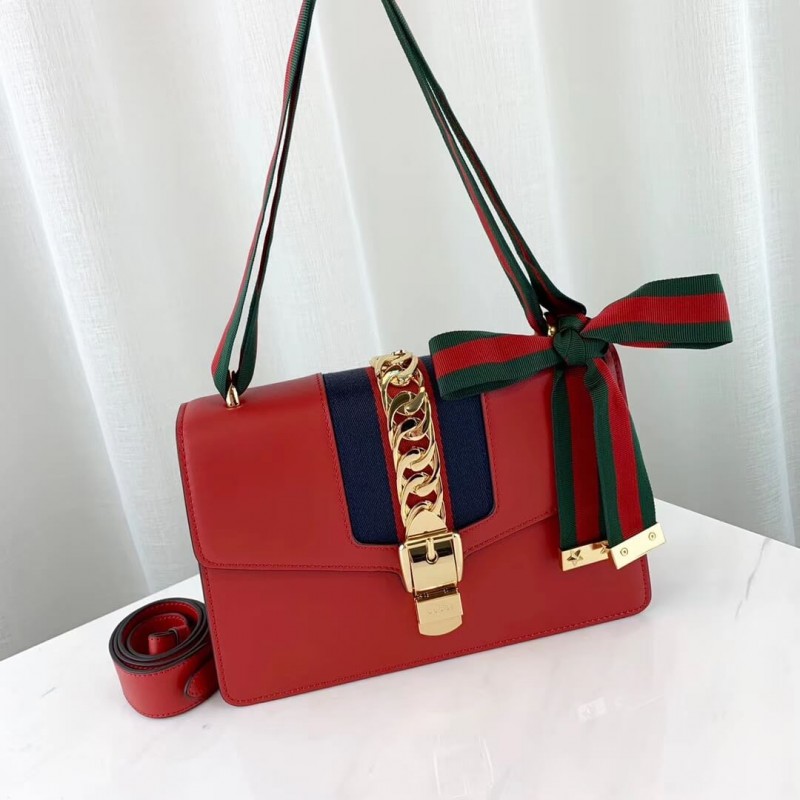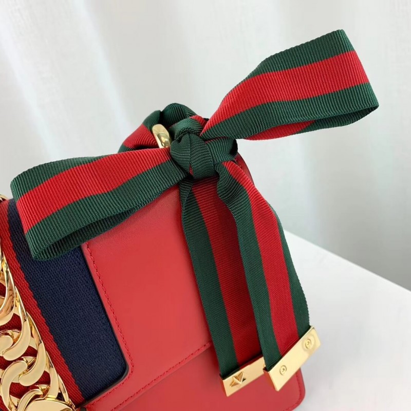 A playful mix of House codes, the Sylvie shoulder bag combines a gold metal chain and buckle with contrasting Web stripe details. The signature Gucci shape from the 60s and 70s is brought back from the archives in a modern iteration that can be mixed-and-matched with different straps and worn in a number of ways. The structured silhouette comes with two straps: one leather shoulder strap and one grosgrain ribbon that converts from top handle to shoulder. For an additional way to wear it, a coordinating leather crossbody strap was specially designed and is available separately.