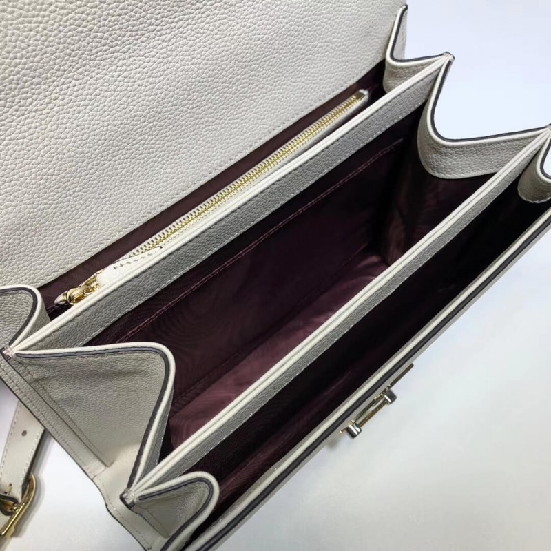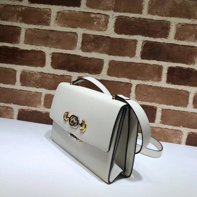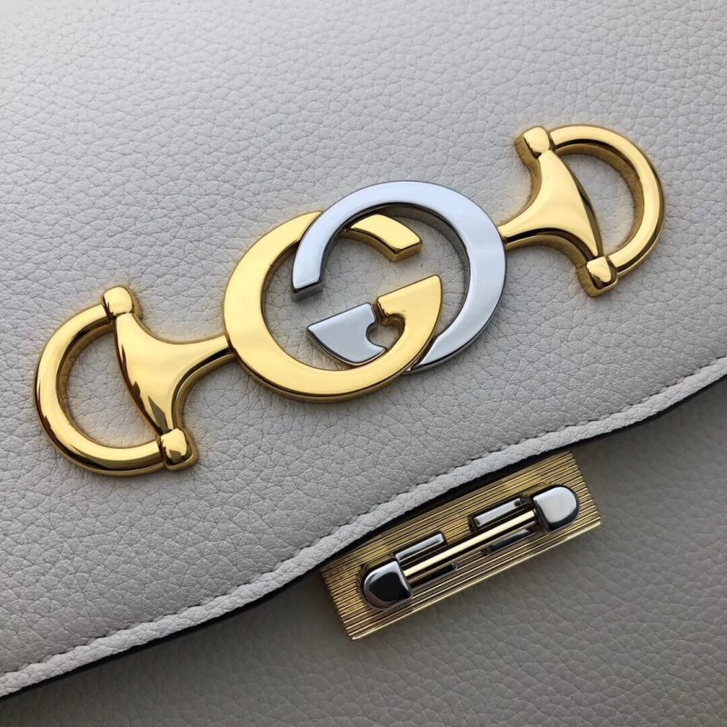 A new shape introduced to the Gucci Zumi line for Pre-Fall 2019, the small shoulder bag in burgundy grainy leather is enriched with the collection s distinctive Interlocking G Horsebit. Gucci continues to bring House icons to the forefront in unexpected ways, merging two of its codes into one symbol in a modern mix of silver and gold tones. First presented in Spring Summer 2019, Gucci Zumi takes its name from actress and experimental musician Zumi Rosow, who walked the runway carrying the bag. The shoulder bag has a flap with a special bar closure that open when both sides are pushed in together.
