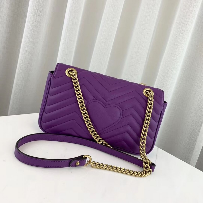 The small GG Marmont chain shoulder bag has a softly structured shape and an oversized flap closure with Double G hardware. The sliding chain strap can be worn multiple ways, changing between a shoulder and a top handle bag. Made in matelassé chevron leather with a heart on the back.