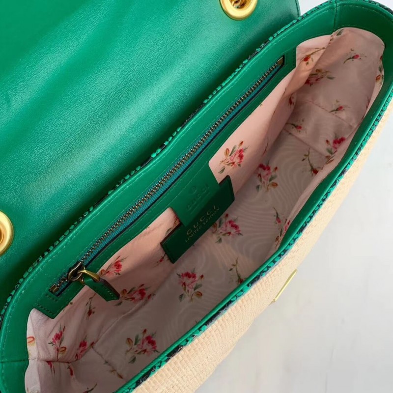 The distinctive GG Marmont line is enriched for Pre-Fall 2019 with a new iteration in raffia with vivid-toned snakeskin trim. The coveted silhouette is defined by the line s signature matelassé chevron design with a heart at the back and Double G closure. New shapes and signature Gucci lines are reimagined in a mix of fabrics and trims imbued with an inherently summer feel.