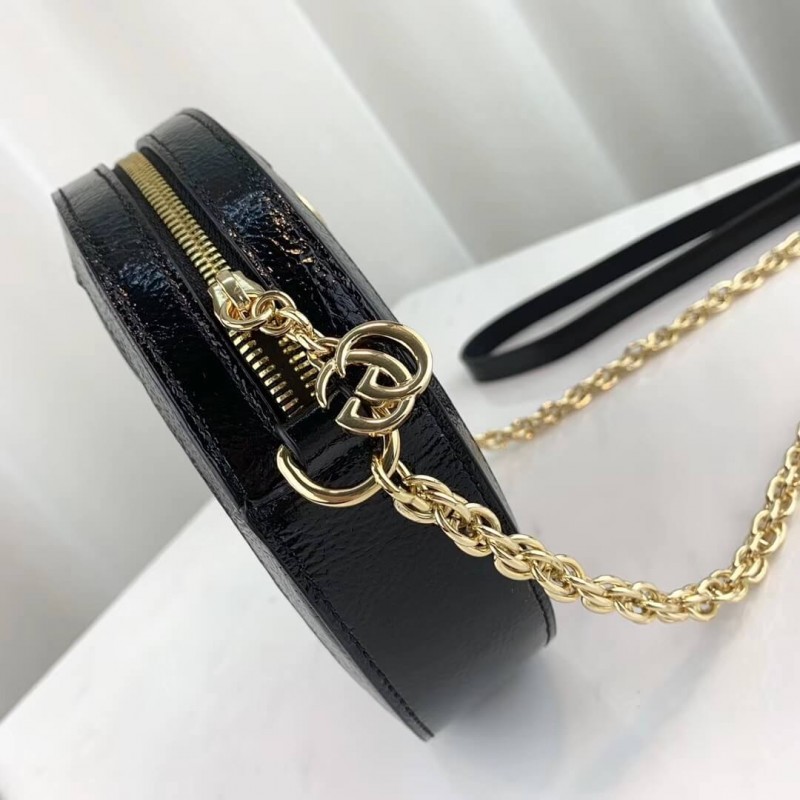 The world of Ophidia evolves with the introduction of a round mini bag with a chain shoulder strap. Crafted in black suede and patent leather with inlaid green and red Web stripe, the accessory is enhanced by a petite play on the Double G, an archival Gucci code from the 70s that appears atop a tab detail and on the zipper pull.