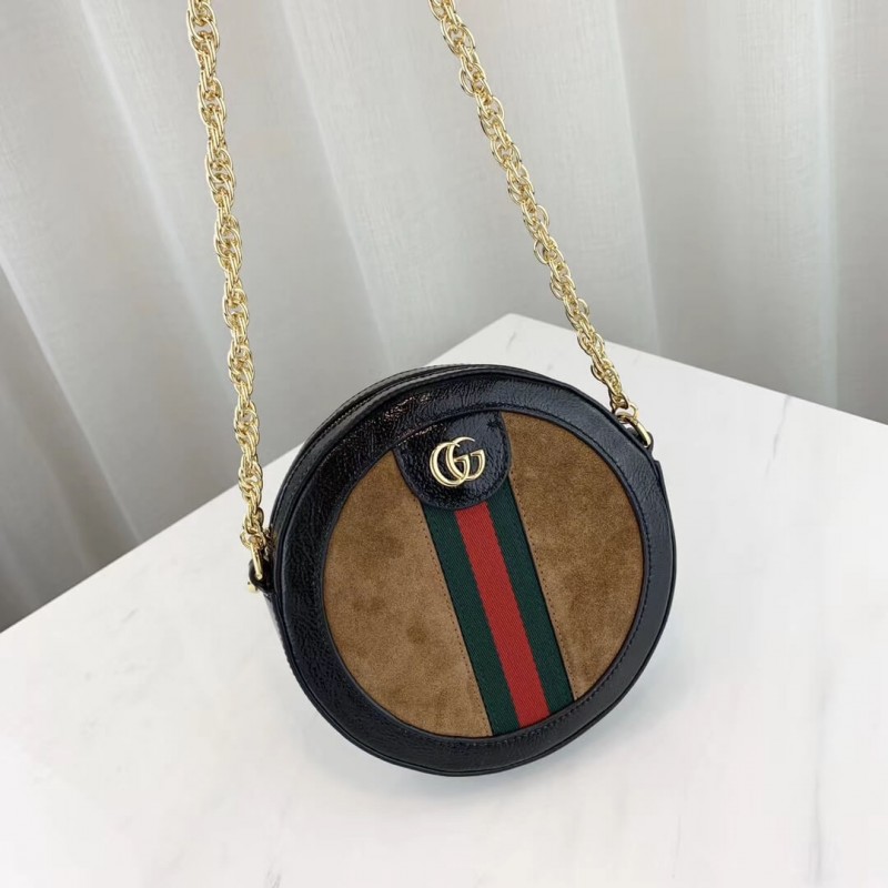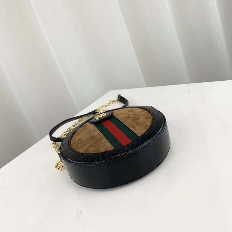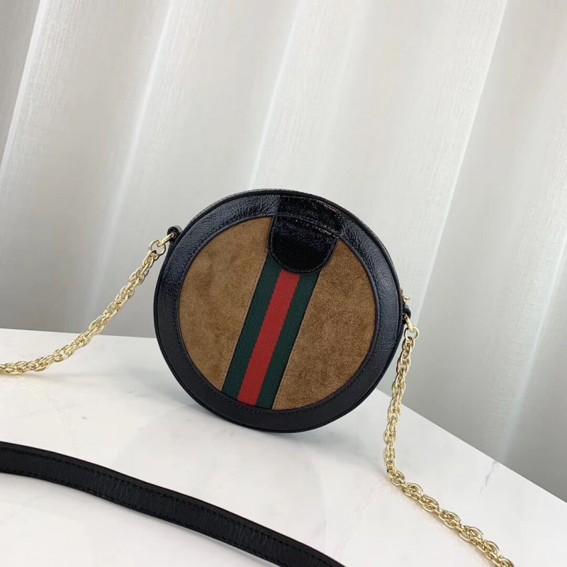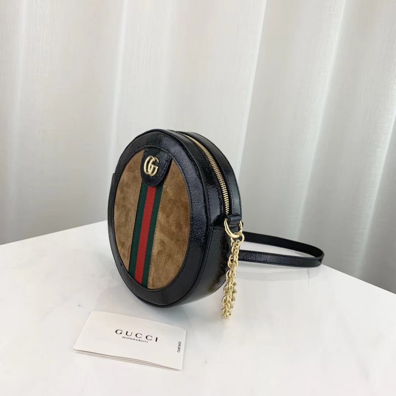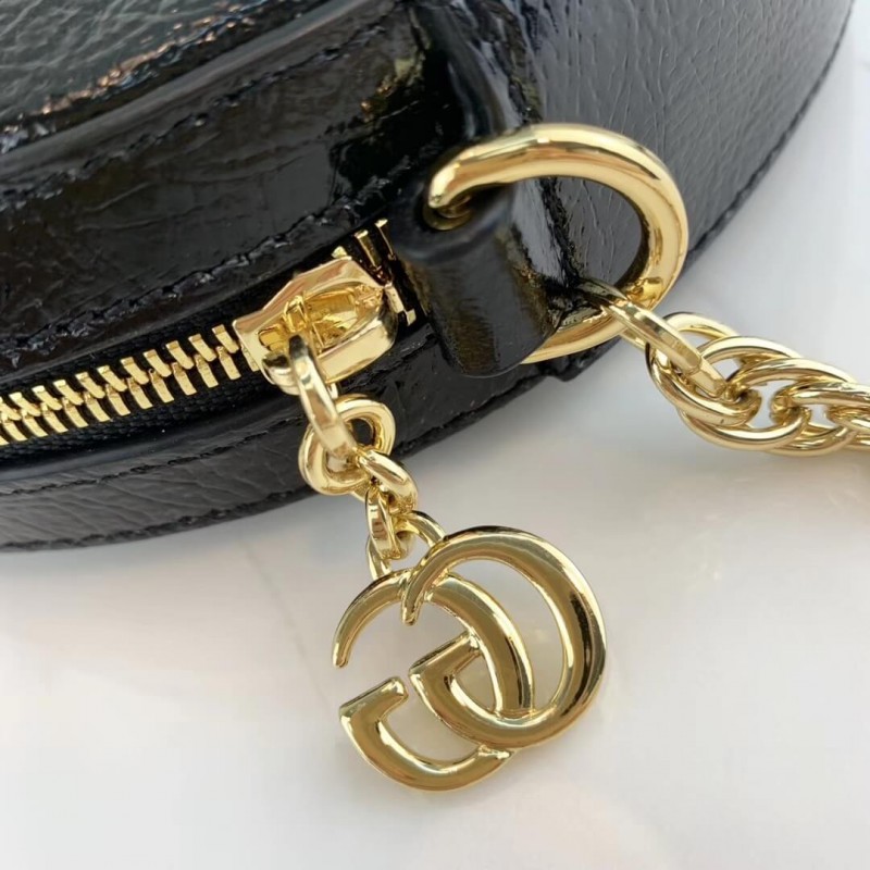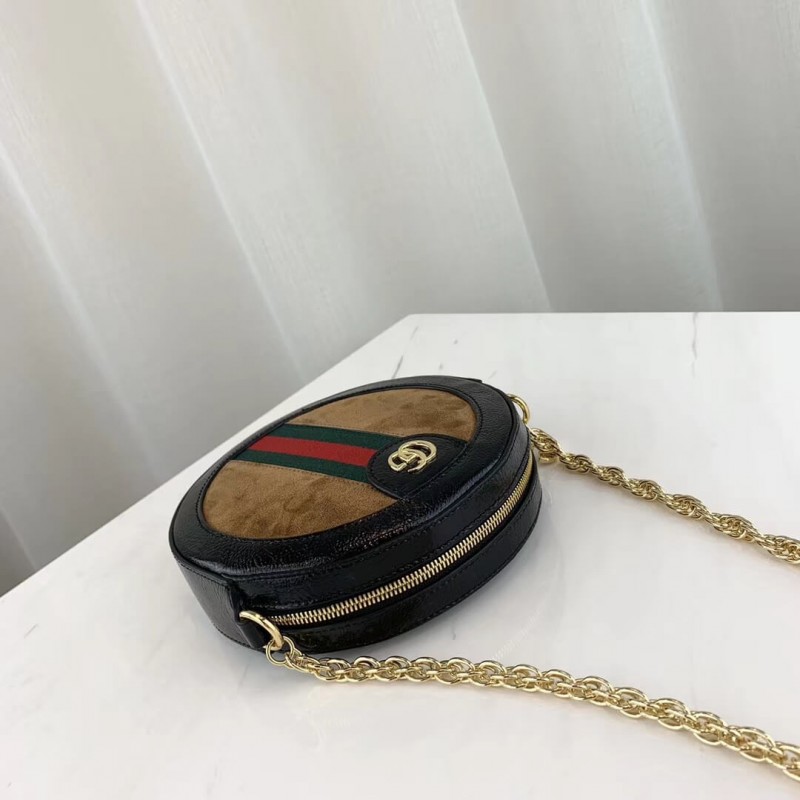 The world of Ophidia evolves with the introduction of a round mini bag with a chain shoulder strap. Crafted in black suede and patent leather with inlaid green and red Web stripe, the accessory is enhanced by a petite play on the Double G, an archival Gucci code from the 70s that appears atop a tab detail and on the zipper pull.