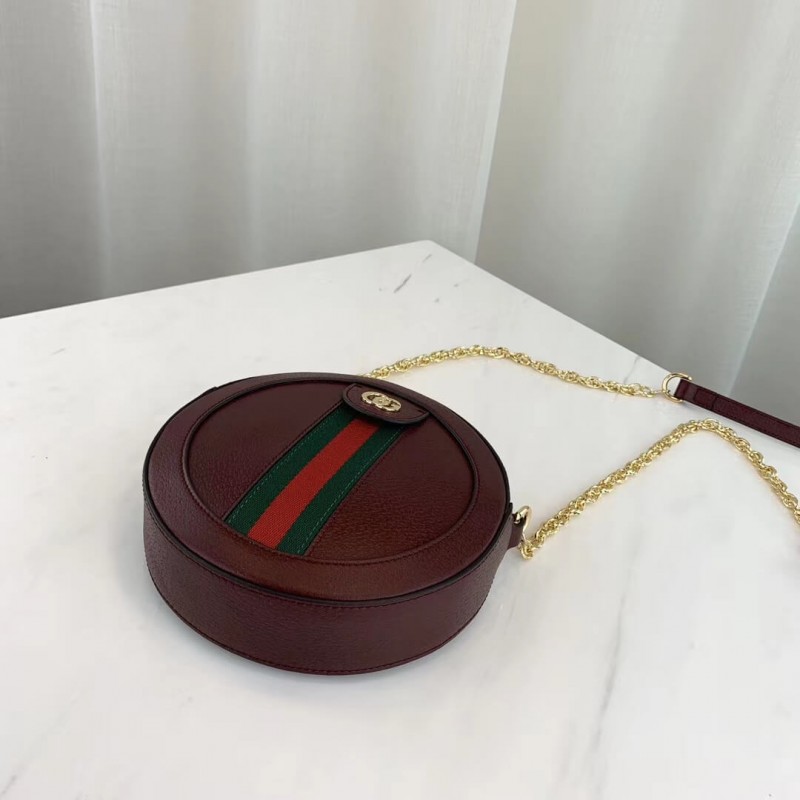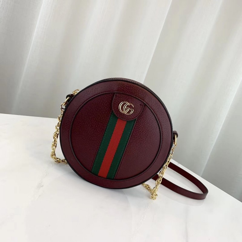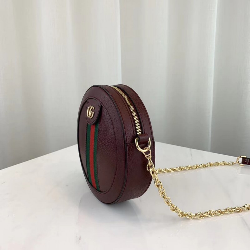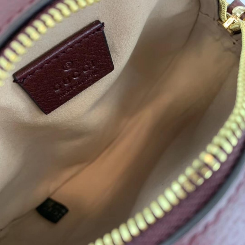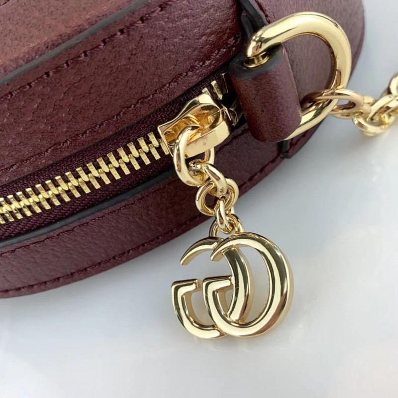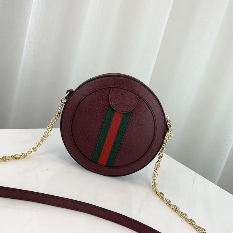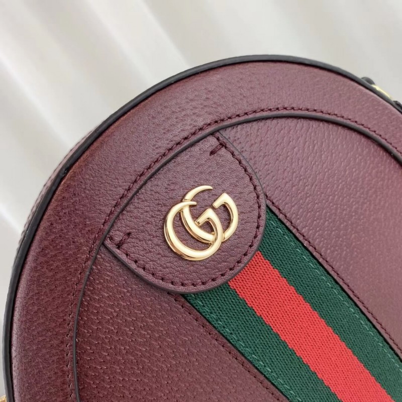 A playful shape brought into the world of Ophidia, the round mini bag with chain shoulder strap is crafted in textured white leather with inlaid blue and red Web stripe. The accessory is enhanced by a petite play on the Double G, an archival Gucci code from the 70s that appears atop a tab detail and on the zipper pull.