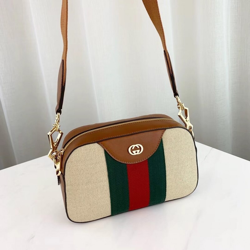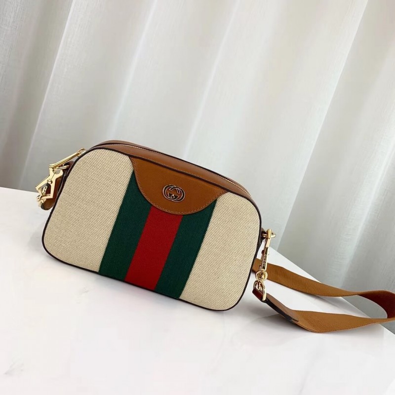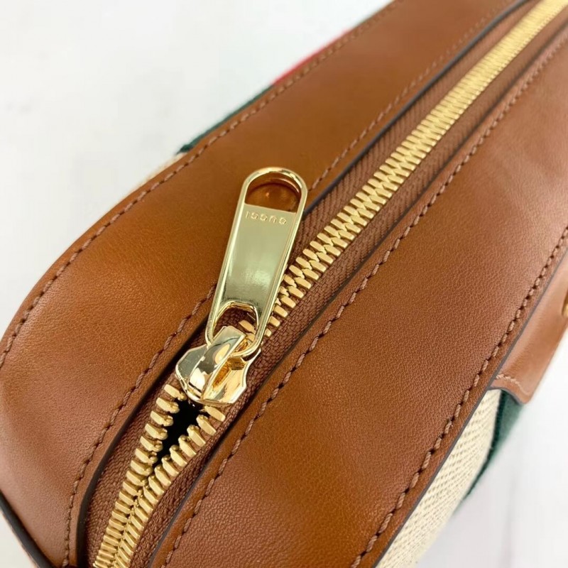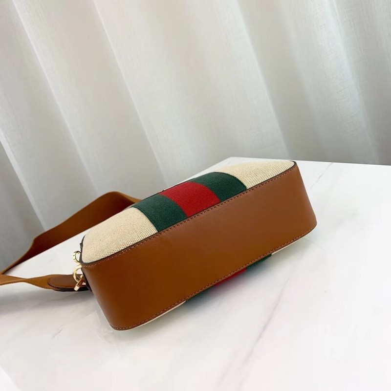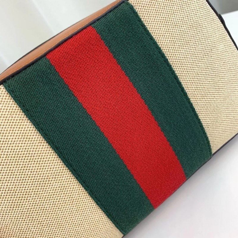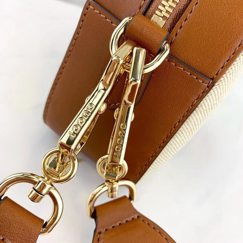 The shoulder bag, designed with a softly structured rectangular shape recalls traditional camera cases, presented in beige canvas. The bi-color woven fabric has a slightly aged effect that enhances a vintage appearance, trimmed with the House Web and brown leather. Completed with a wide nylon shoulder strap that can be removed using metal clips on each side. New shapes and signature Gucci lines are reimagined in a mix of fabrics and trims imbued with an inherently summer feel.