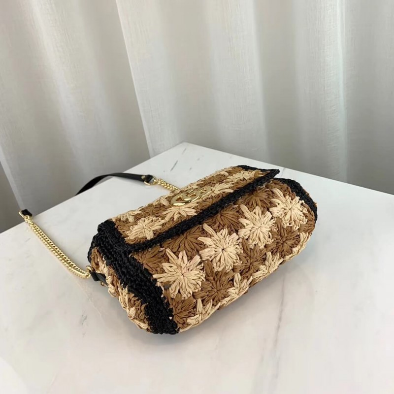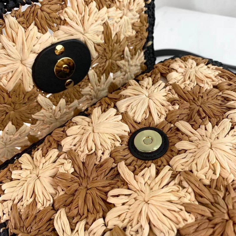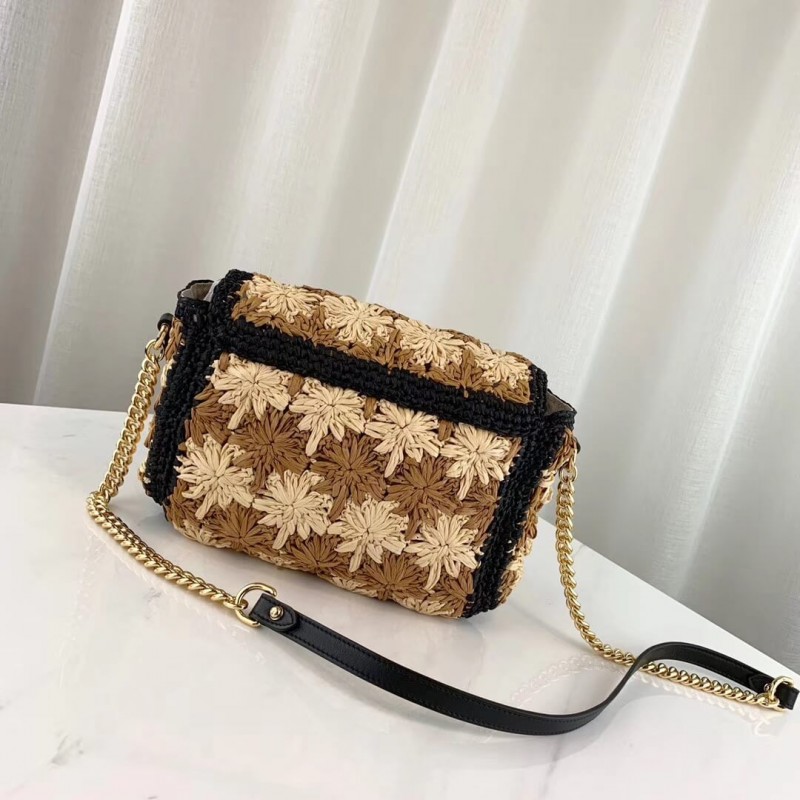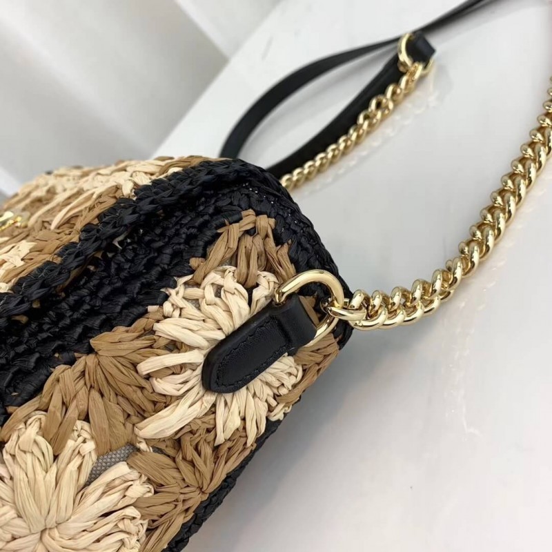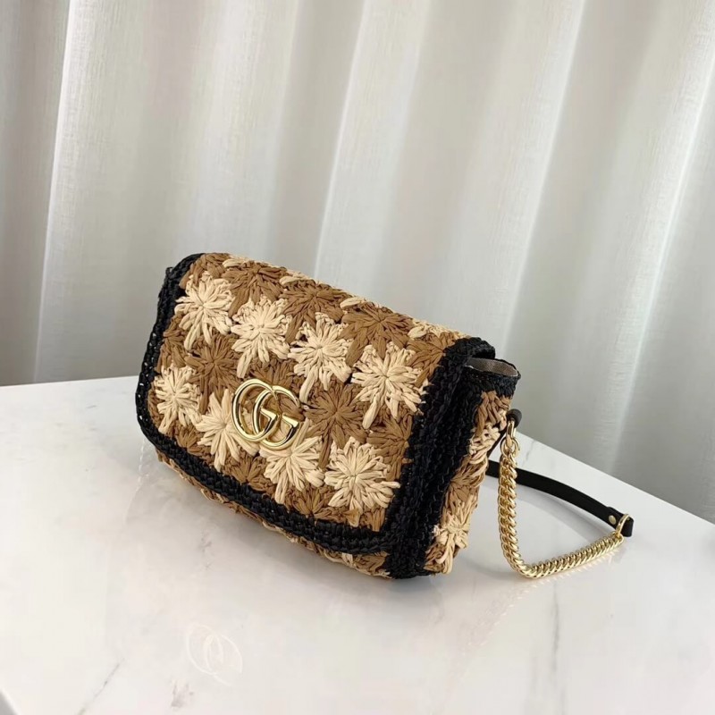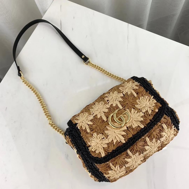 A new introduction to the GG Marmont line for Pre-Fall 2019, the small shoulder bag is introduced in the season s coveted raffia effect fabric. An unexpected take on the signature style blends the Double G emblem with the seasonal fabric, reworked to create a textured floral motif that is accented by a black trim and leather details. New shapes and signature Gucci lines are reimagined in a mix of fabrics and trims imbued with an inherently summer feel.