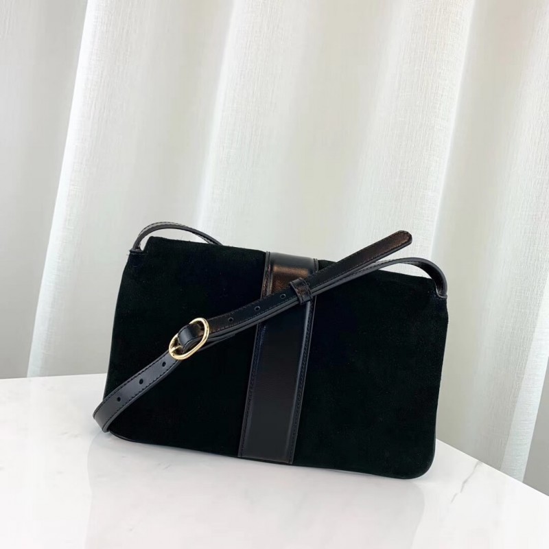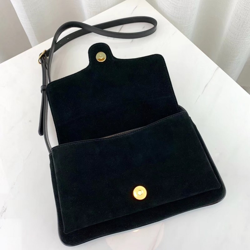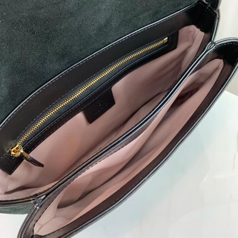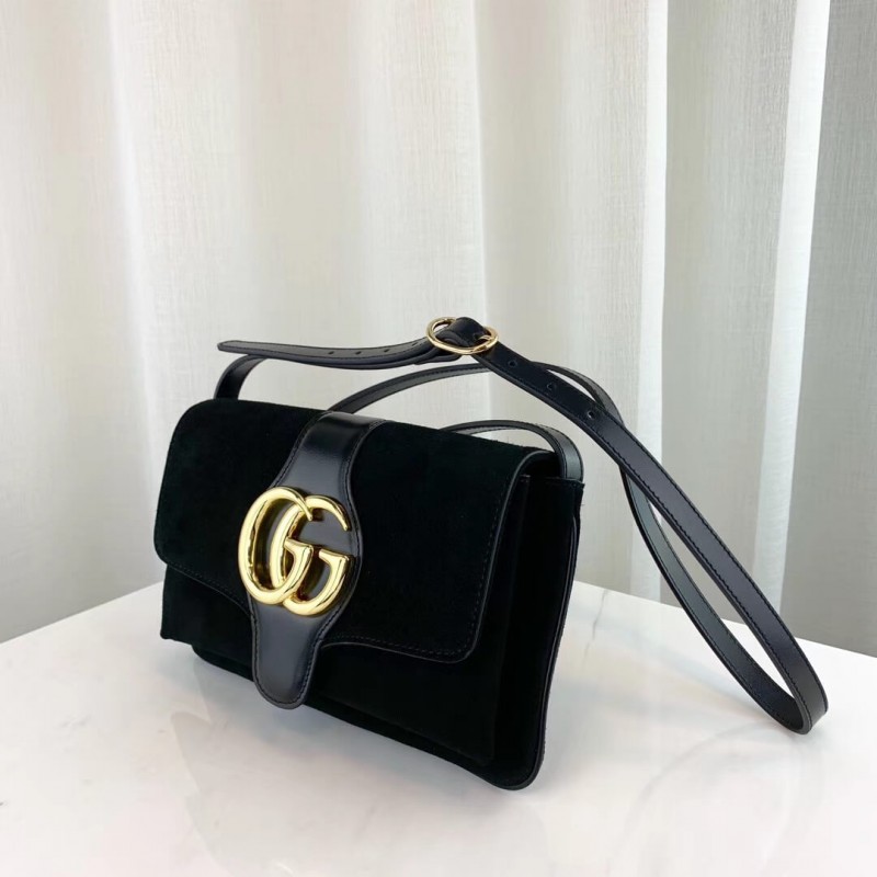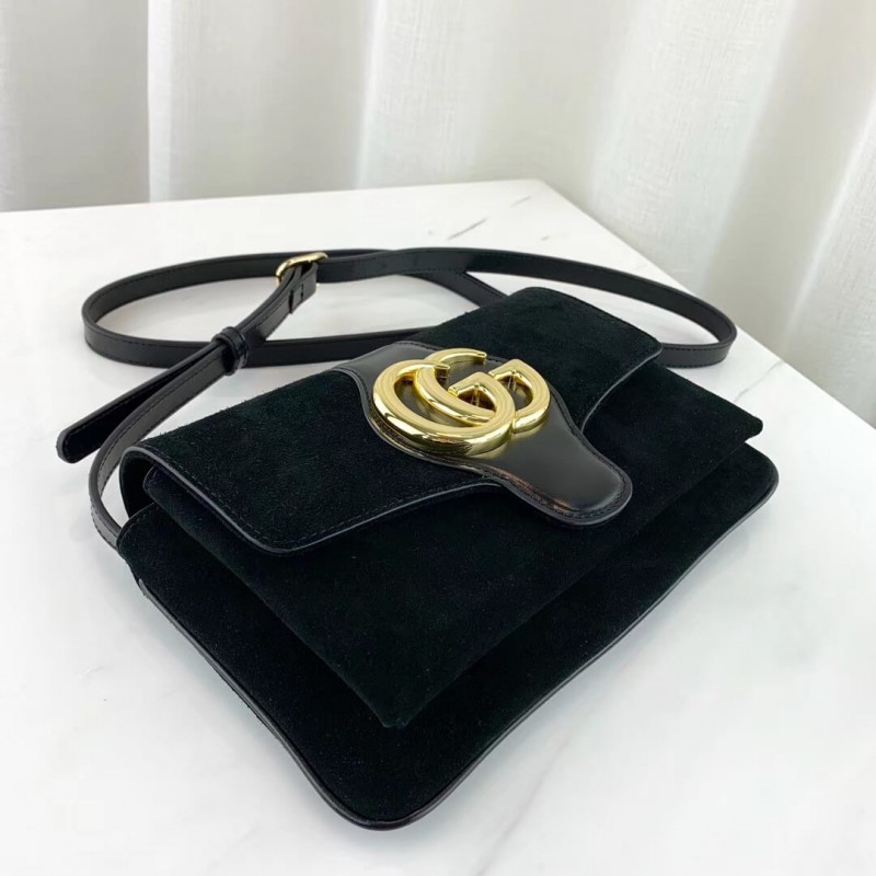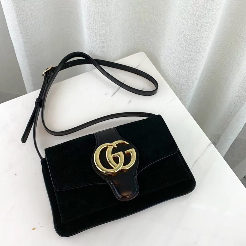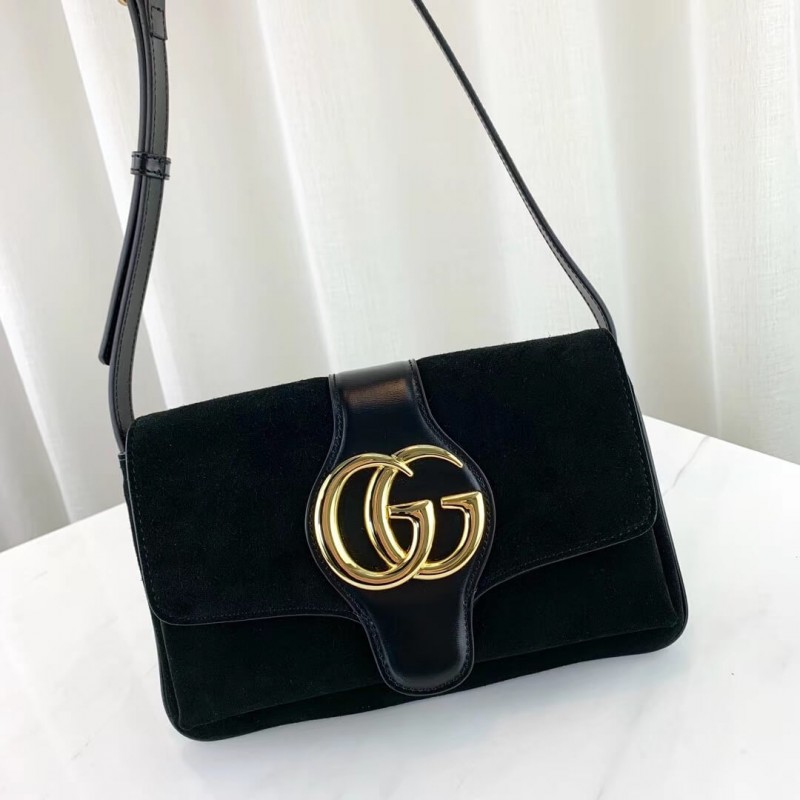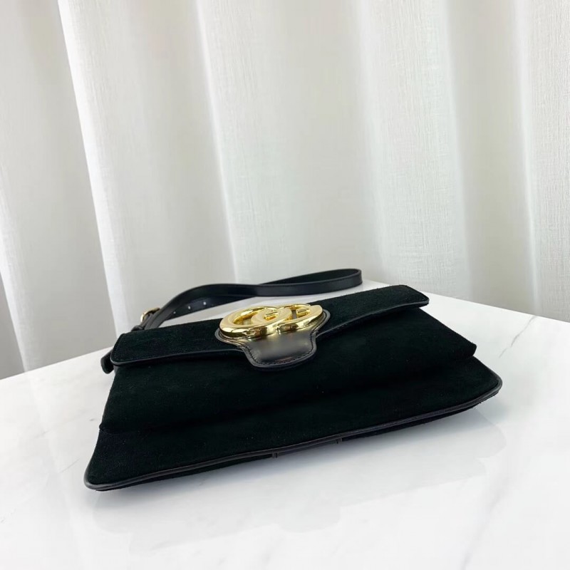Brought back from the 1970s archives, the Double G hardware defines a new line of shoulder bags. The oversize emblem decorates the exaggerated flap closure of a small shoulder bag. The silhouette has a vintage feel with an adjustable shoulder strap, crafted in black leather with a rich softness and shiny look. The accessory was first presented in the Cruise 2019 collection, revealed in the evocative setting of the Promenade des Alyscamps, an ancient Roman necropolis in the French town of Arles—which gives the name to the line.