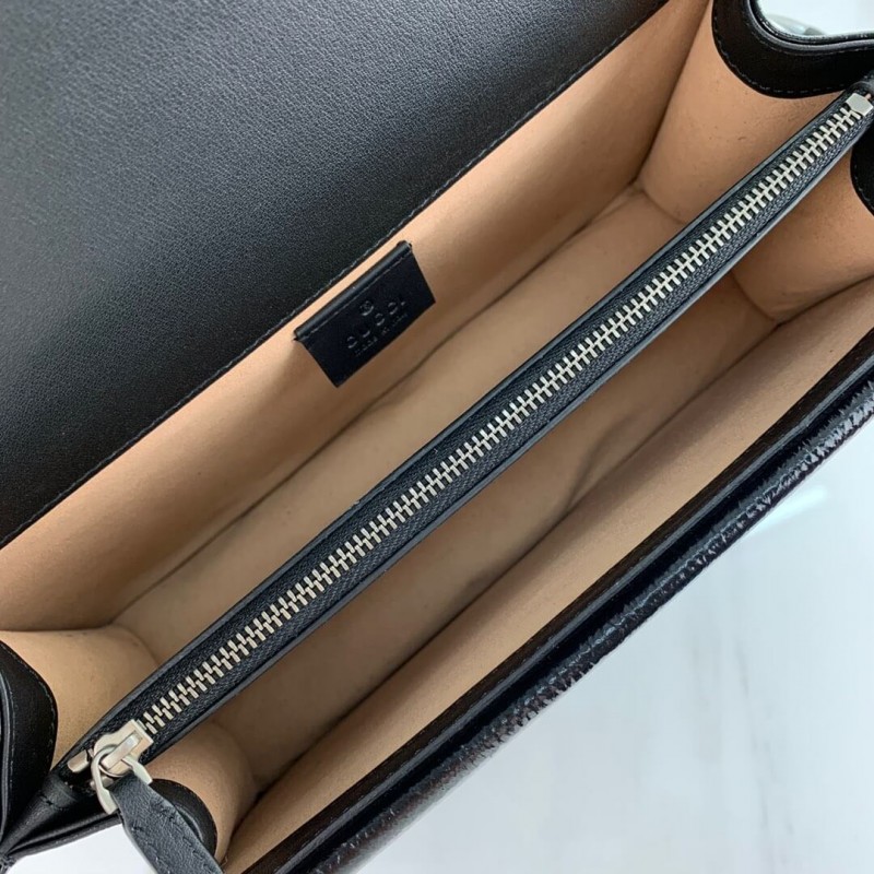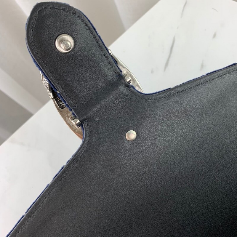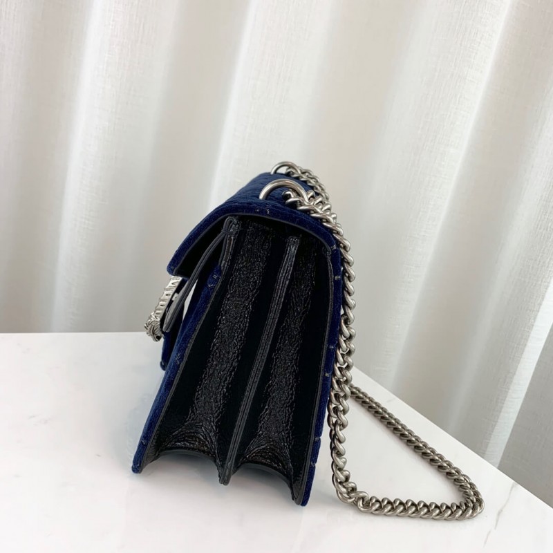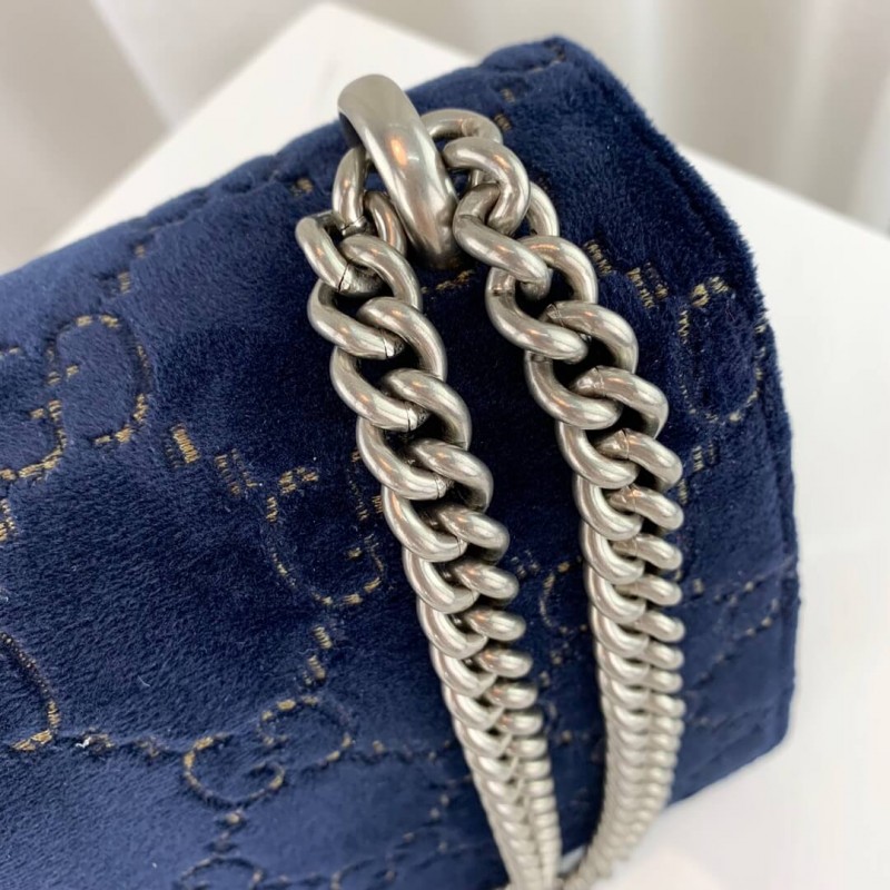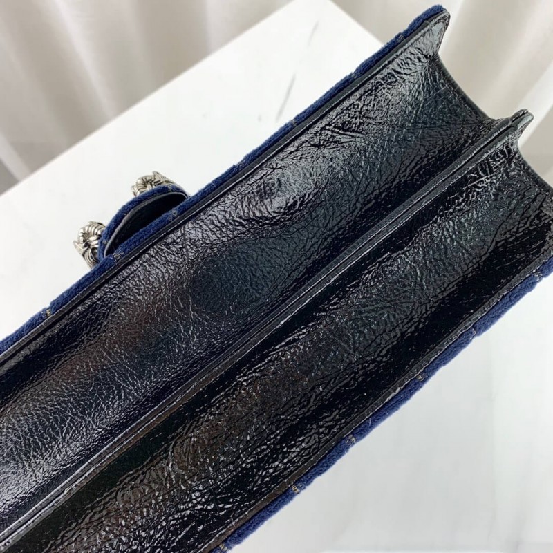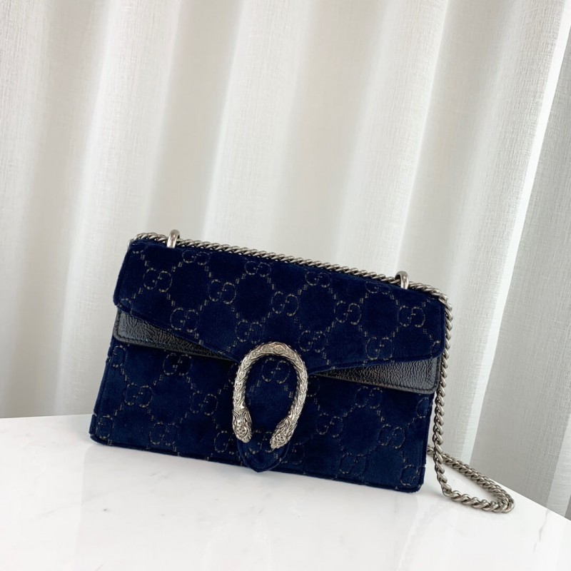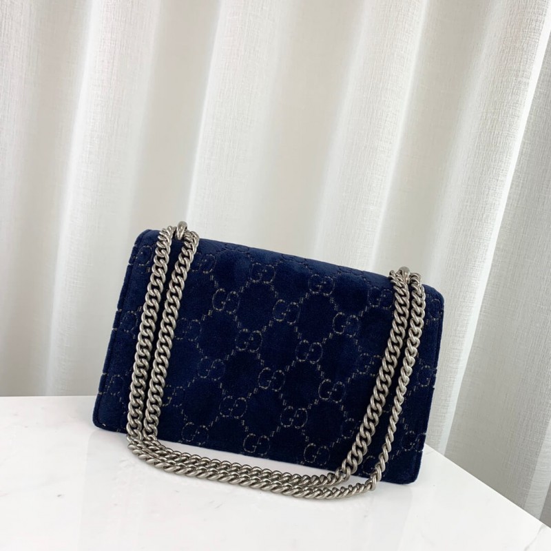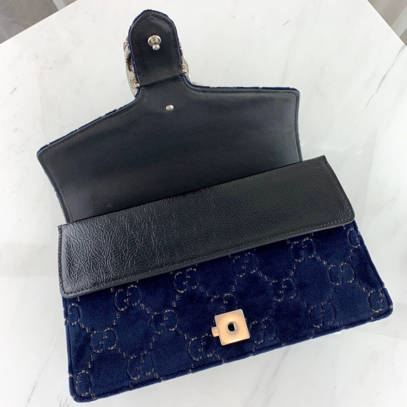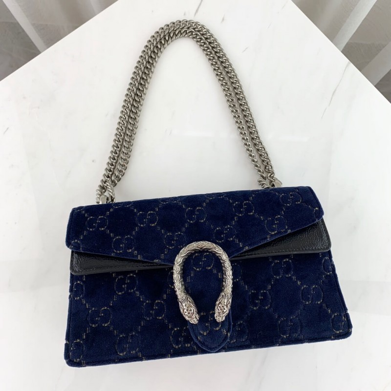 Made in GG velvet—an archival material with the GG motif embedded into soft velvet—the Dionysus shoulder bag continues to be a defining silhouette. The tiger head closure is a unique detail referencing the Greek god Dionysus, who in myth is said to have crossed the river Tigris on a tiger sent to him by Zeus. The sliding chain strap can be worn multiple ways, changing between a shoulder and a top handle bag.