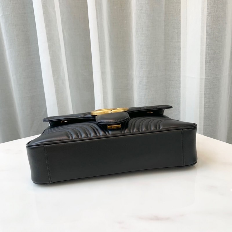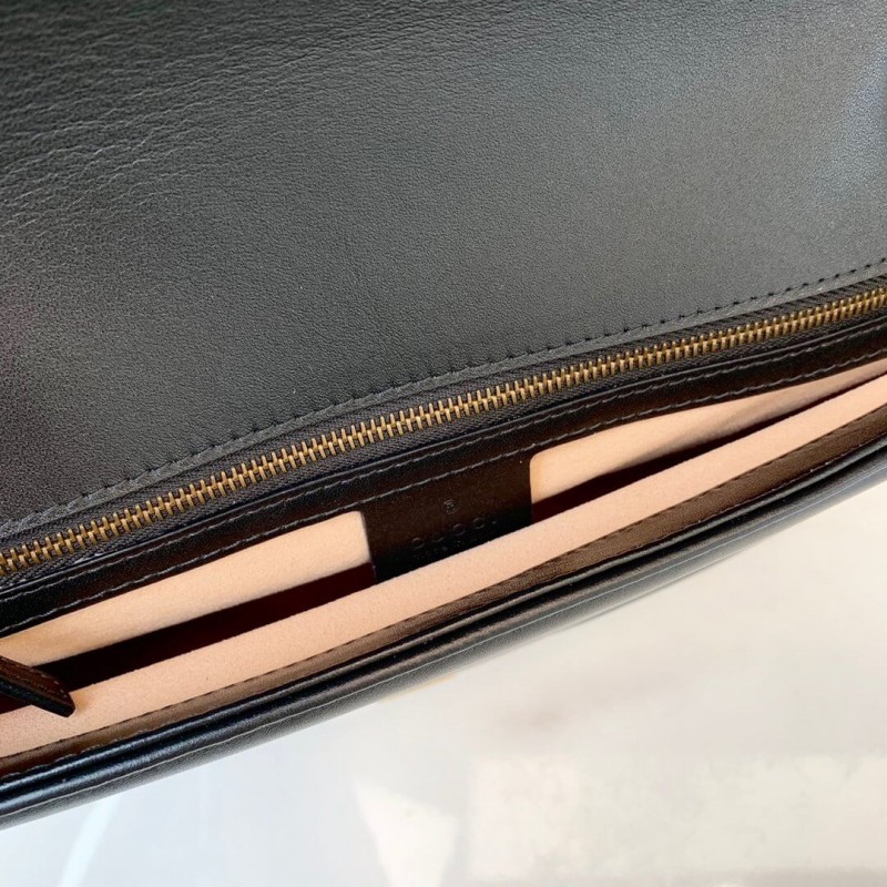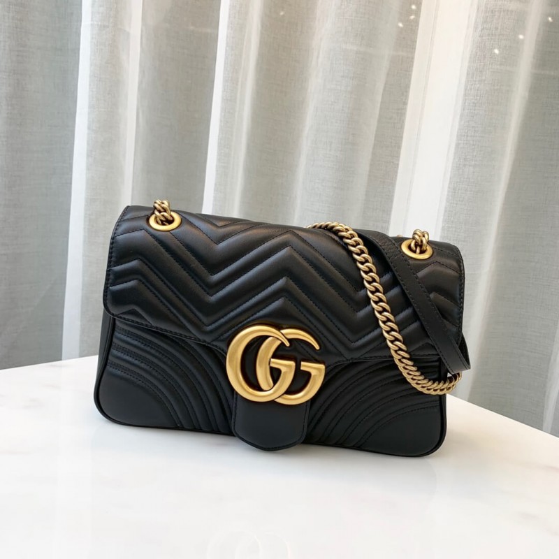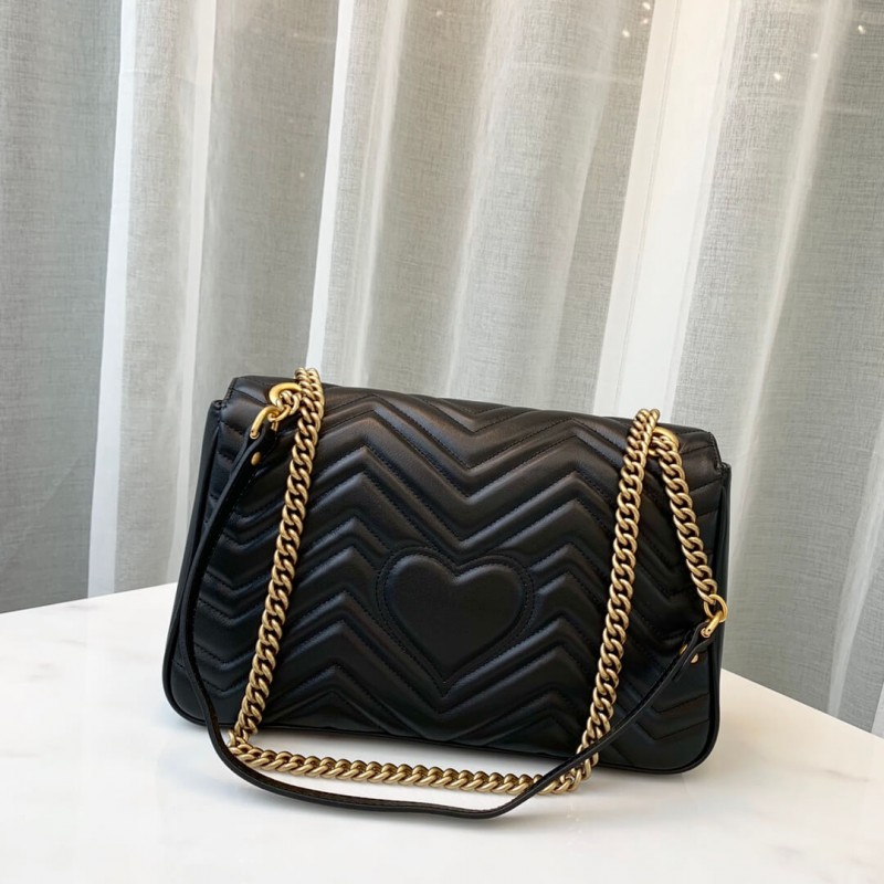 The medium GG Marmont chain shoulder bag has a softly structured shape and an oversized flap closure with Double G hardware. The sliding chain strap can be worn multiple ways, changing between a shoulder and a top handle bag. Made in matelassé chevron leather with a heart on the back.