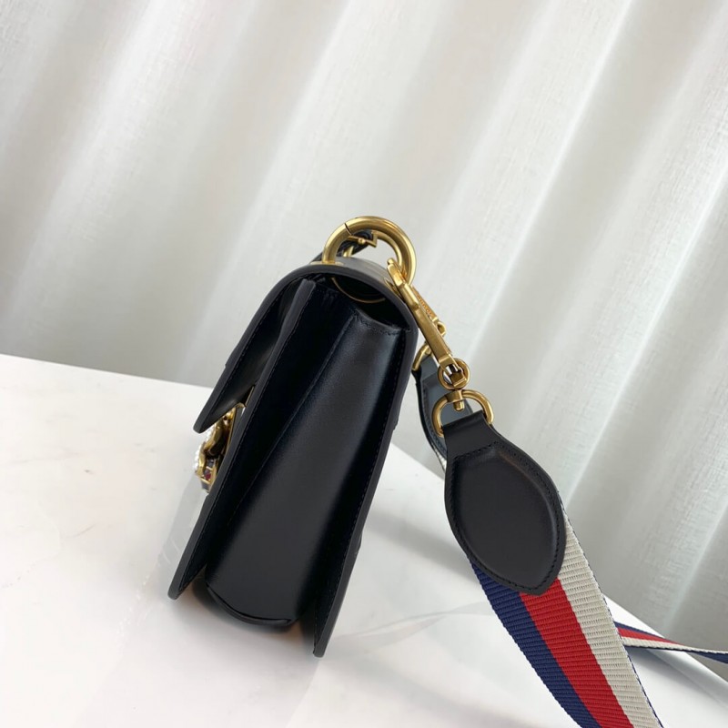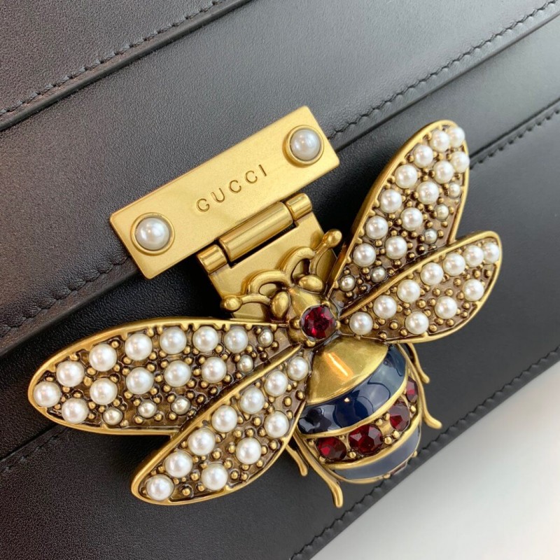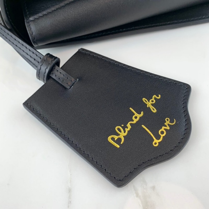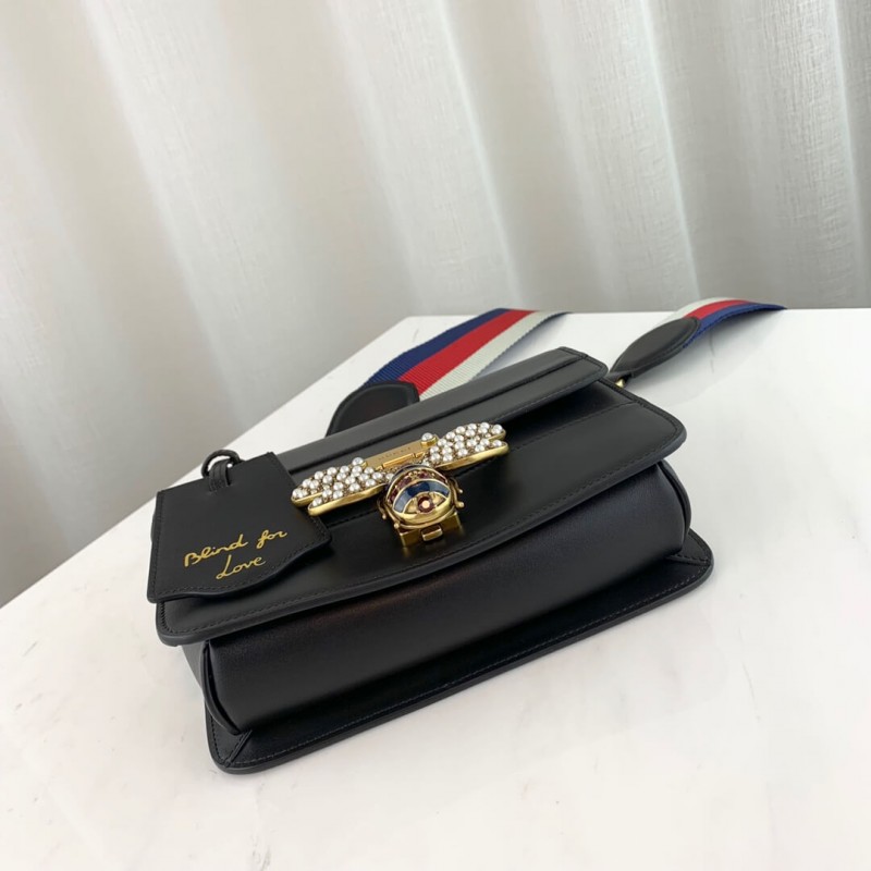 The Queen Margaret line mixes iconic Gucci details with newly established codes. The bee-a historical Gucci code taken from the 70s archives-is enriched by glass pearls and multicolor crystals. An ID holder with gold embossed "Blind For Love", a reference to inclusive romanticism, hangs over the top handle. Made in smooth leather with a slight shine in a color block design.