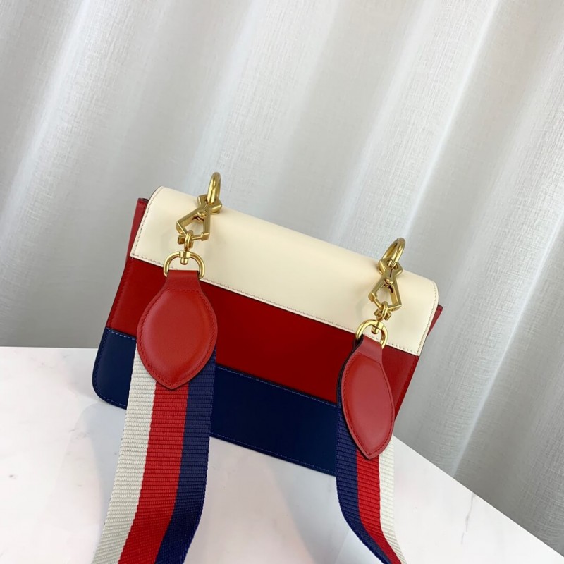 The Queen Margaret line mixes iconic Gucci details with newly established codes. The bee-a historical Gucci code taken from the 70s archives-is enriched by glass pearls and multicolor crystals. An ID holder with gold embossed "Blind For Love", a reference to inclusive romanticism, hangs over the top handle. Made in smooth leather with a slight shine in a color block design.