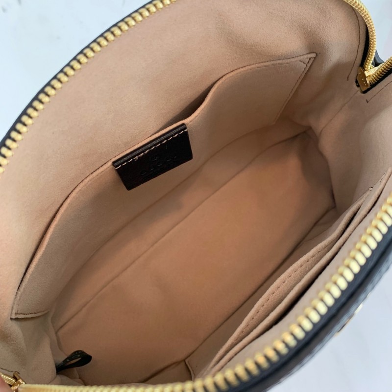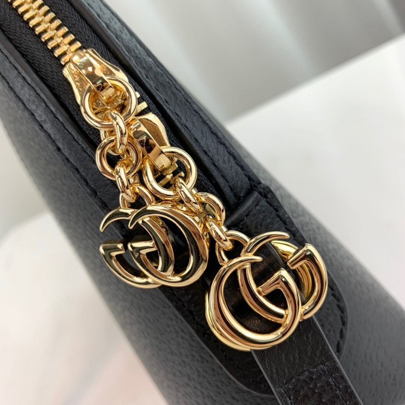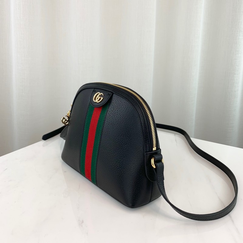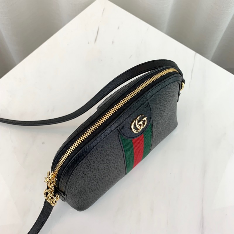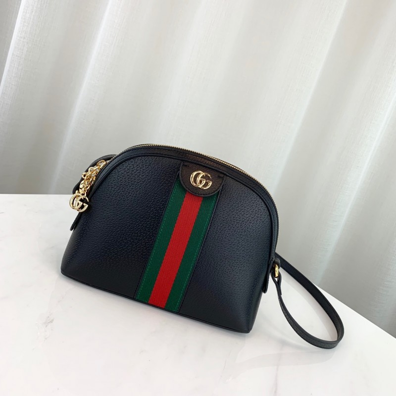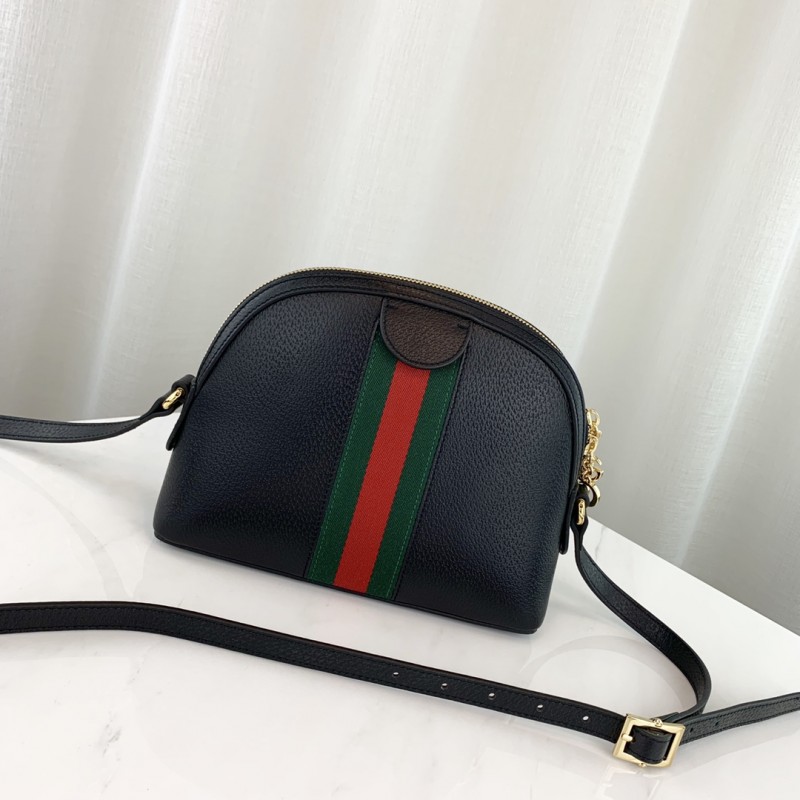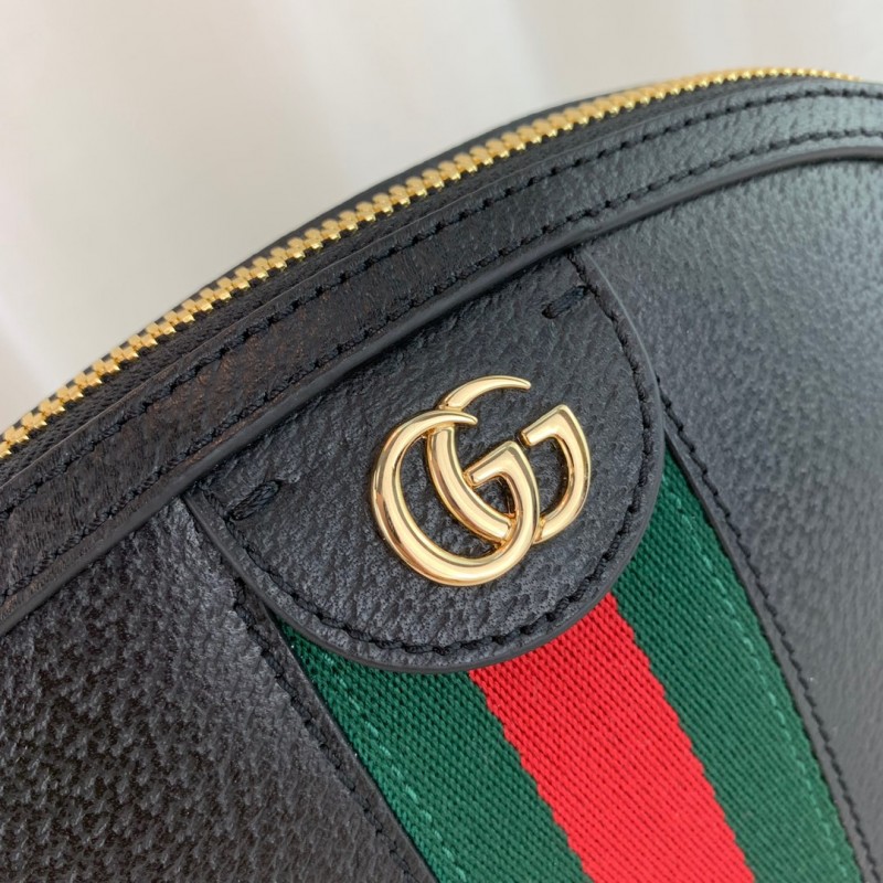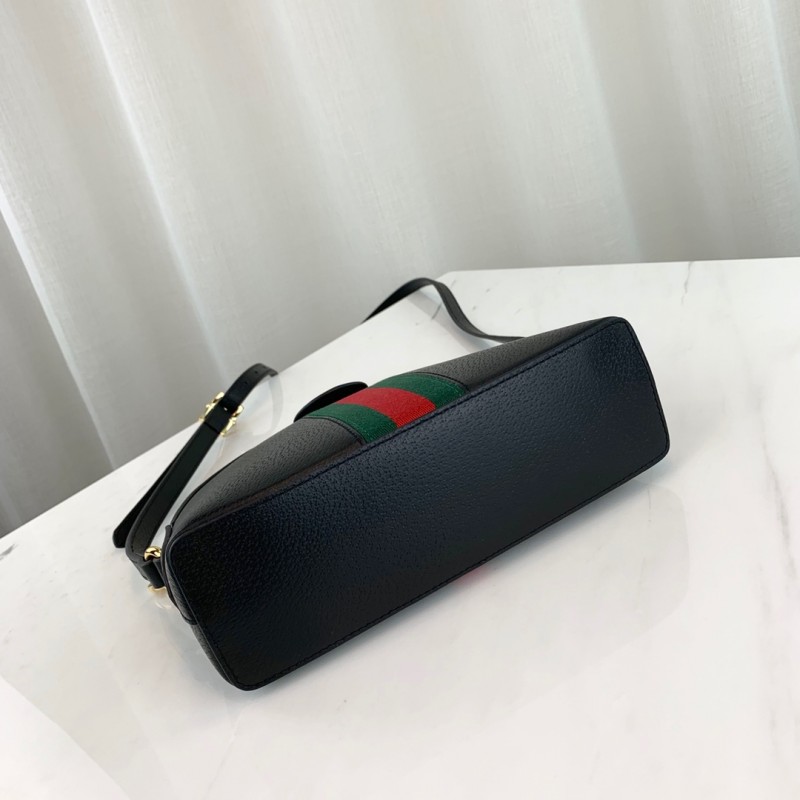 The rounded top Ophidia shoulder bag is introduced in a new iteration for Pre-Fall 2019, crafted from black leather with inlaid green and red Web stripe. The coveted style is defined by small Double G details at the front tab and zipper pulls—a contemporary take on a Gucci archival belt buckle from the 70s, repurposed into a precious petite variation.