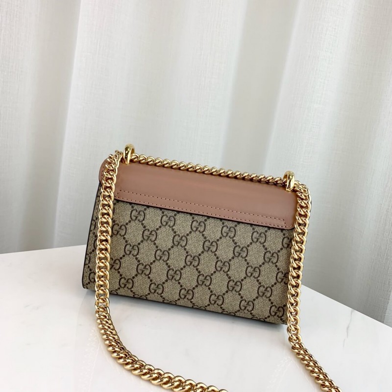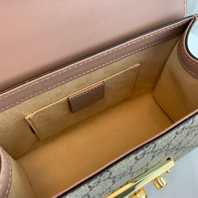 A small structured chain shoulder bag with a key lock closure pulled straight from the archives, the key is placed in a leather key case. The bag is further enhanced by gold tone studs and carefully placed GG pearl studs.