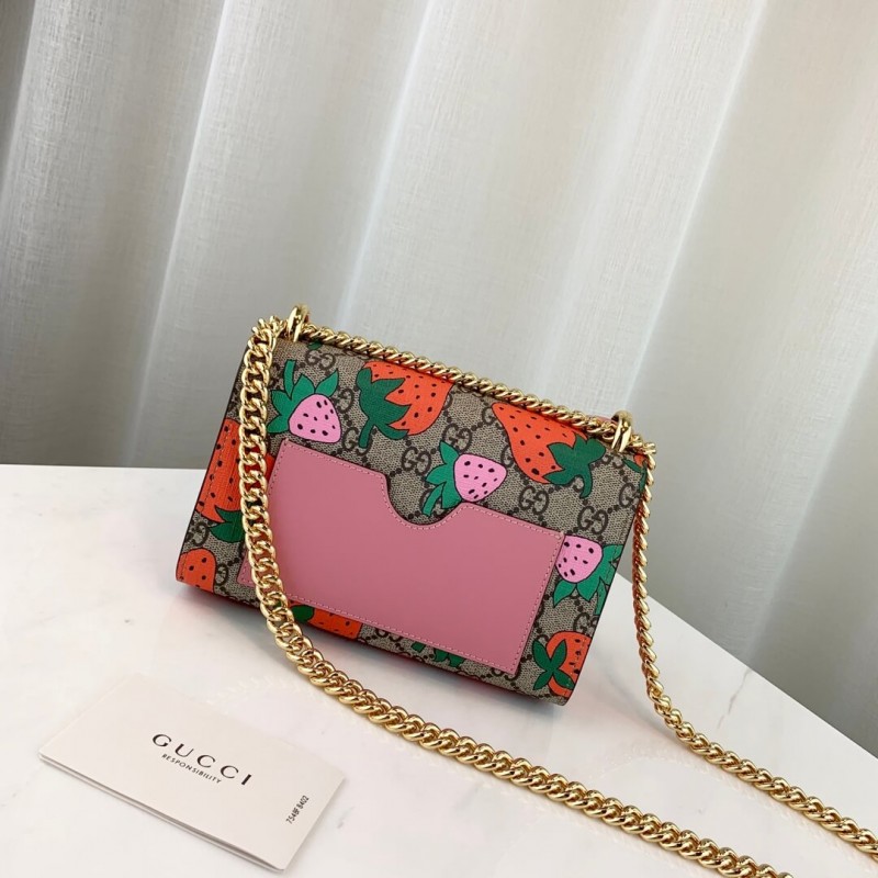 A playful rendition of the small Padlock shoulder bag is depicted with the season s colourful strawberry print. The vivid and richly graphic depiction of red and pink strawberries and the Gucci logo stand out against the GG Supreme background. Completed with a sliding chain strap that transforms the style from a shoulder bag to a top handle.
