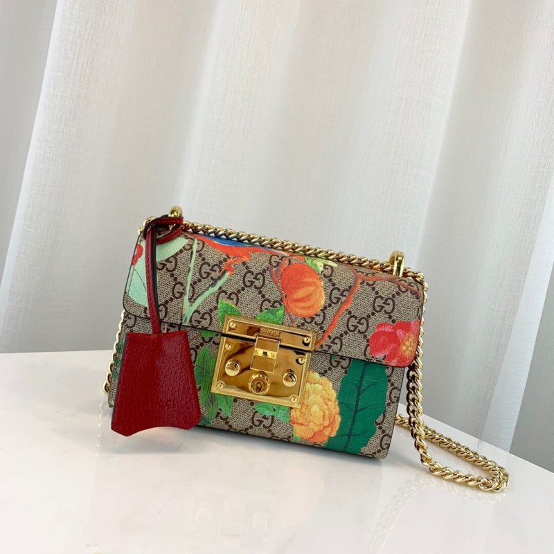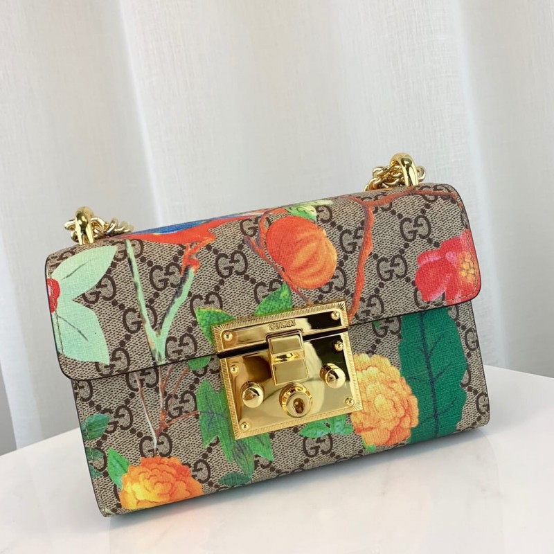 A structured GG Supreme canvas bag with a leather top and our key lock closure. The sliding chain strap can be worn multiple ways, changing between a shoulder and a top handle bag. Our new Gucci Tian print features a contemporary floral motif inspired by Chinese landscapes depicted on 18th-century tapestries and screens. The floral pattern is made up of flowers, insects and birds-including dragonflies, butterflies and hummingbirds. The plants and creatures are represented through light and quick brushstroke-style graphics, with a three-dimensional effect printed on our GG Supreme canvas.