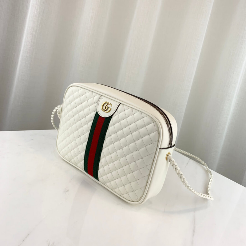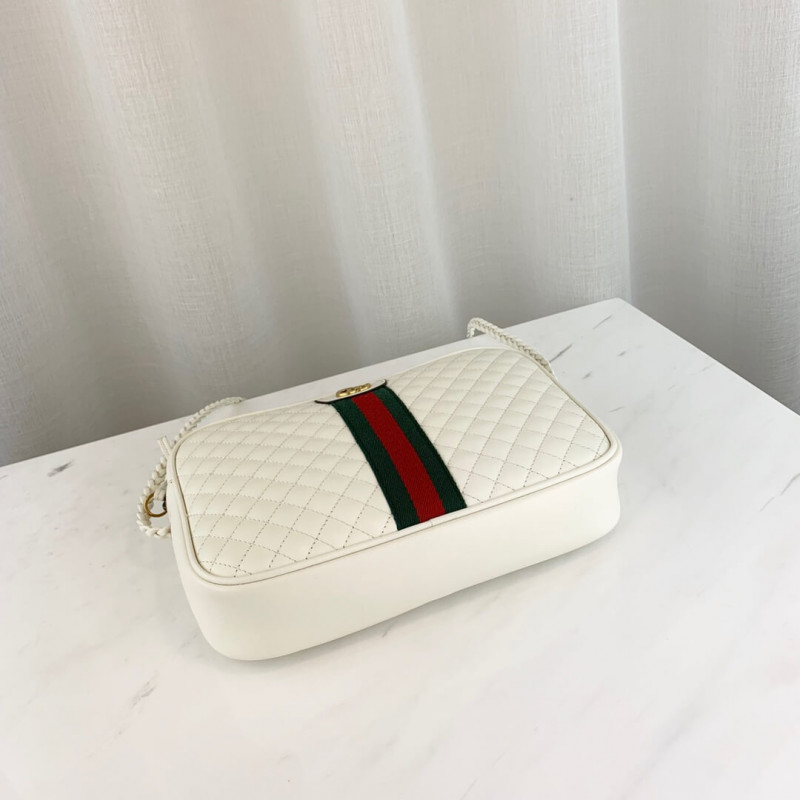 The small leather shoulder bag in quilted leather mixes a sportswear feel with distinctive emblems of the House. The shiny leather is contrasted with the traditional green and red Web stripe and Double G hardware.