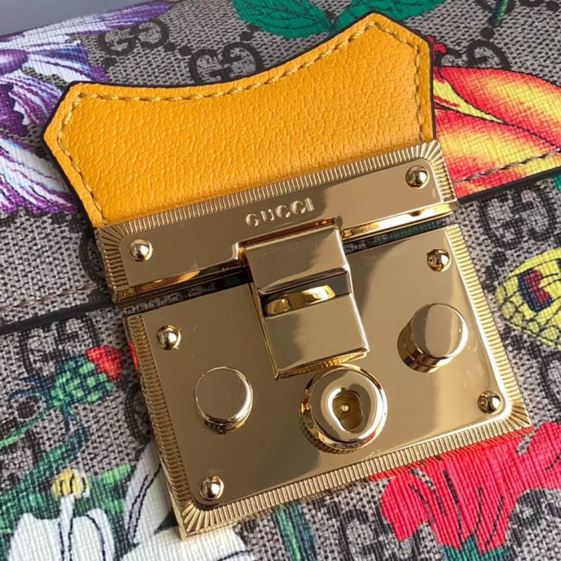 A special collection combines two of the House s most distinctive designs into an unexpected and contemporary fabric, animating classic silhouettes like the Padlock bamboo top handle shoulder bag. The historic Flora motif, first presented by Vittorio Accornero more than 50 years ago, is layered over the House monogram and trimmed with bright yellow leather for a modern take on the two archival patterns.