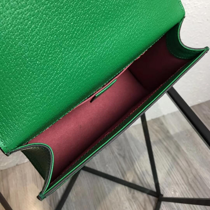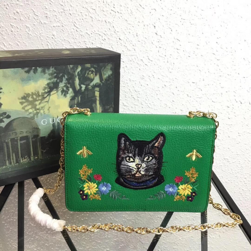 Colorful flowers from the Gucci Garden are embroidered along the silhouette of the leather shoulder bag. Embellished with the Double G hardware trimmed with glittering crystals, the bag features an embroidered Mystic Cat at the back—a surprising element that appears throughout the Cruise 2018 collection.