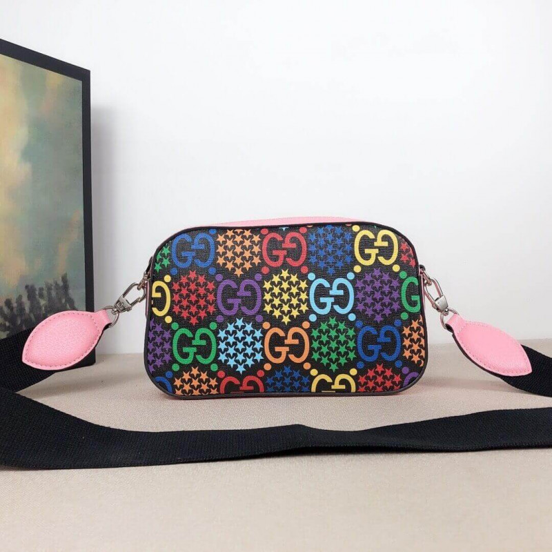 Gucci Messenger bag with black/grey soft GG Supreme with black leather trim, G- ucci trademark front leather tag detail, top zipped fastening, inner flat pocket, blu and red Web detachable shoulder strap.