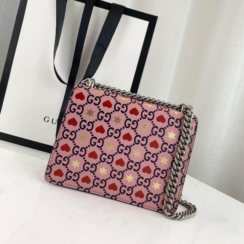 In celebration of Valentine s day, hearts and stars alternate with the GG motif on top of the mini Dionysus bag. The structured shape is finished with a textured tiger head spur closure embedded with Swarovski crystals—a defining detail of the line. The sliding chain strap can be worn multiple ways, changing between a shoulder and a top handle bag.
