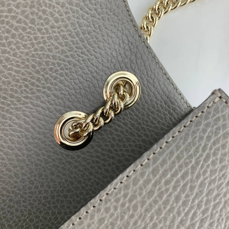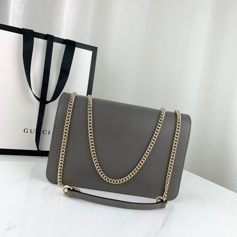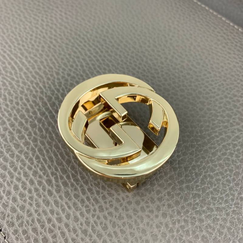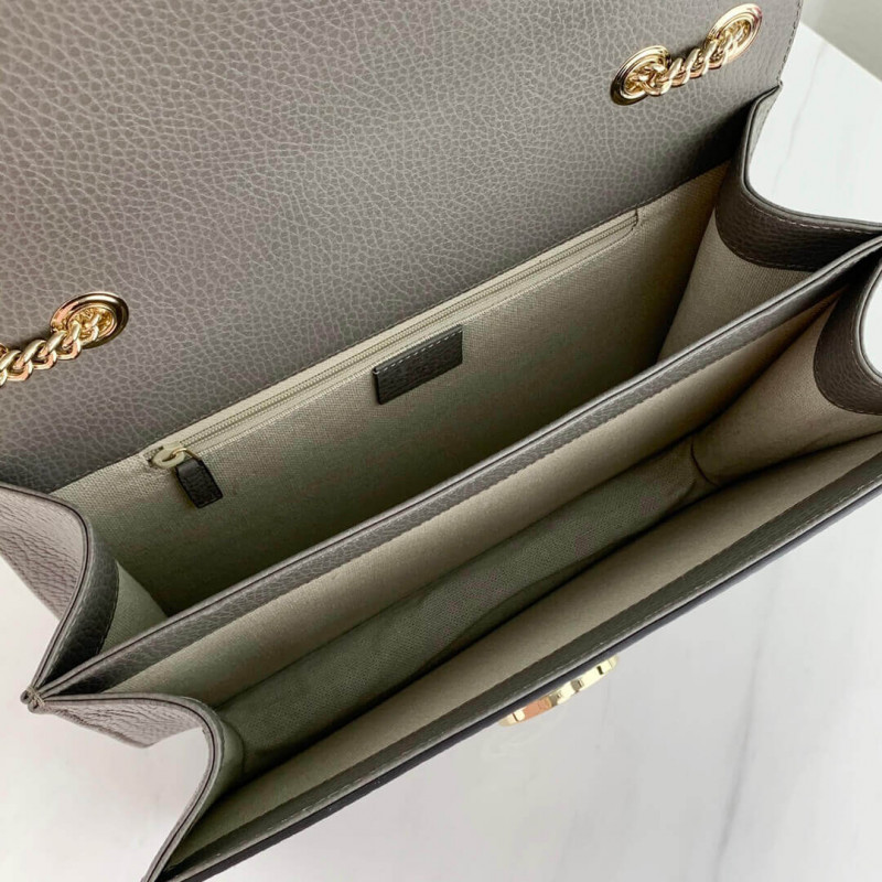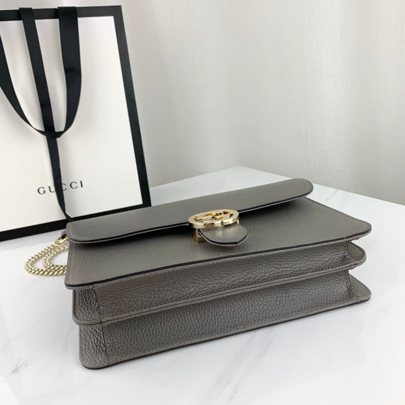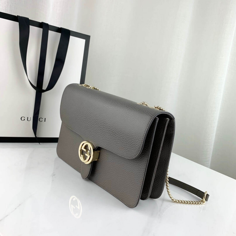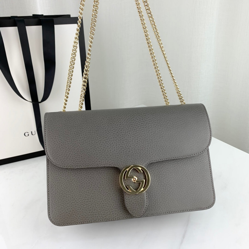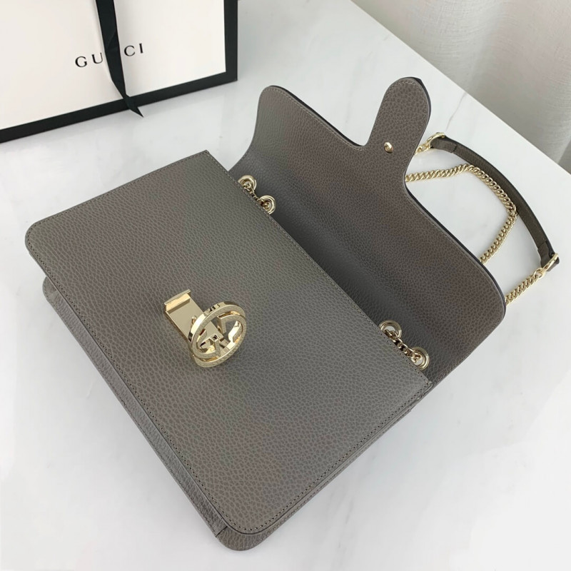 This chic shoulder bag is crafted of grained calfskin leather in pink. The bag has a waist length shoulder strap in gold and a facing flap with a polished gold interlocking GG emblem. The flap opens to a partitioned natural fabric interior with a zipper and patch pockets. This glamorous handbag radiates stylish sophistication from Gucci!