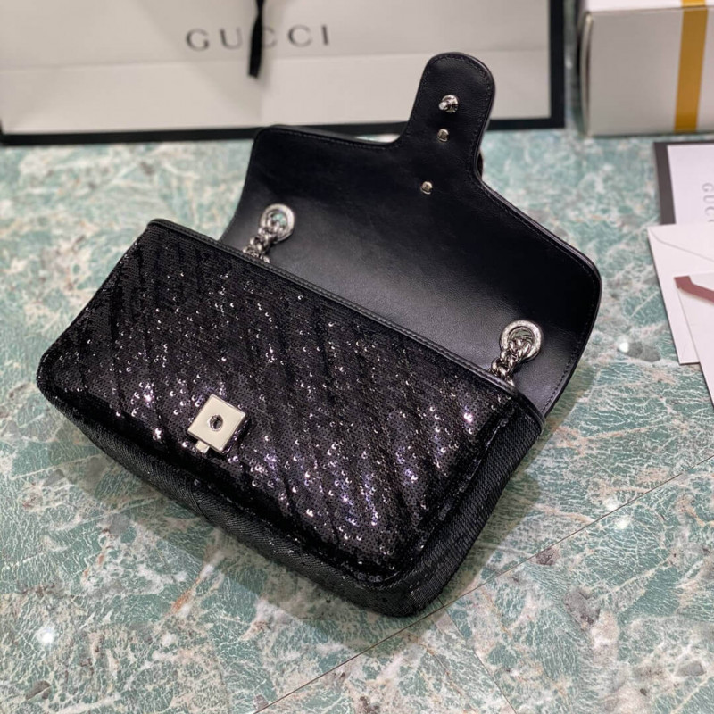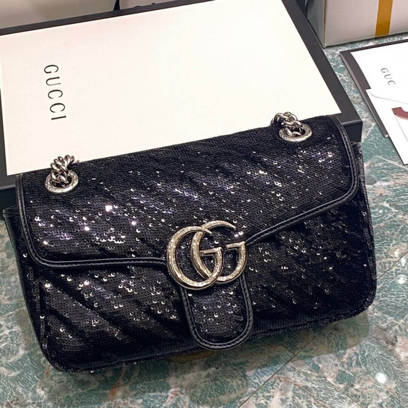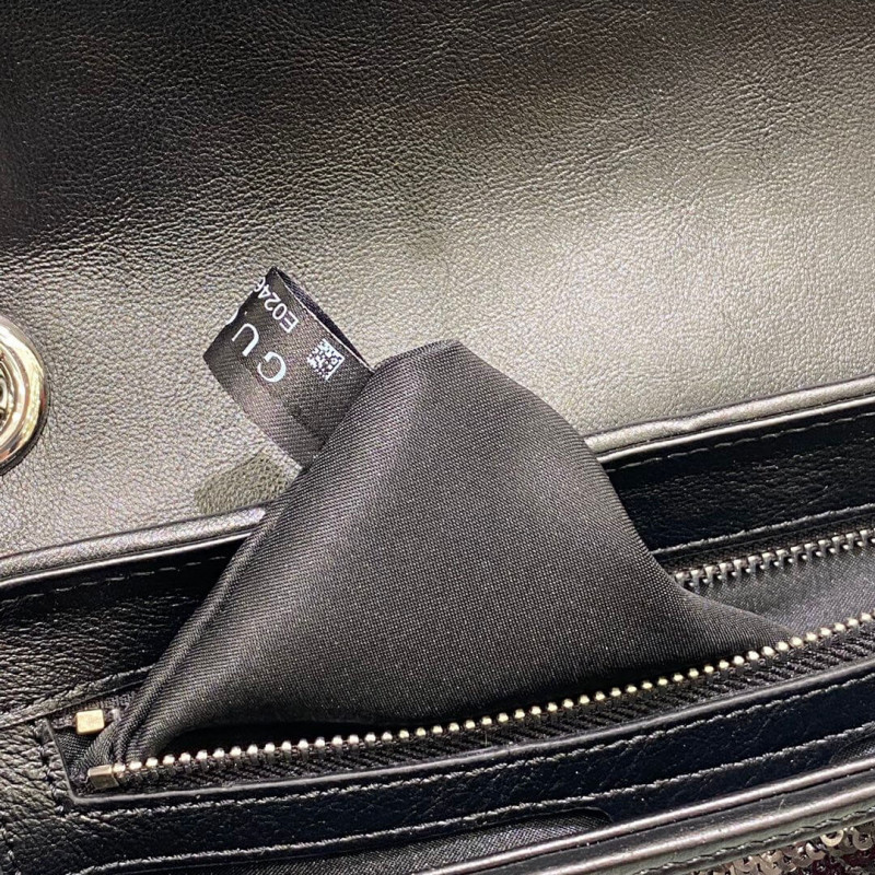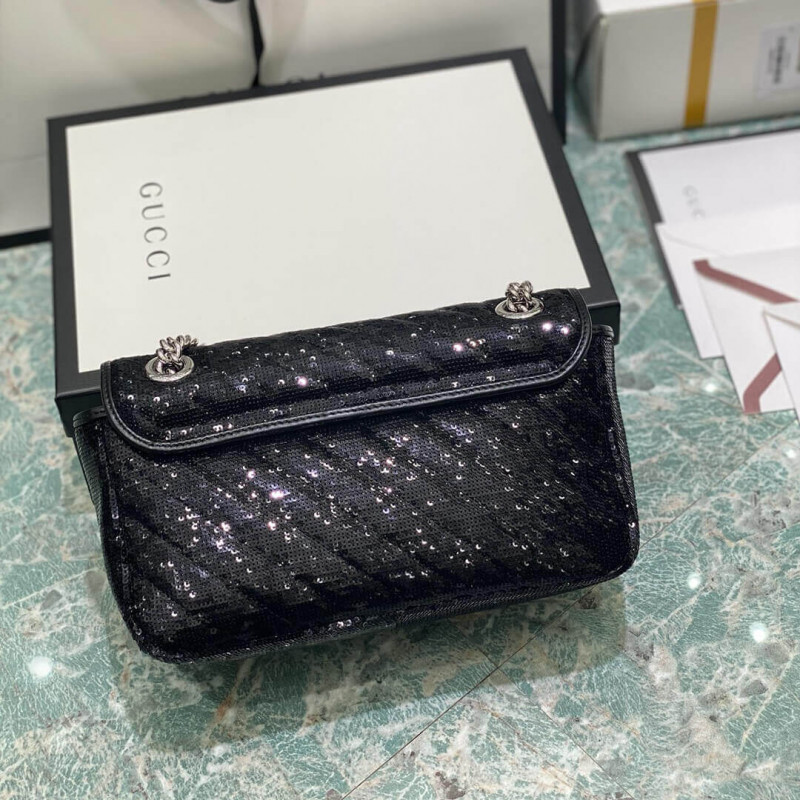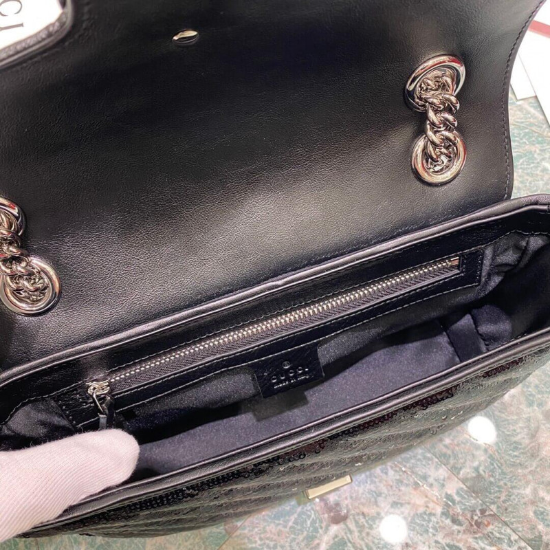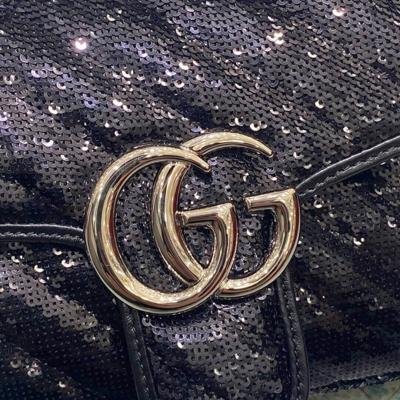 A message about leaving fashion’s old rules behind, Epilogue conveys the idea that pieces should be timeless–not just in fashion for one season. The collection highlights Alessandro Michele’s most emblematic styles and motifs from the past 5 years, like the GG Marmont. The recognizable design is presented in silver with shining sequins against a silk base. The small shoulder bag is completed by the recognizable Double G hardware.