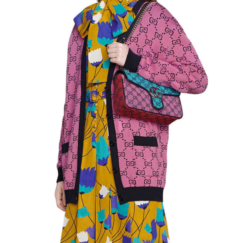 Embracing the new possibilities that lie within variations of the Gucci archives, various pieces throughout the collection provide a new lens through which to view the emblematic GG rhombi motif. Already an evolution of the House logo, it is once again reimagined in a series of bright colours—a theme that has become synonymous with the Creative Director’s vision. This GG Marmont small shoulder bag has an adjustable strap and is part of the GG Multicolour collection.
