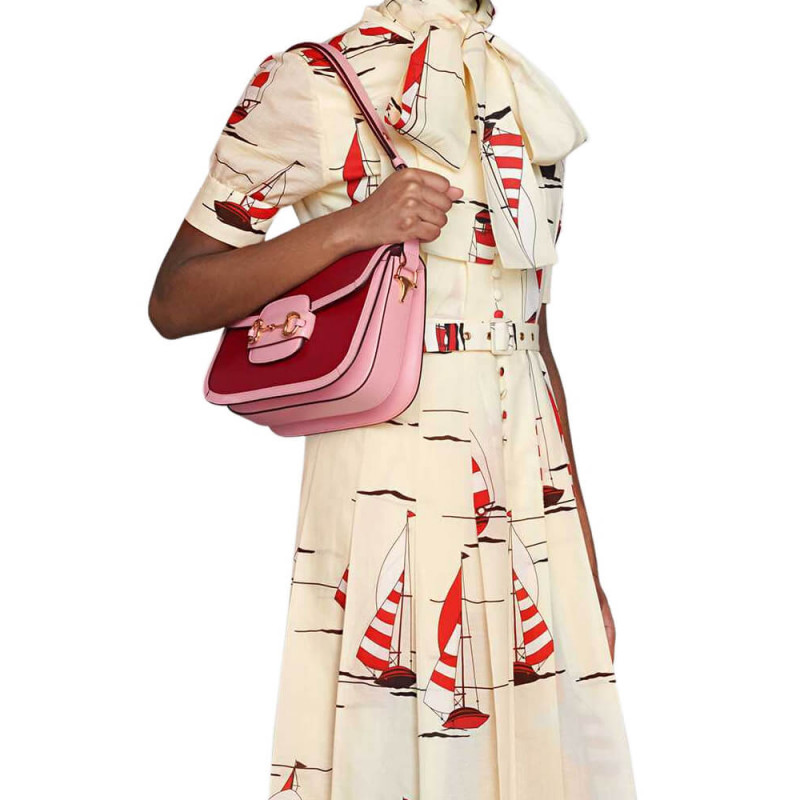 A part of the House s Beloved lines, the Gucci Horsebit 1955 s signature namesake hardware is complemented by ruby toned leather with a pastel pink trim. Jewel tones appear throughout the Ouverture collection, linking the lines dear to the Hose with precious stones and gems.