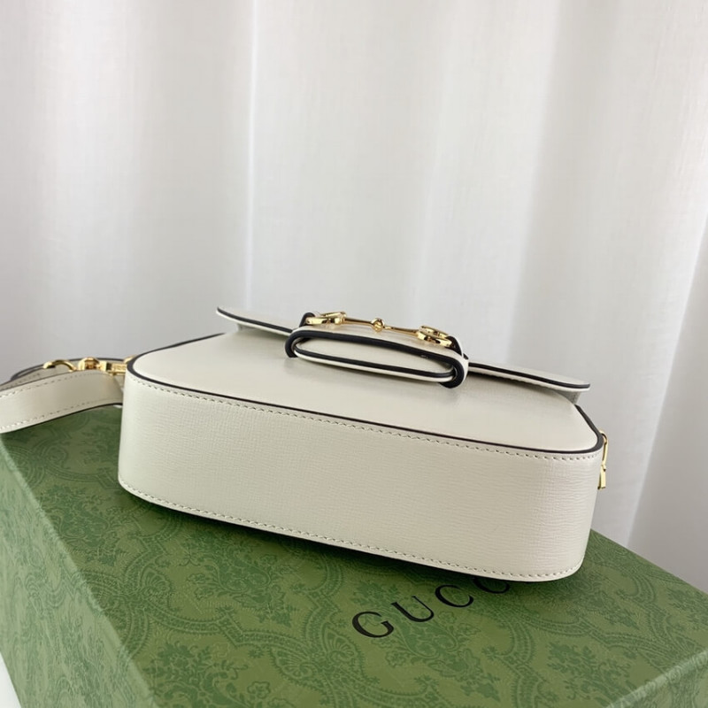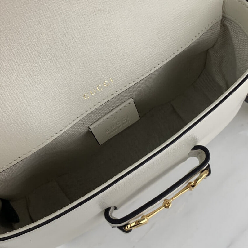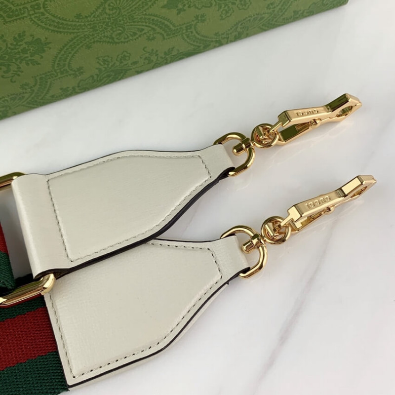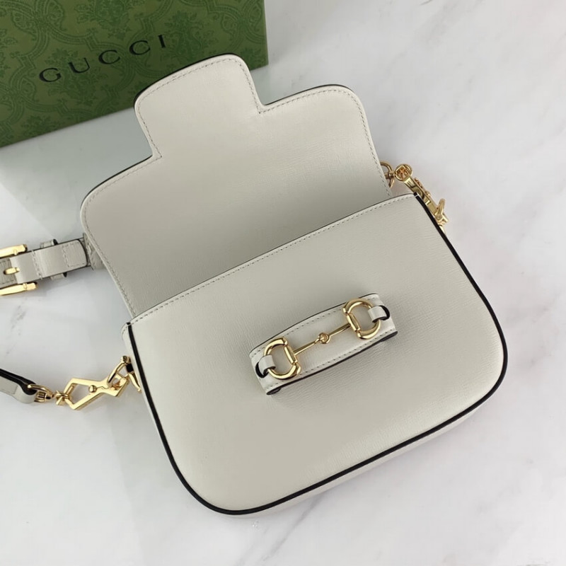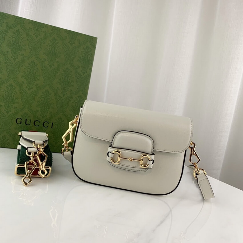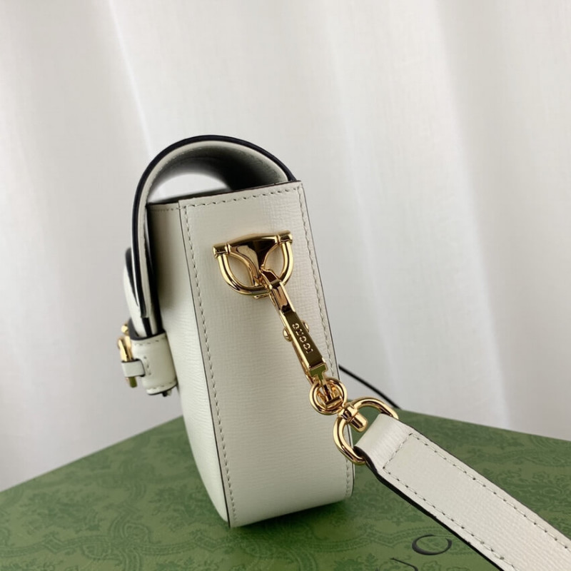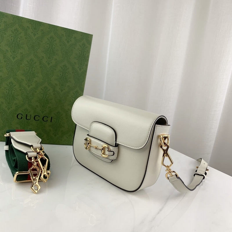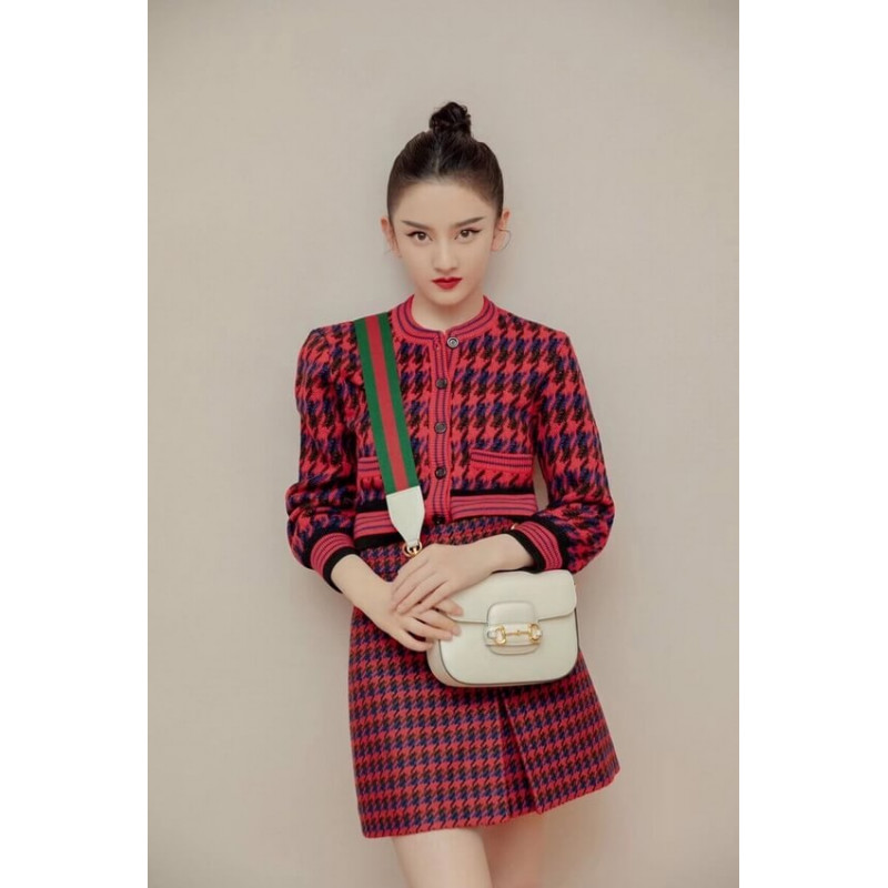 Petite versions of the Gucci Horsebit 1955 add a hybrid twist to the vintage inspired line. Enriched with two different shoulder straps, the mini bag’s character transforms from understated elegance with a tonal leather strap to a strong logo feel thanks to a red and green Web option. The accessory is presented in monogram canvas with a brown leather trim.